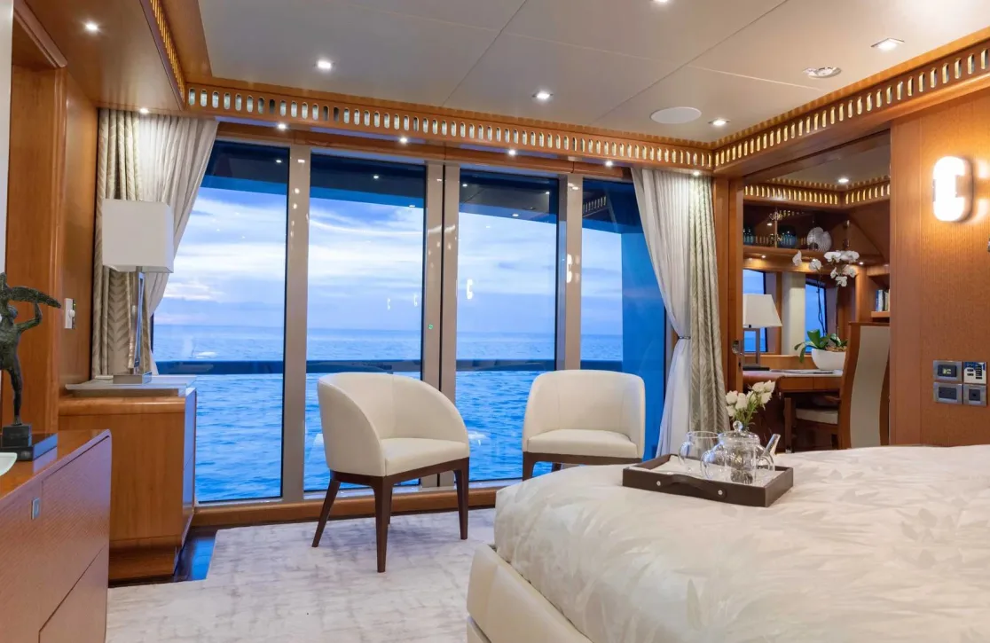 With accommodations for up to 12 guests, Serenity offers a tranquil escape with its six beautifully appointed cabins. Awaken to the gentle sway of the ocean in the master suite, a full-beam sanctuary featuring a king-size bed and a luxurious his-and-her bathroom. Each cabin, from the VIP to the adaptable twin/double options, is a haven of rest, combining elegant design with absolute comfort. Every detail has been meticulously considered, ensuring your nights at sea are as restful as your days are invigorating.