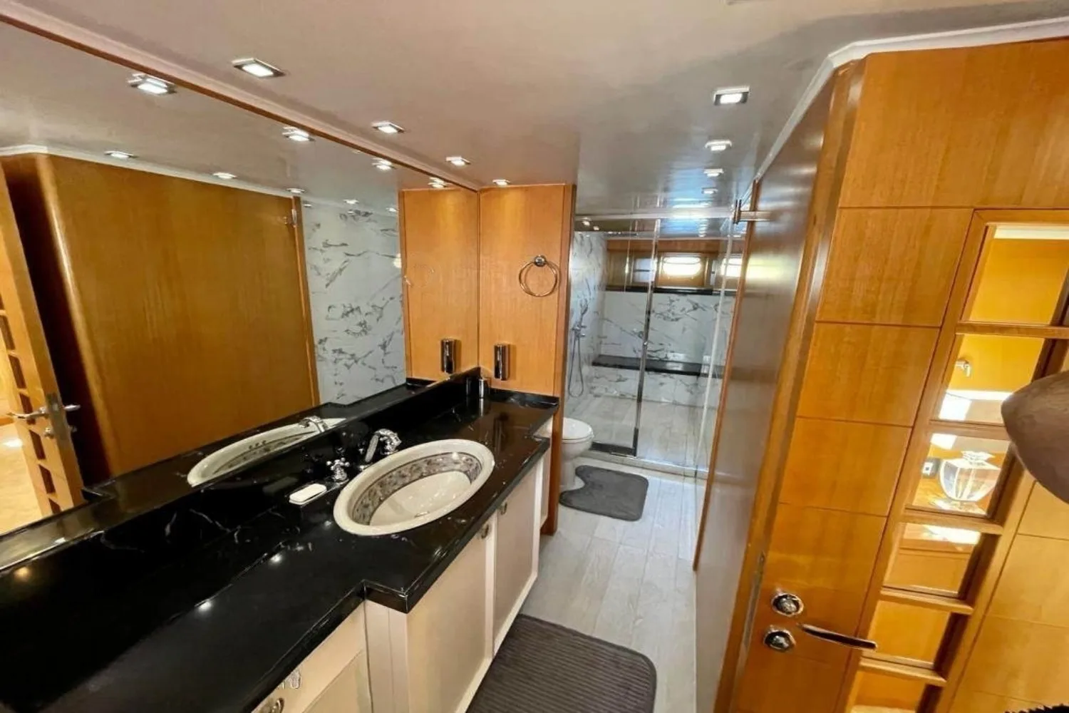 The accommodations aboard Seven promise a sanctuary of serenity and style, with four immaculate cabins designed to host up to eight guests. Awaken each morning to the gentle lull of the sea in the opulent master suite, where comfort reigns supreme. Additional guest cabins, including a double and twin cabin, offer plush bedding configurations that ensure restful nights and vibrant days. With the thoughtful design of one queen, one double, and two single beds, each space becomes a personal retreat where the elegance of the yacht envelops you in tranquility.