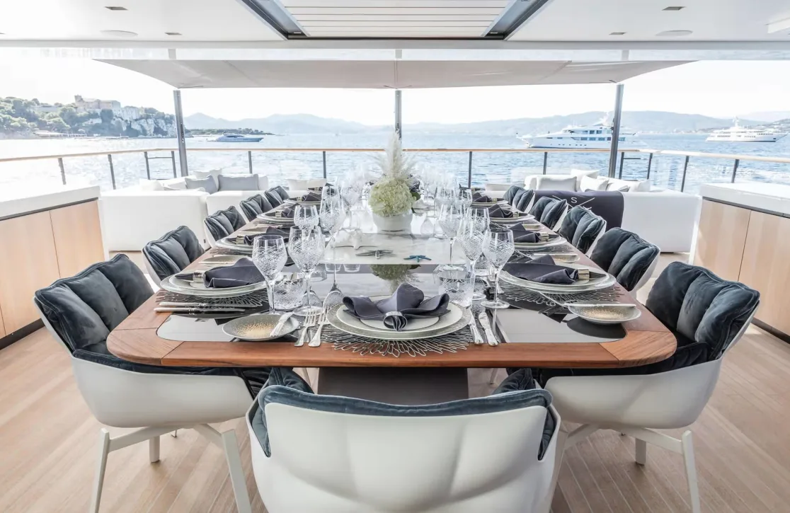 Severin’s seamlessly blends sophisticated style with modern amenities to create an idyllic retreat at sea. The sun deck, with its inviting sunpads and an outdoor bar, provides a perfect setting for mingling and unwinding. Guests can indulge in the spa or maintain their fitness regime in the fully equipped gym, while the swimming pool offers a refreshing escape. The onboard elevator ensures seamless movement across decks, allowing you to effortlessly transition from the sunlit terraces to the tranquil interiors, all while staying connected with Wi-Fi and entertained with satellite TV.