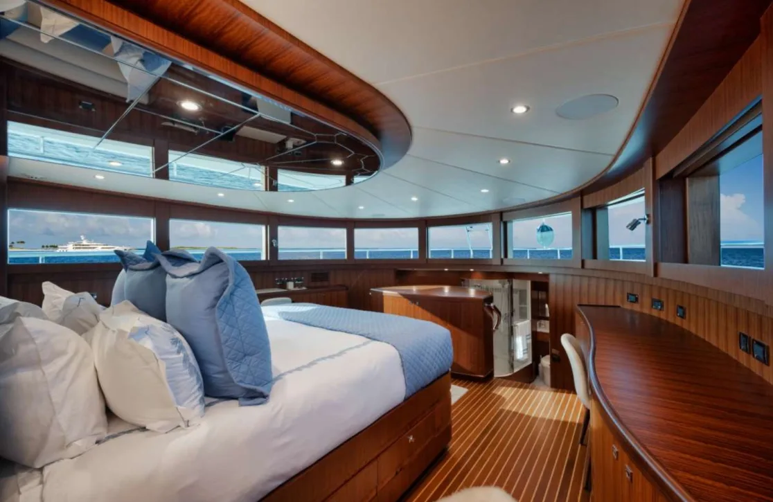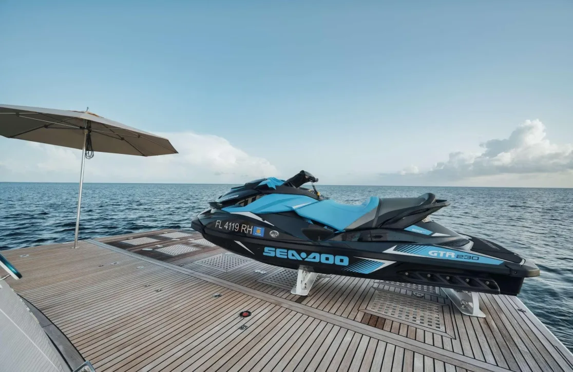 Indulge in the art of leisure as you stroll through ‘She’s A Peach’s’ thoughtfully designed spaces. The sun deck beckons for sunlit afternoons, where plush sunpads provide the perfect perch to soak in the views. As evening falls, the outdoor bar becomes the social hub, offering a curated selection of cocktails under a starlit sky. The tender garage cleverly conceals the means for spontaneous adventures, while the air-conditioned interiors provide a cool retreat. Every detail is crafted to enhance comfort, ensuring your time aboard is as refreshing as it is engaging.