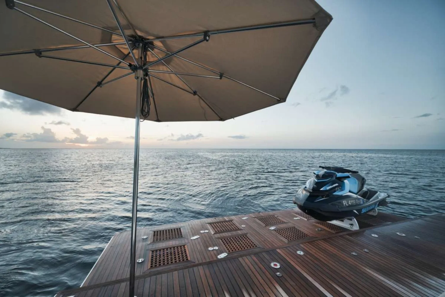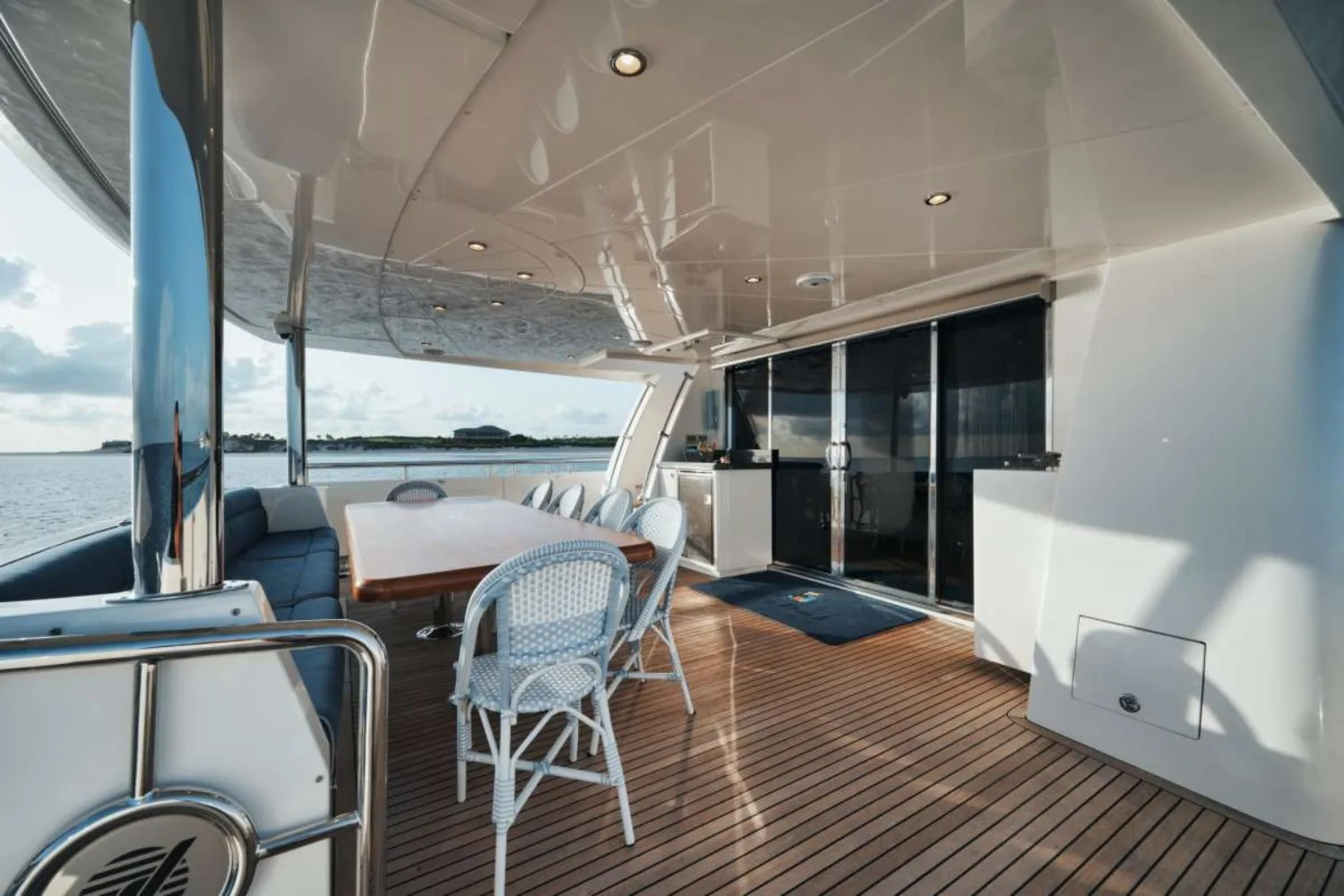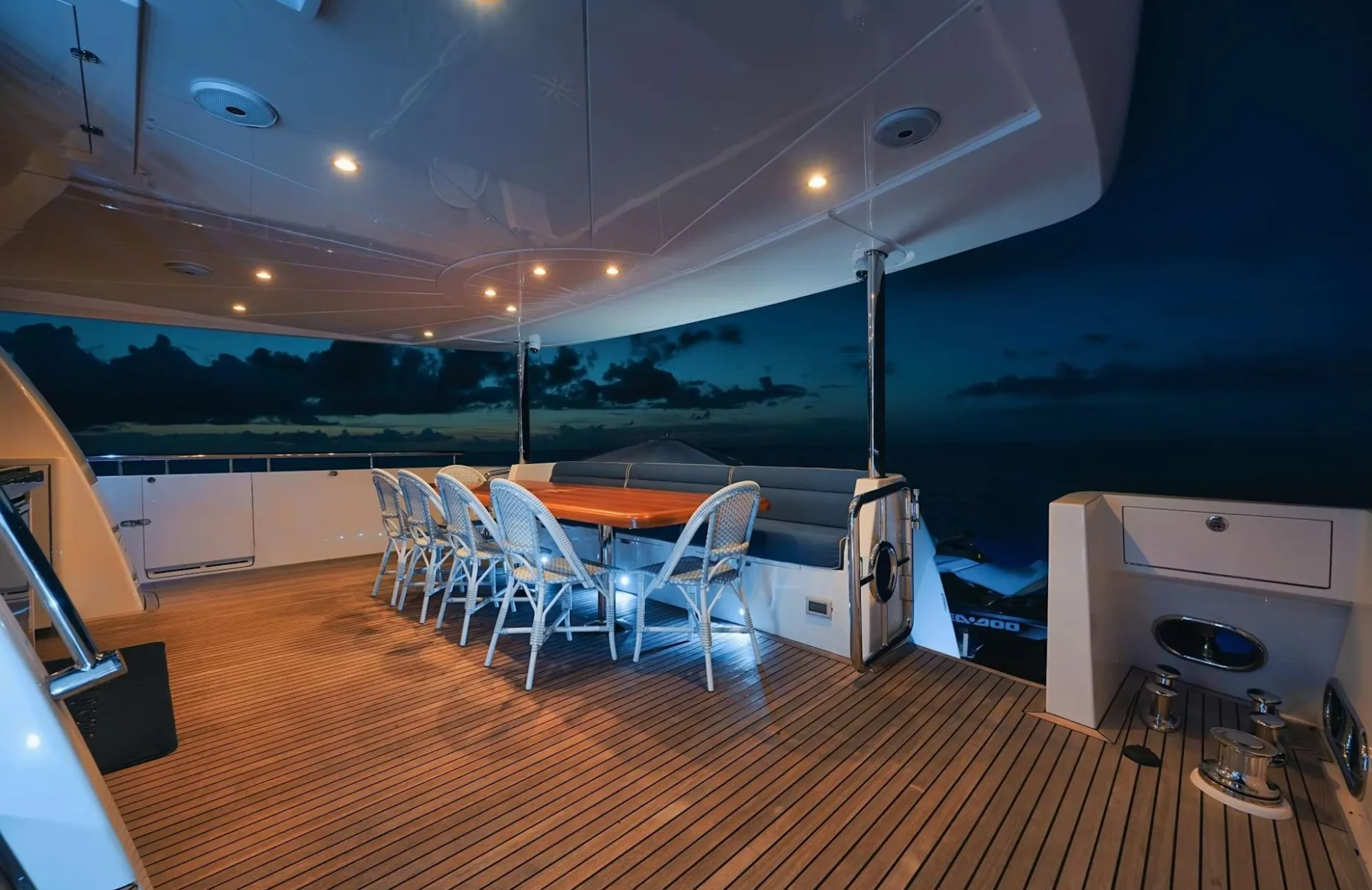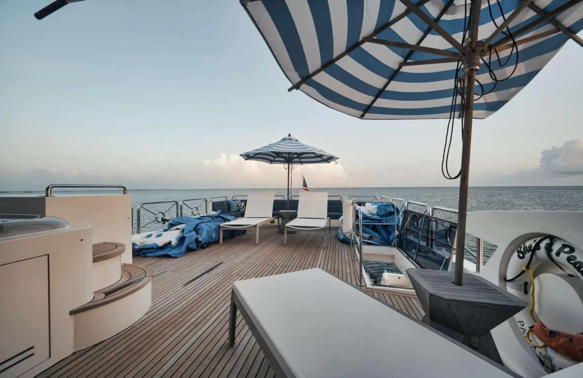Indulge in the art of leisure as you stroll through ‘She’s A Peach’s’ thoughtfully designed spaces. The sun deck beckons for sunlit afternoons, where plush sunpads provide the perfect perch to soak in the views. As evening falls, the outdoor bar becomes the social hub, offering a curated selection of cocktails under a starlit sky. The tender garage cleverly conceals the means for spontaneous adventures, while the air-conditioned interiors provide a cool retreat. Every detail is crafted to enhance comfort, ensuring your time aboard is as refreshing as it is engaging.