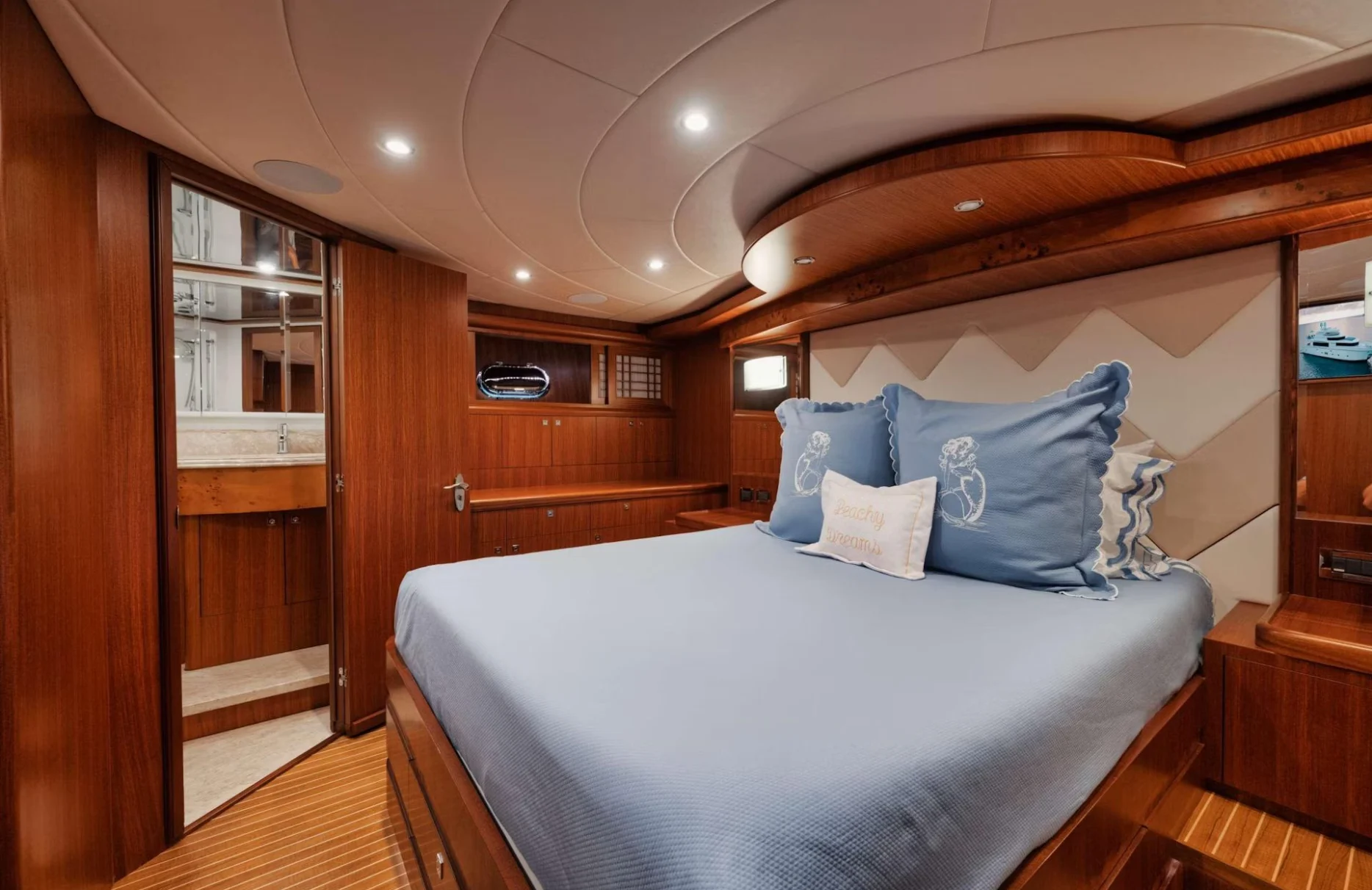 Aboard ‘She’s A Peach’, ten guests find their sanctuary within five elegantly appointed cabins. The master suite offers a private haven with expansive views, while the VIP cabin and two double cabins promise restful nights and peaceful mornings. The twin cabin caters to additional guests, each space thoughtfully designed to reflect the yacht’s refined aesthetic. As dawn breaks, awaken to the gentle lull of the sea, enveloped in tranquility and the promise of another day filled with discovery and delight.