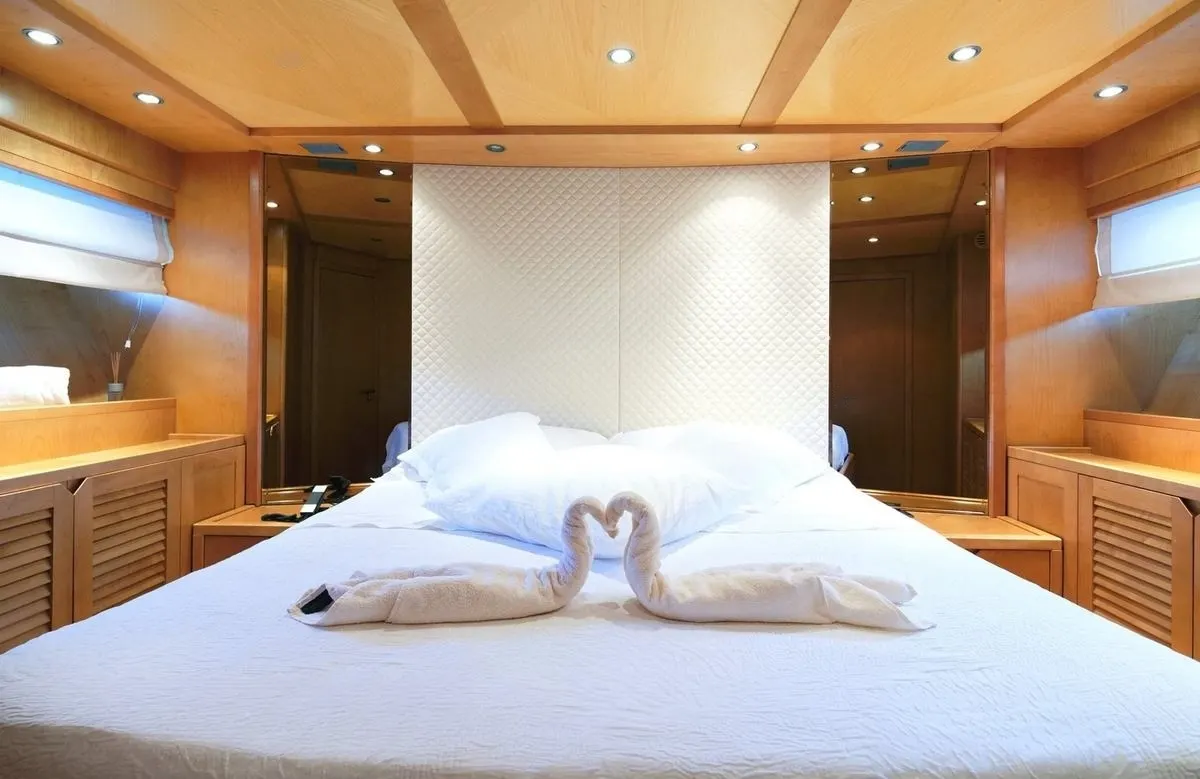 Silvia’s interior spaces are a harmonious blend of style and comfort, where mid-century modern design meets contemporary flair. As the day unfolds, the sunpads and loungers beckon for sun-drenched relaxation, while the spacious flybridge is the perfect setting for evening gatherings under the stars. Stay connected with loved ones or stream your favorite shows with on-board Wi-Fi and satellite TV, ensuring entertainment and connectivity even as you drift far from shore. The swimming platform offers a seamless transition from yacht to sea, inviting spontaneous dips in the crystalline waters.