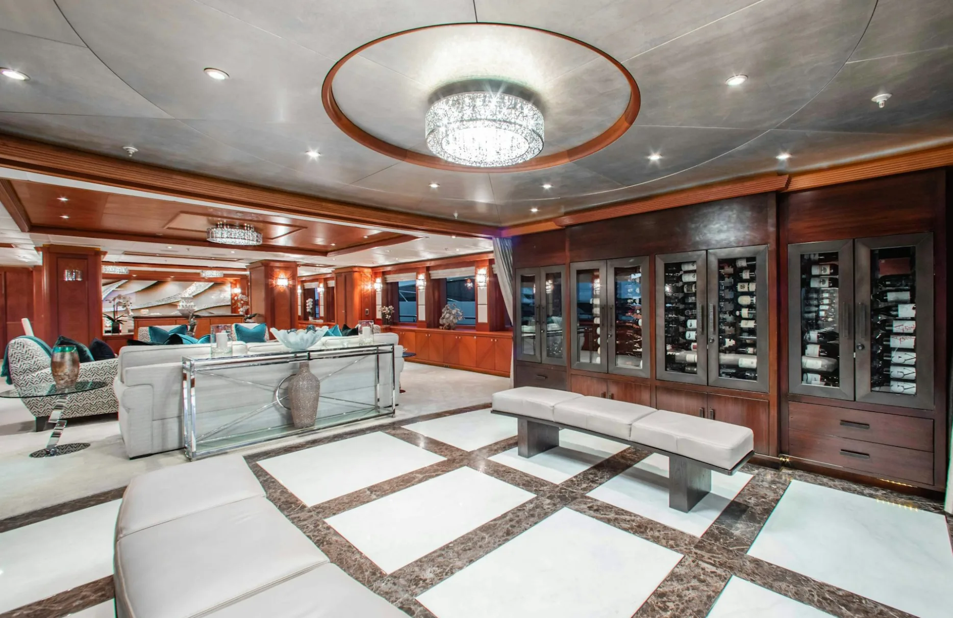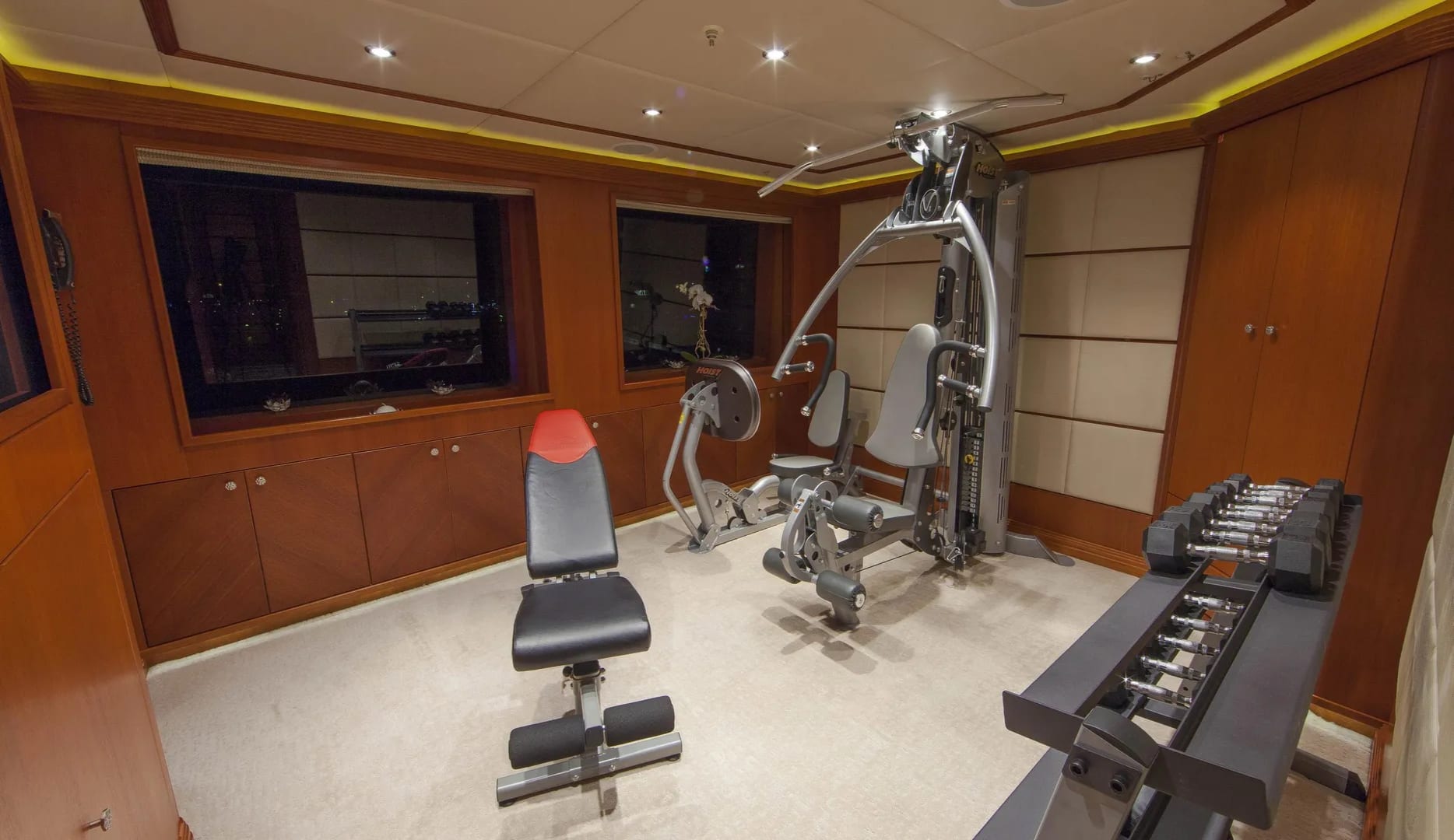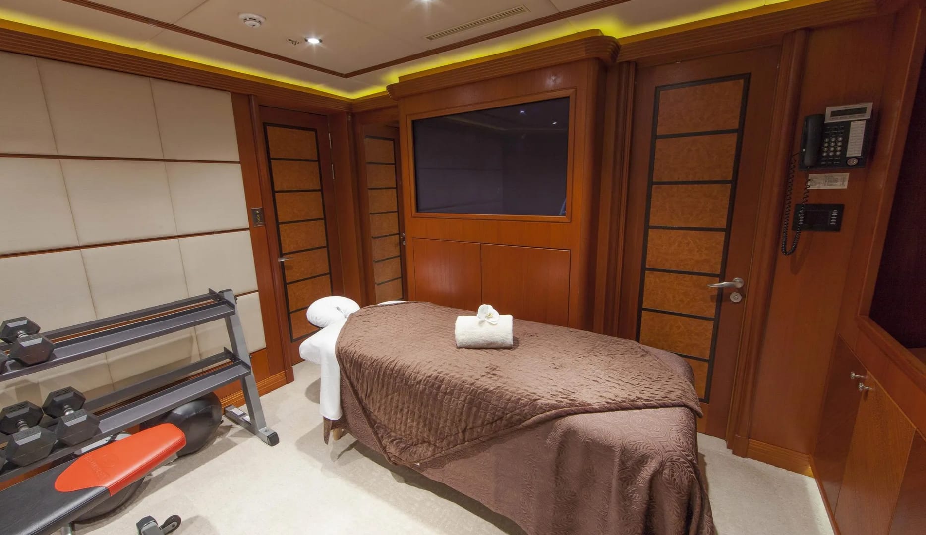 Step into a world where every detail is designed for your comfort and enjoyment. Skyfall’s inviting spaces are equipped with Wi-Fi and a state-of-the-art video-on-demand system, ensuring connectivity and entertainment are always at your fingertips. The sun deck, with its jacuzzi and sun pads, becomes a blissful retreat under the sun, while the sky lounge, featuring an enchanting Tiger’s Eye bar, offers a perfect setting for evening relaxation. For those who seek physical wellness, a well-appointed gym awaits to invigorate your senses. With at-anchor and underway stabilizers, every moment aboard is smooth and serene.