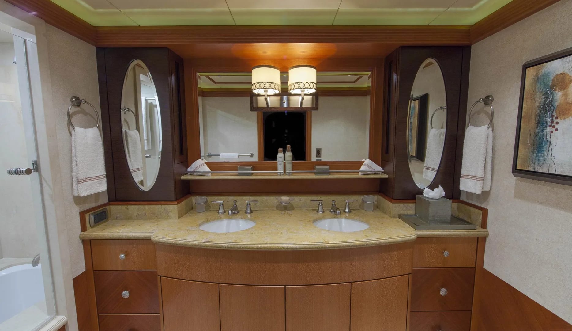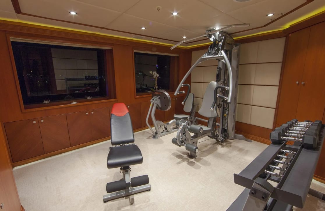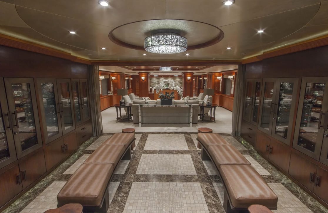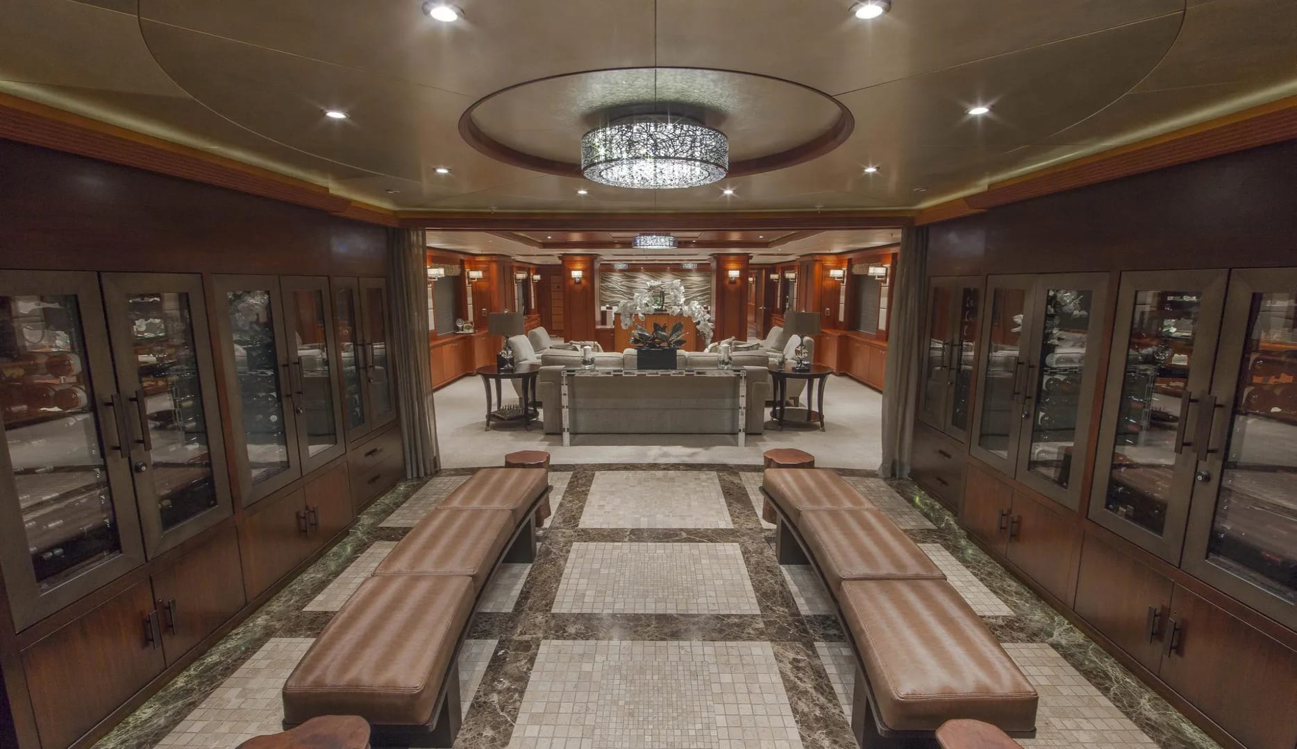 Step into a world where every detail is designed for your comfort and enjoyment. Skyfall’s inviting spaces are equipped with Wi-Fi and a state-of-the-art video-on-demand system, ensuring connectivity and entertainment are always at your fingertips. The sun deck, with its jacuzzi and sun pads, becomes a blissful retreat under the sun, while the sky lounge, featuring an enchanting Tiger’s Eye bar, offers a perfect setting for evening relaxation. For those who seek physical wellness, a well-appointed gym awaits to invigorate your senses. With at-anchor and underway stabilizers, every moment aboard is smooth and serene.