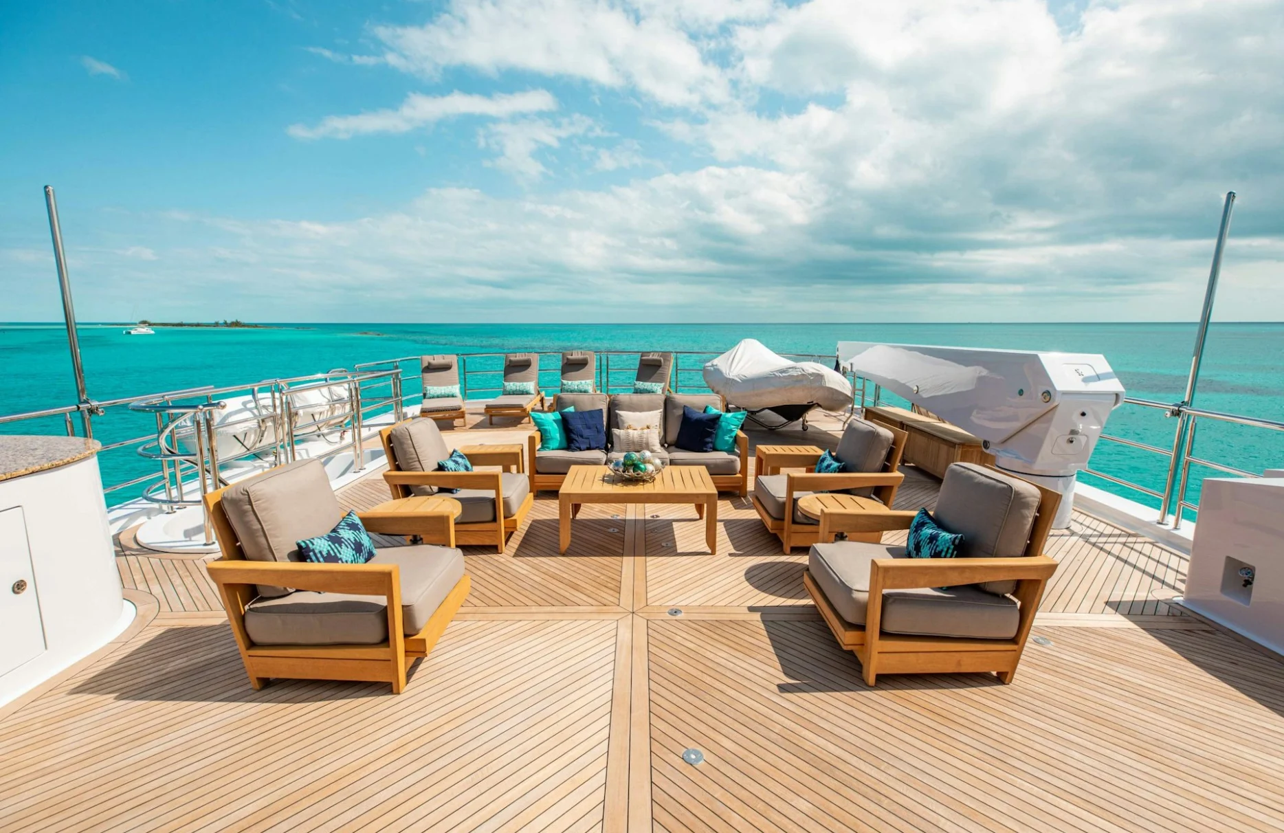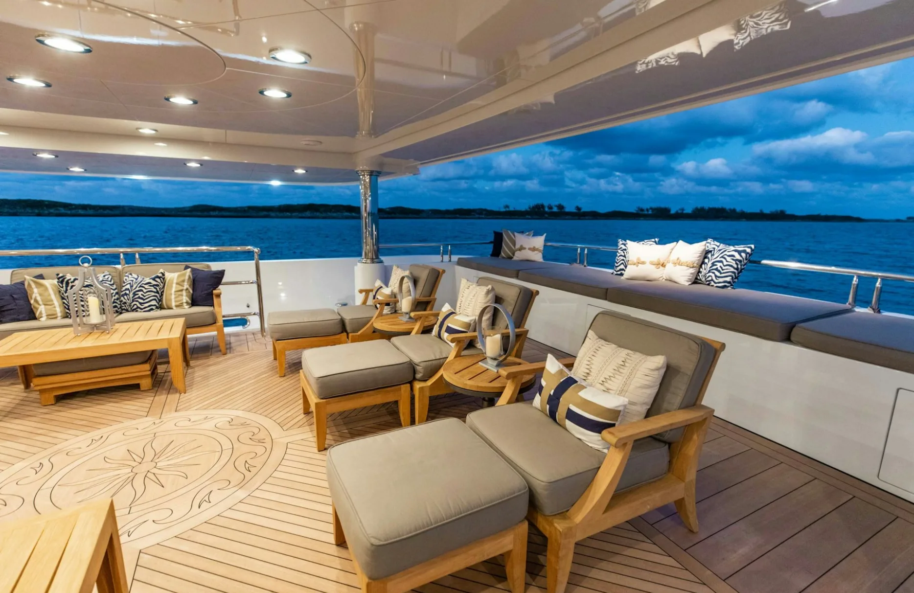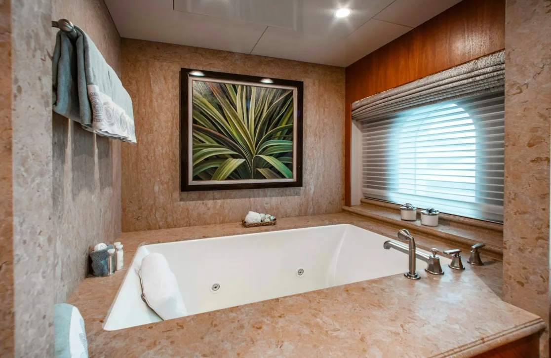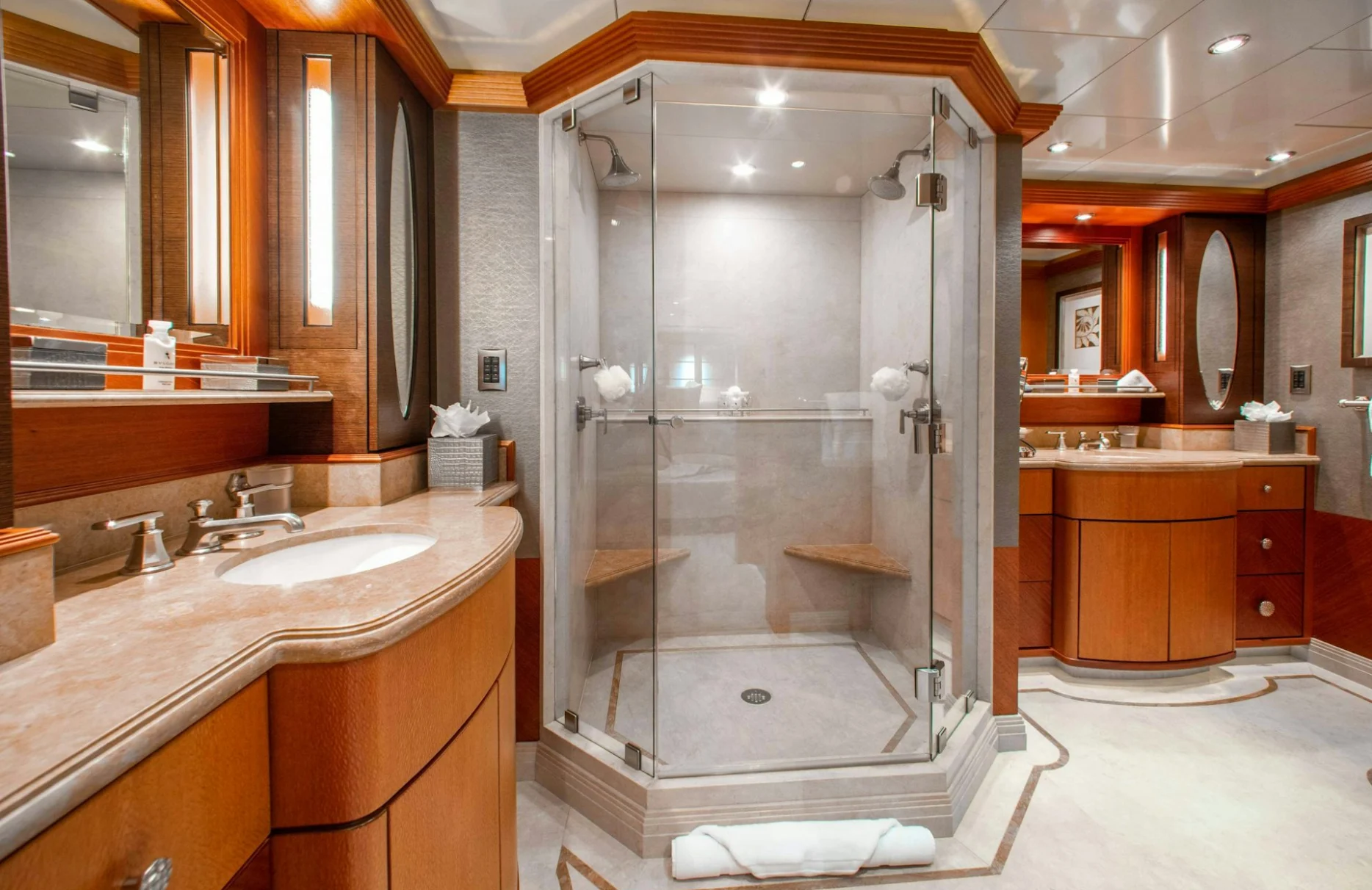 Onboard, Skyfall is a sanctuary of tranquility and sophistication, her interiors curated by Patrick Knowles to reflect an urban contemporary style infused with Zen elements. With exotic woods and etched glass, every space invites relaxation and social connection. Whether savoring an alfresco meal on the raised aft deck or enjoying the sundeck’s hot tub, each moment becomes a cherished memory. A shallow draft allows her to access exclusive, shallow waters, opening up a realm of exploration that few can access. This is the epitome of cruising elegance.