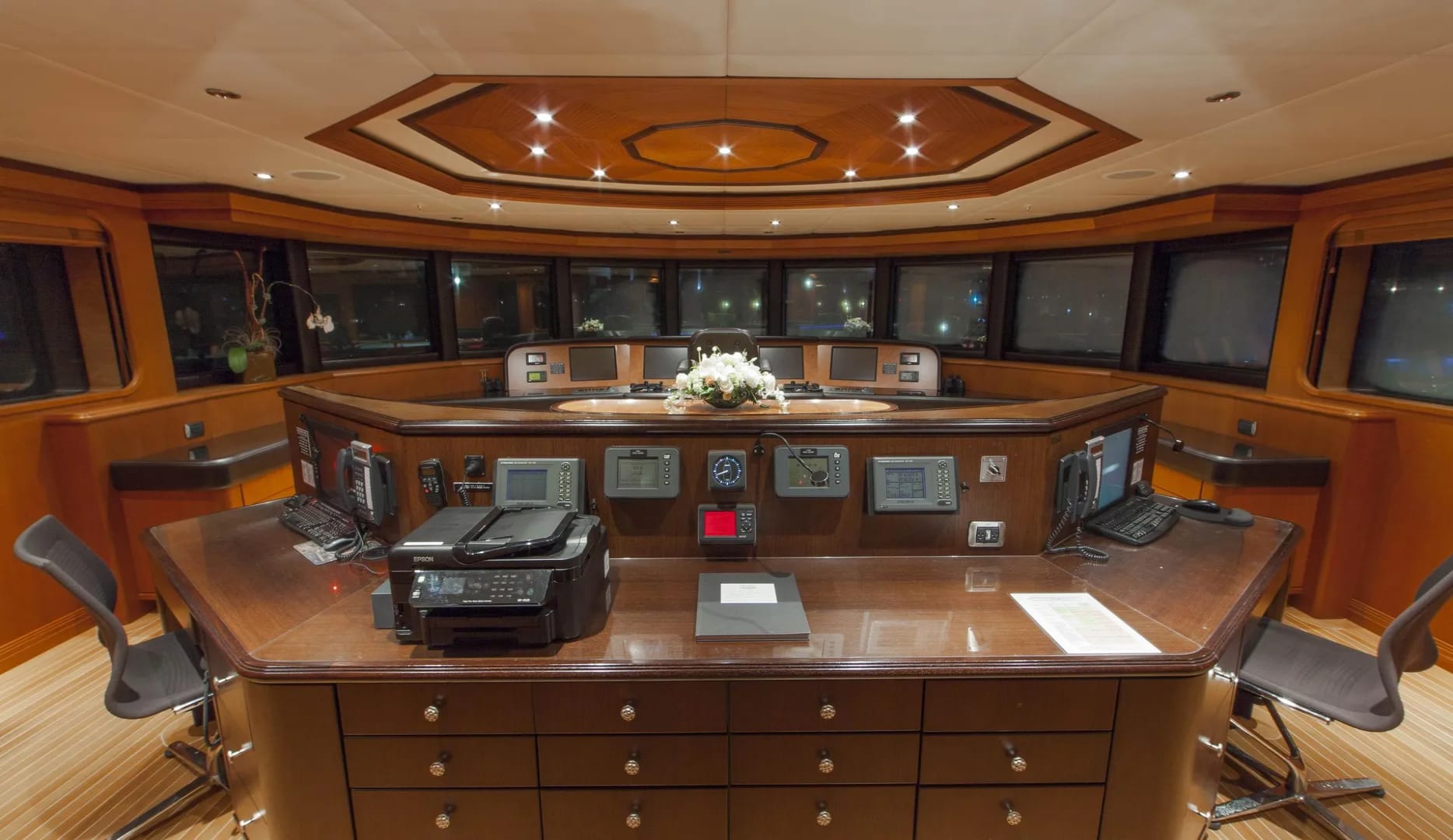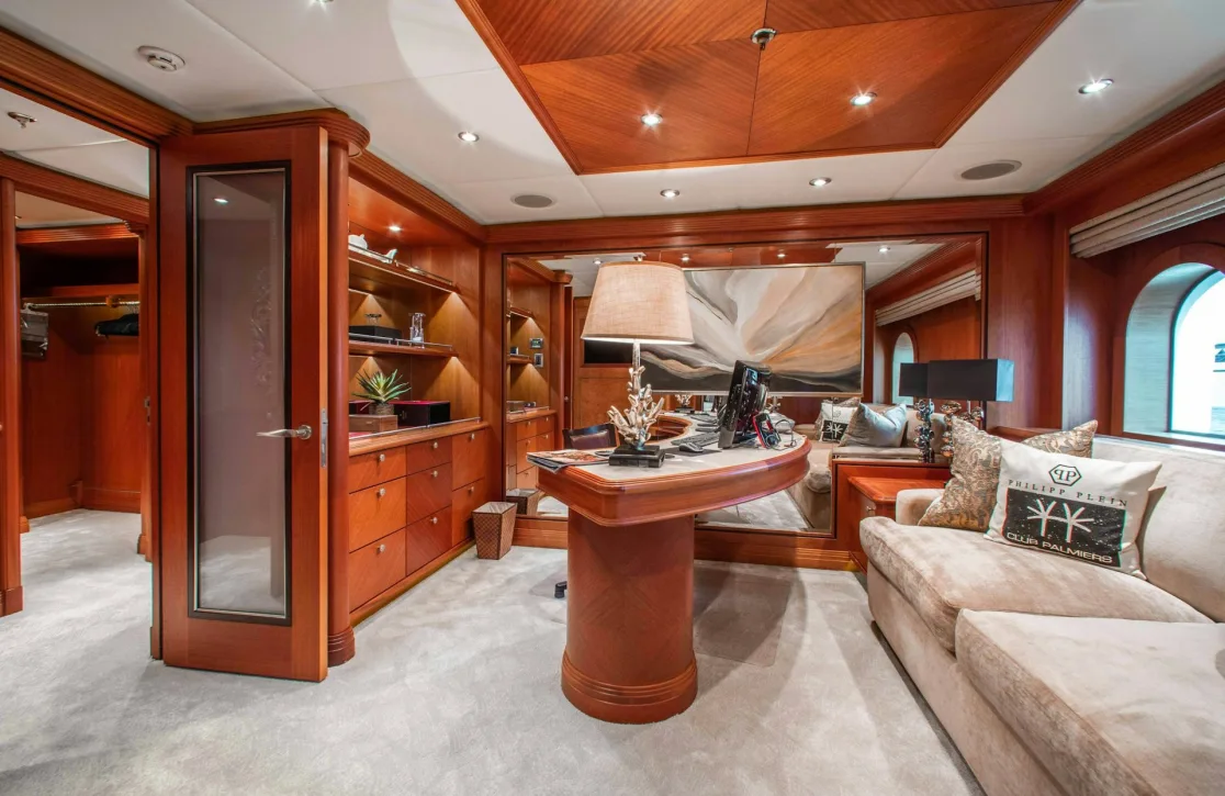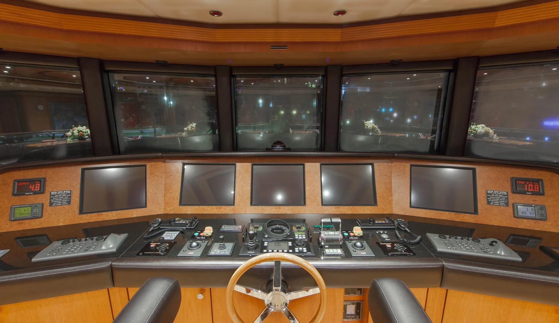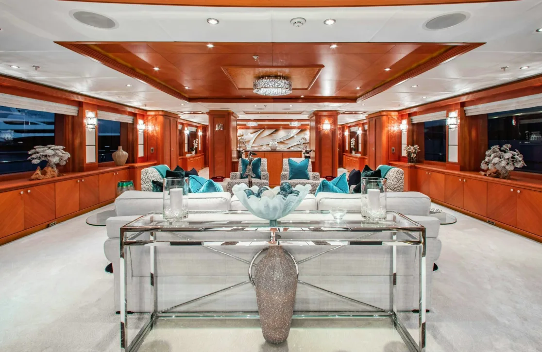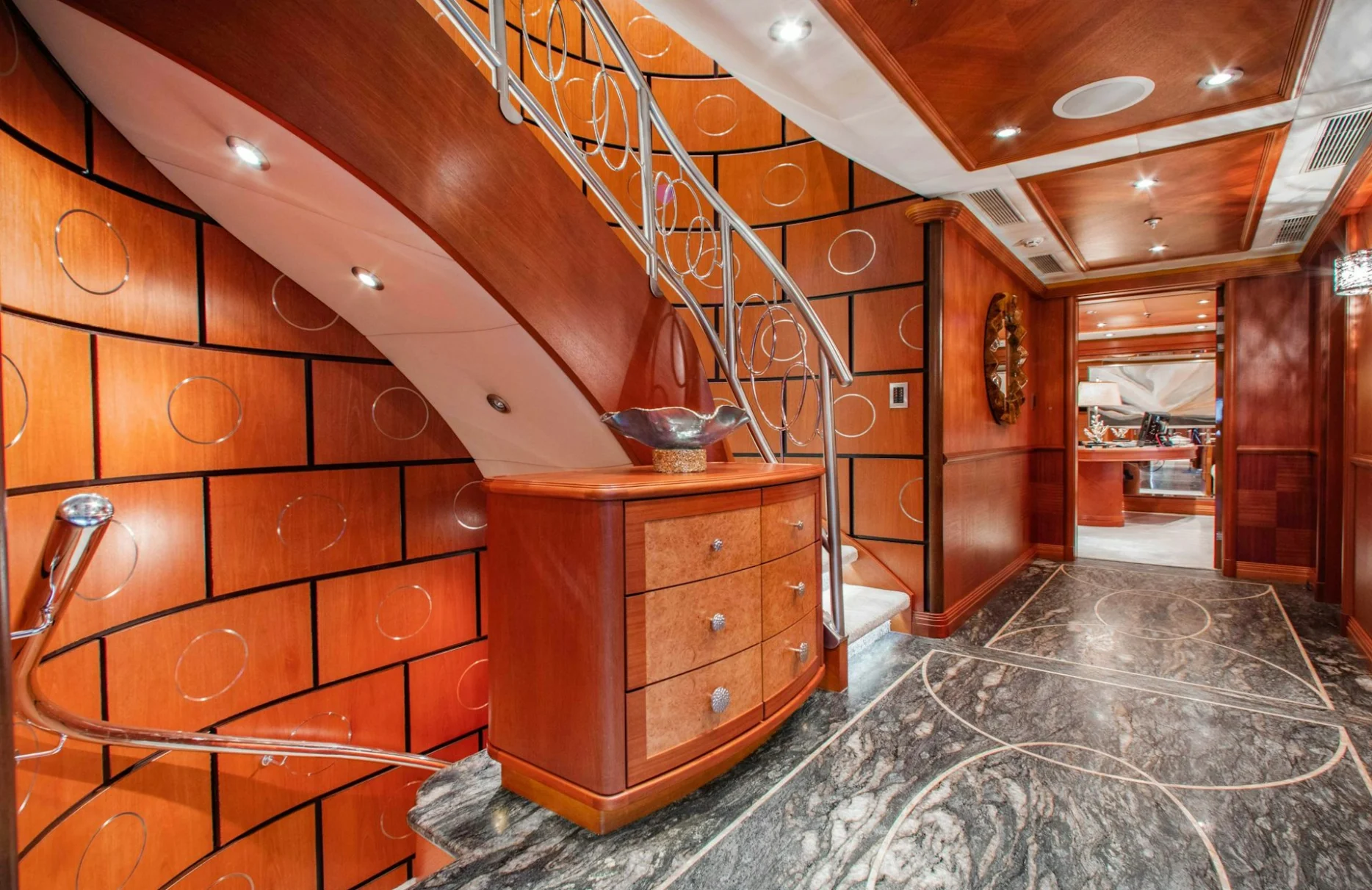 Onboard, Skyfall is a sanctuary of tranquility and sophistication, her interiors curated by Patrick Knowles to reflect an urban contemporary style infused with Zen elements. With exotic woods and etched glass, every space invites relaxation and social connection. Whether savoring an alfresco meal on the raised aft deck or enjoying the sundeck’s hot tub, each moment becomes a cherished memory. A shallow draft allows her to access exclusive, shallow waters, opening up a realm of exploration that few can access. This is the epitome of cruising elegance.