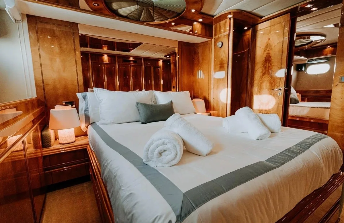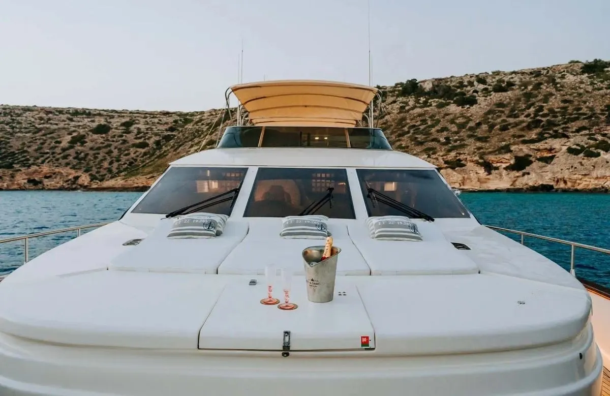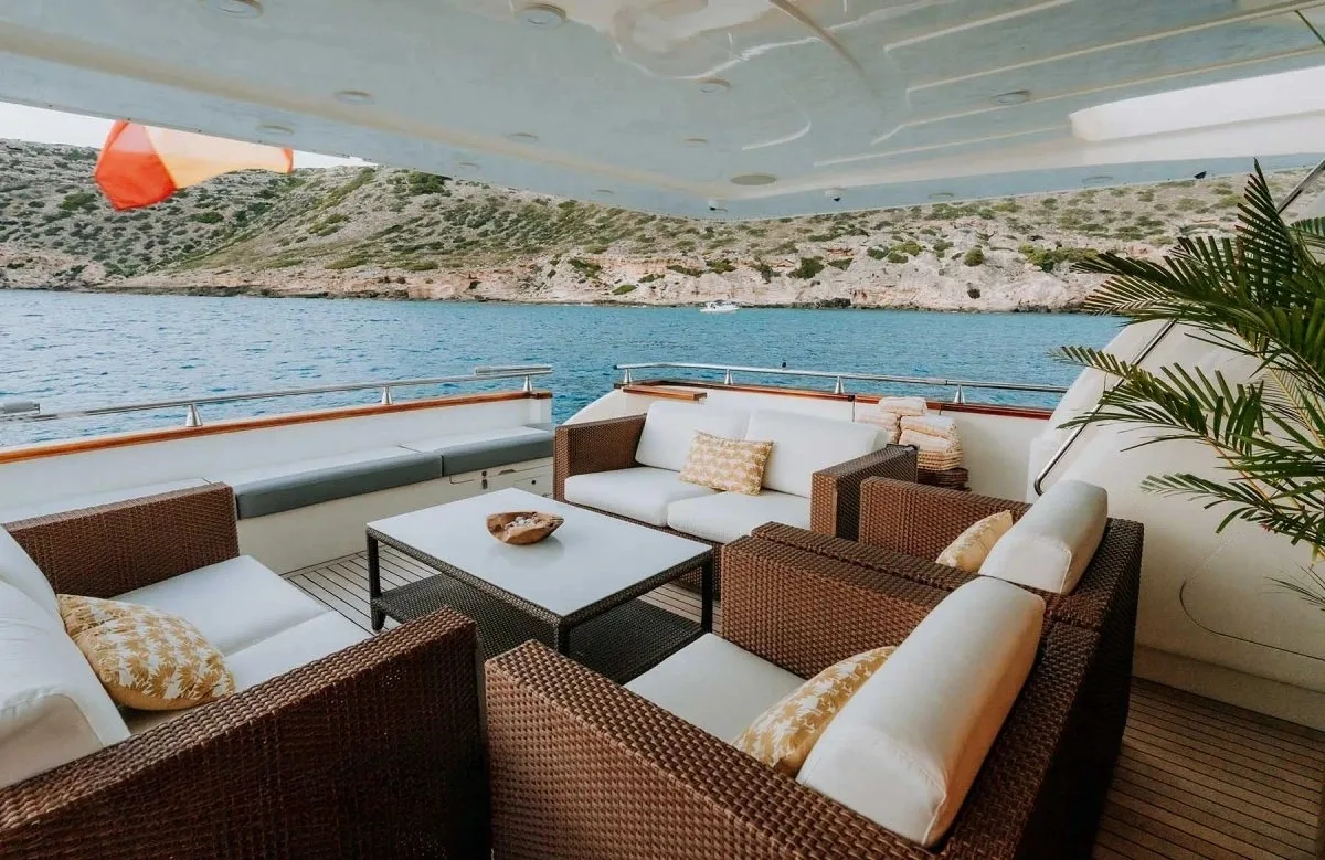 Aboard Sonrisa Septimo, every moment feels like a cherished memory in the making. The spacious sun deck beckons you to unwind under the Mediterranean sun, while the inviting sun pads offer the perfect spot to relax with a good book or take in the stunning views. Inside, the yacht’s air-conditioned interiors provide a cool respite, adorned with cream-colored upholstery and rich wood accents that create a serene yet refined atmosphere. Stay connected with Wi-Fi as you enjoy the seamless blend of indoor and outdoor luxury, whether it’s an intimate gathering or an evening of entertainment.