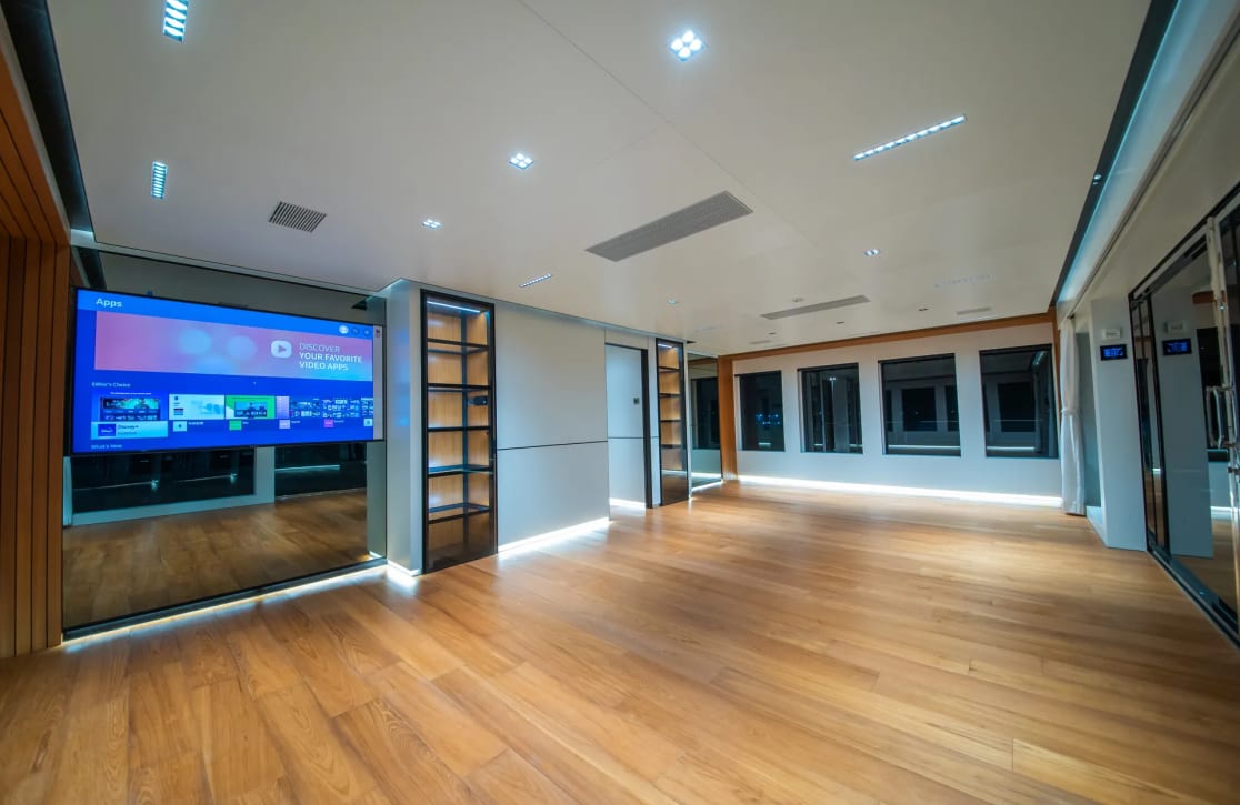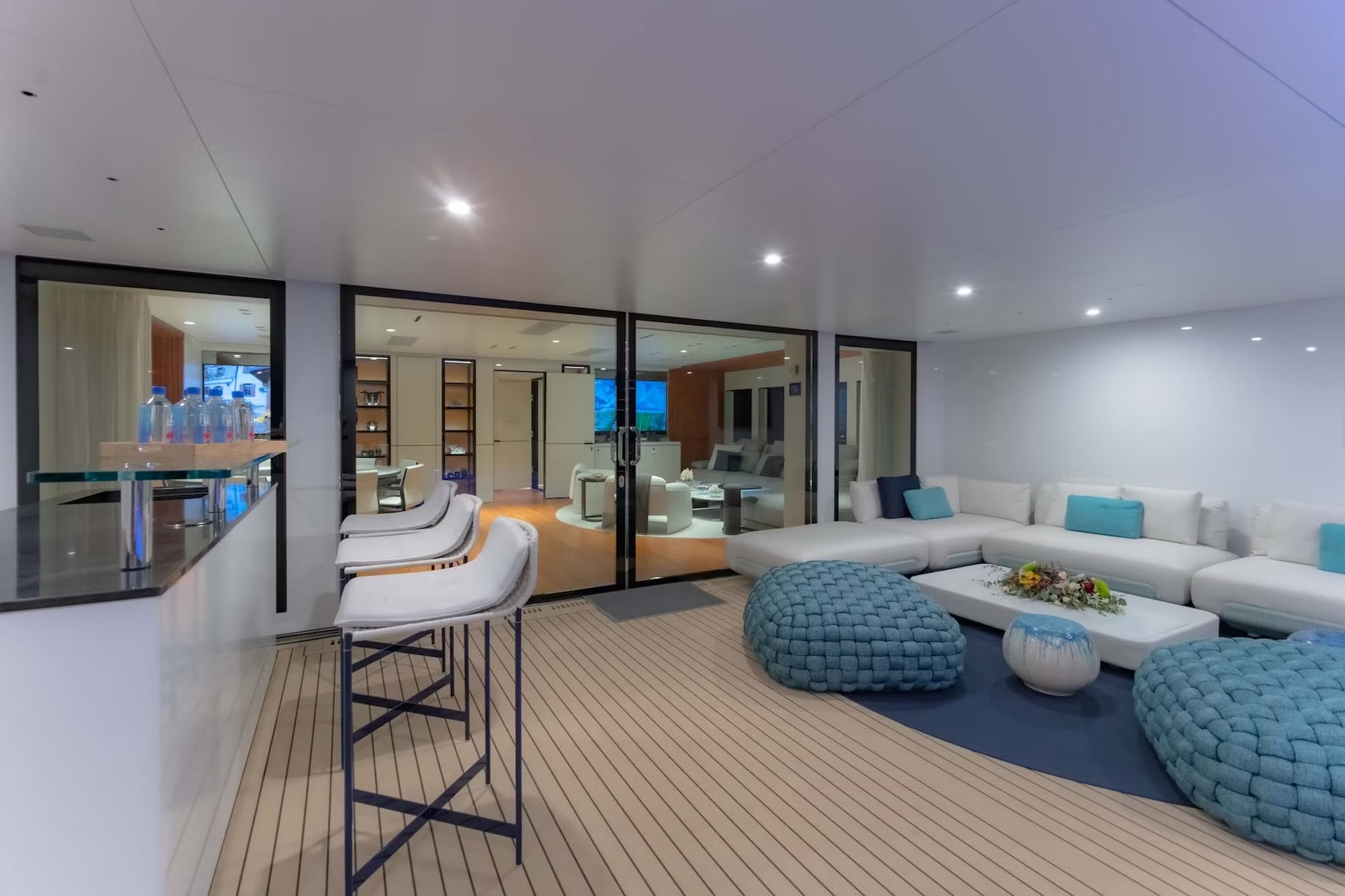 Onboard Space Cat, every moment is crafted to perfection. The sun deck beckons with its inviting sunpads, offering the perfect spot for unwinding under the sun or enjoying an evening cocktail from the exterior bar. Take a refreshing dip in the shimmering pool or engage in a workout session with state-of-the-art gym equipment, all while the gentle rhythm of the ocean surrounds you. As evening falls, underwater lights transform the sea into a magical, luminous world, offering a serene backdrop to your leisurely evenings.