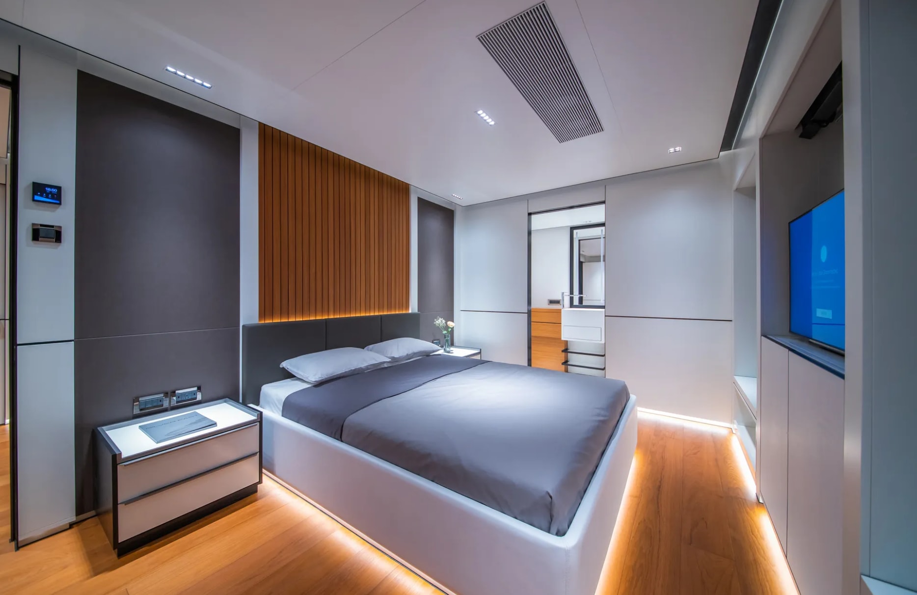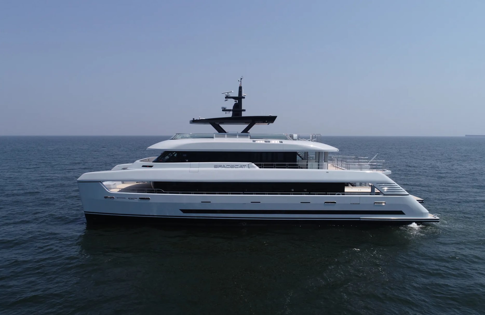 Onboard Space Cat, every moment is crafted to perfection. The sun deck beckons with its inviting sunpads, offering the perfect spot for unwinding under the sun or enjoying an evening cocktail from the exterior bar. Take a refreshing dip in the shimmering pool or engage in a workout session with state-of-the-art gym equipment, all while the gentle rhythm of the ocean surrounds you. As evening falls, underwater lights transform the sea into a magical, luminous world, offering a serene backdrop to your leisurely evenings.