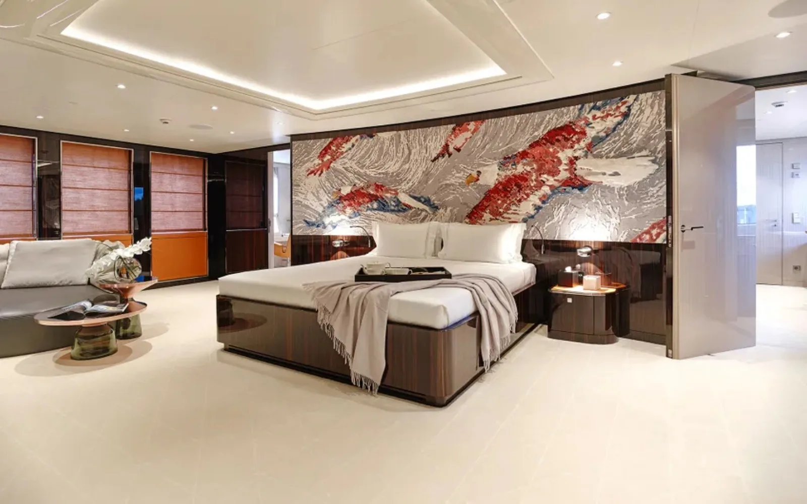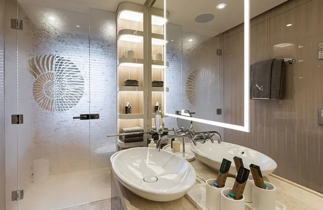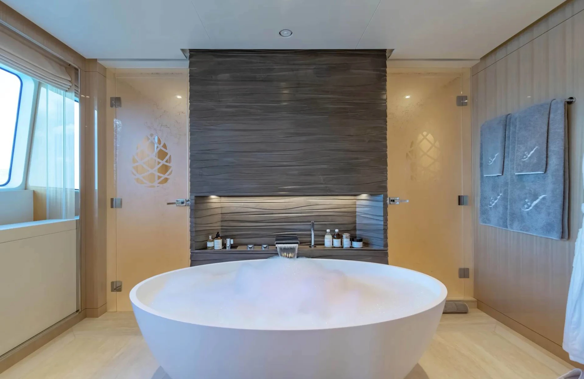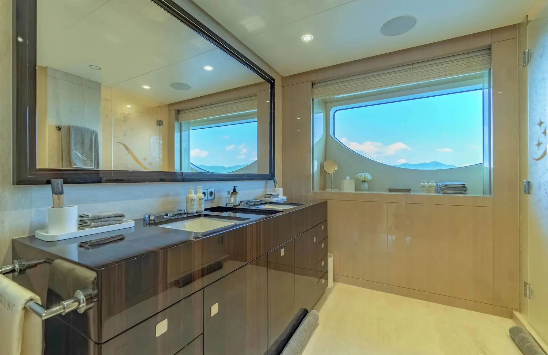 Starlust welcomes up to 12 guests into its six elegantly appointed cabins, each offering a sanctuary of comfort and style. The master suite is a haven of sophistication, while the four double cabins and one twin cabin ensure every guest experiences a restful night’s sleep. Awaken to the gentle sway of the sea, as sunlight filters through expansive windows, casting a gentle glow that invites you to start another day of discovery. Each cabin is a private retreat, where thoughtful design and meticulous detail create an atmosphere of understated elegance.