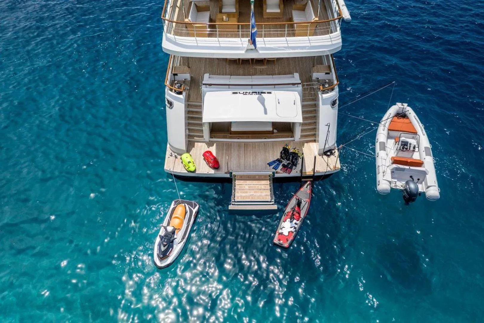 Aboard Sunrise, every detail invites relaxation and enjoyment. Start your day with an invigorating workout in the state-of-the-art gym before indulging in breakfast on the sun deck, where the morning light dances over calm seas. The yacht’s air-conditioned interiors provide a refreshing retreat, seamlessly blending comfort with style. As the day unfolds, the beach club becomes a haven for sun-drenched leisure, while evenings are perfect for al fresco dining under the stars, enhanced by the subtle glow of the exterior bar. An elevator ensures effortless access to all decks, allowing you to explore every corner of this floating paradise with ease.