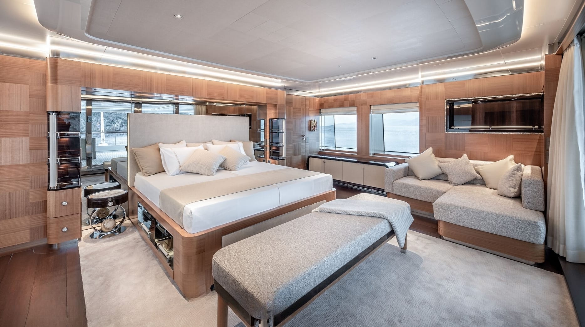 Sunrise welcomes up to 12 guests in five beautifully appointed staterooms, each a sanctuary of comfort and elegance. The master suite, located on the upper deck, offers unparalleled privacy and sweeping ocean views, creating an idyllic morning retreat. Below, two VIP staterooms and two twin cabins with additional Pullman berths envelop guests in a blend of rich Macassar ebony and honey afzelia wood, complemented by bespoke woven leather details. Each room is a testament to thoughtful design, ensuring that every night spent aboard is as restful as it is memorable.