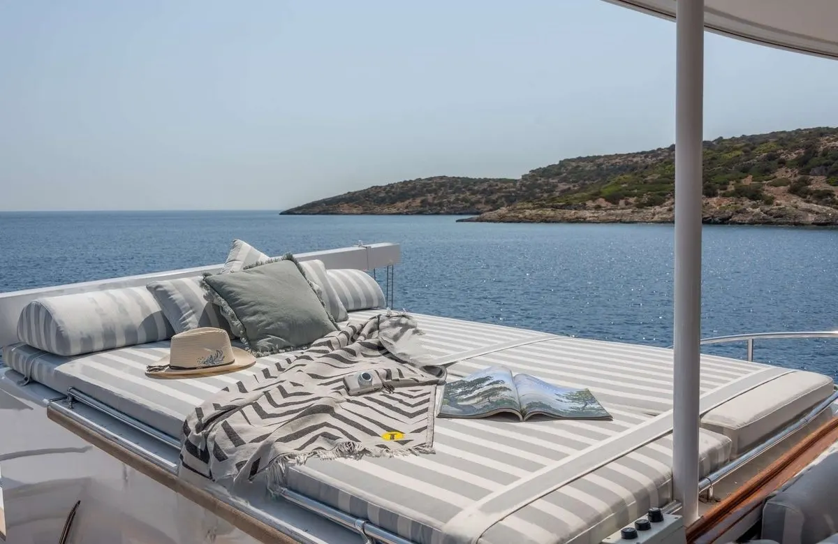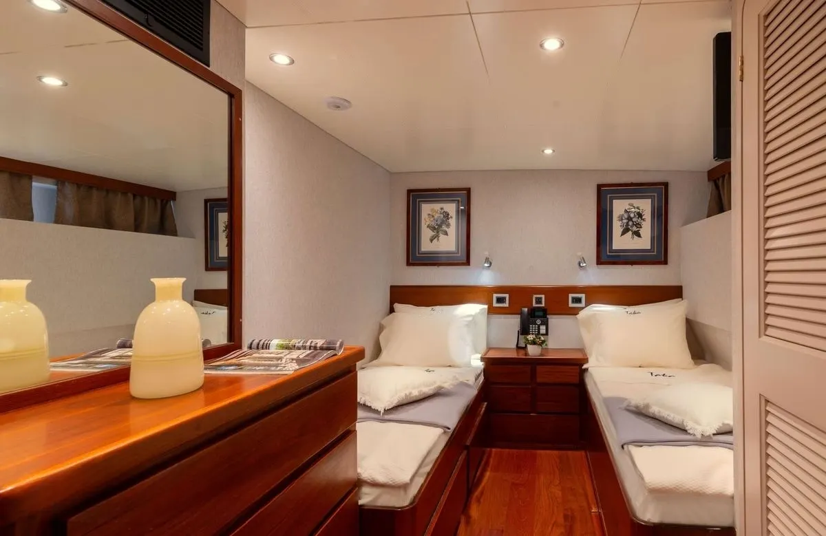Taka’s inviting accommodations welcome up to seven guests into a haven of refined comfort. The allure of the master suite, alongside two twin cabins and a single room, promises restful nights and leisurely mornings. Each cabin is a private retreat where the gentle sway of the sea lulls you into relaxation, and the thoughtful design ensures every guest enjoys both privacy and a sense of community aboard this extraordinary yacht.