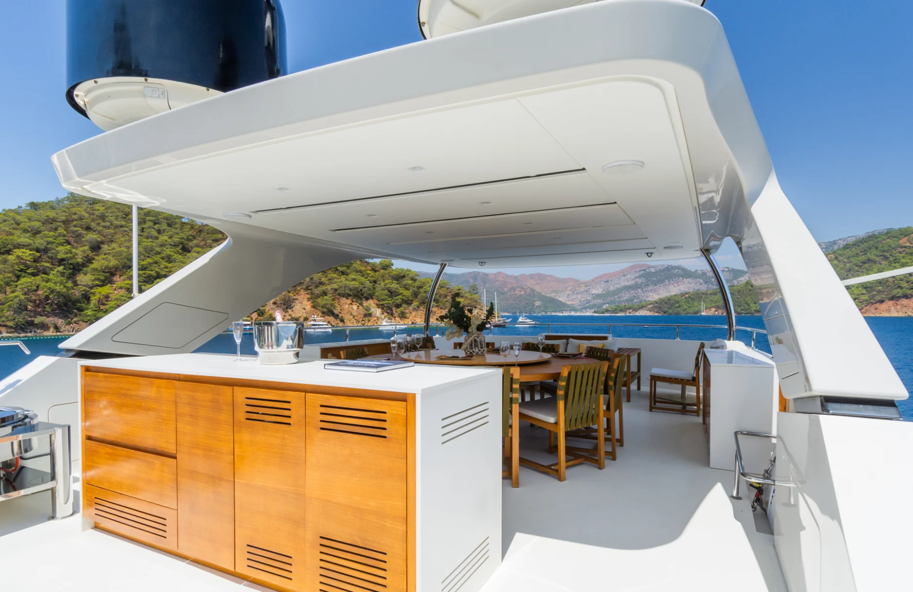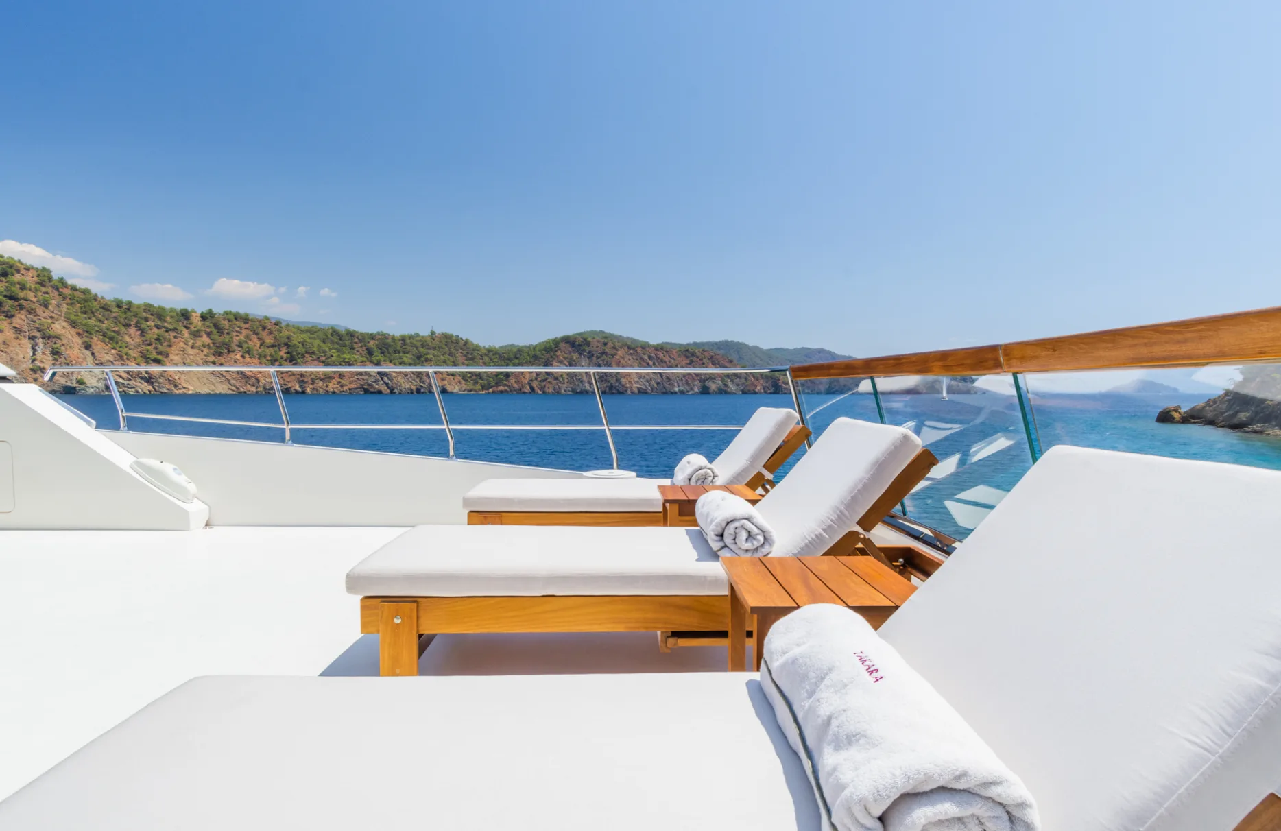 Onboard Takara One, every moment is a celebration of comfort and elegance. Unwind in the deck jacuzzi as the gentle sea breeze envelops you, or find tranquility in the foredeck seating area, perfect for intimate gatherings under the stars. The yacht is equipped for both relaxation and connection, with Wi-Fi ensuring you can stay in touch with the world as much—or as little—as you desire. As the sun sets, the ambient lighting of the social spaces invites you to enjoy evenings filled with laughter and camaraderie. The gym equipment stands ready for those who wish to maintain their fitness routine amidst the captivating oceanic backdrop.