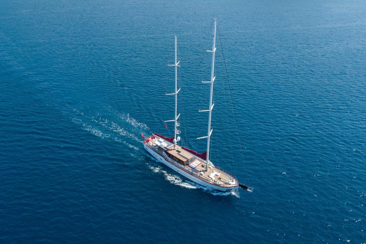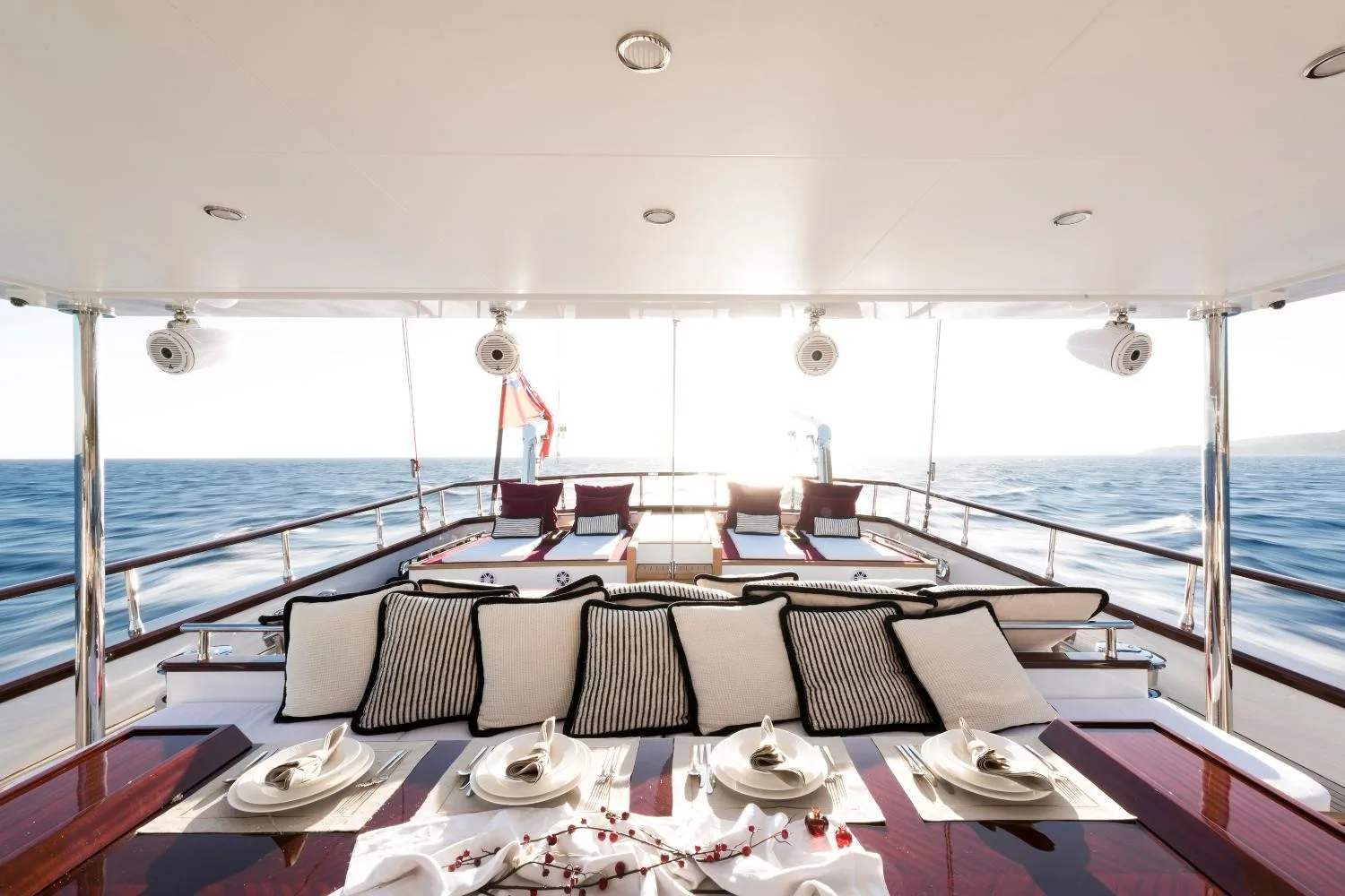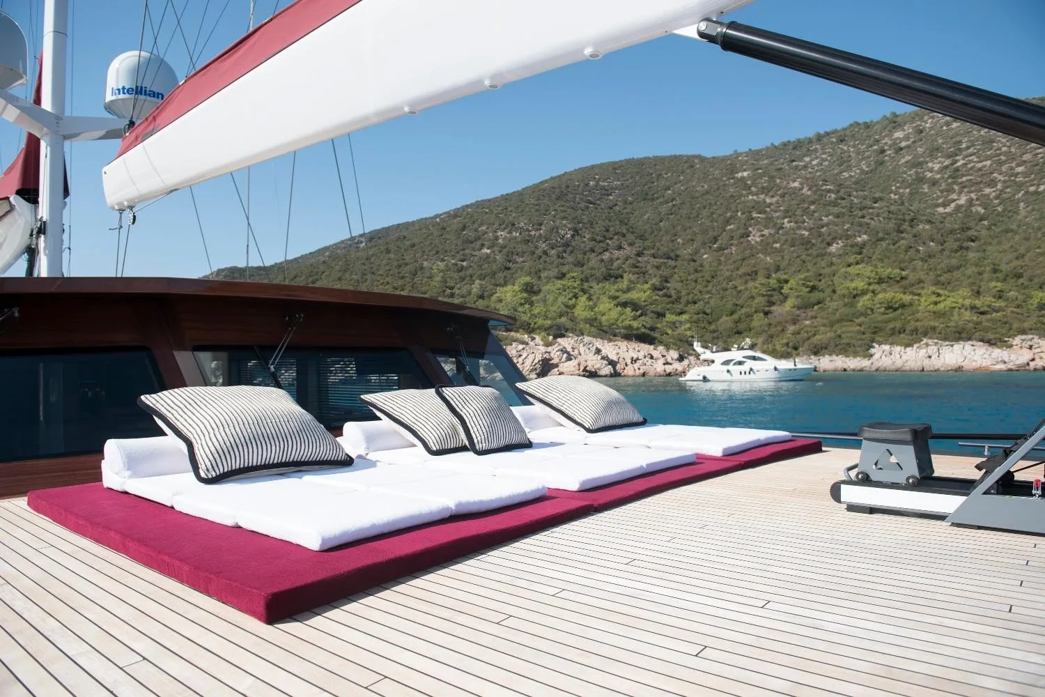 Embark on a journey aboard the illustrious 42.9-meter gulet, That’s Amore, a vessel that seamlessly marries elegance with adventure. Crafted by the esteemed Custom shipyard, this yacht is a haven for up to 12 fortunate guests, who will find themselves enveloped in its opulent embrace. Picture a week spent gliding through the serene waters of the East Mediterranean, where each day unfolds like a masterpiece. With a wood hull and superstructure driven by twin Volvo Penta engines, That’s Amore cruises at a peaceful 10 knots, reaching exhilarating speeds of up to 14 knots, ensuring every voyage is both tranquil and thrilling.