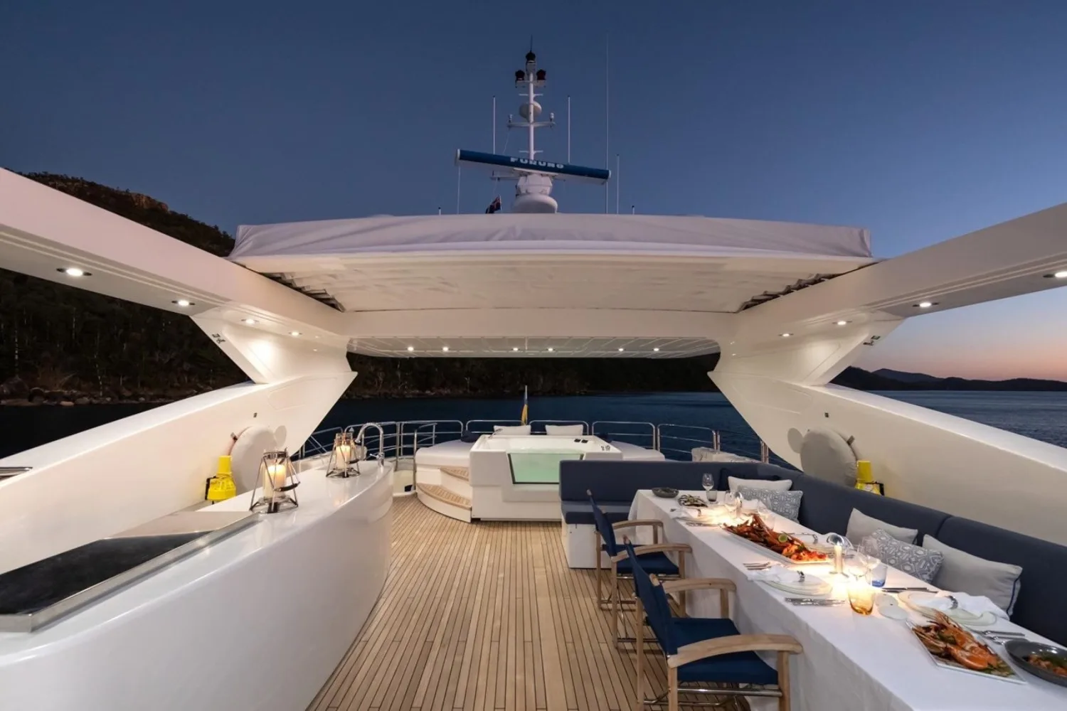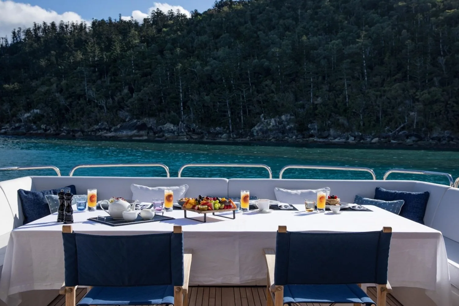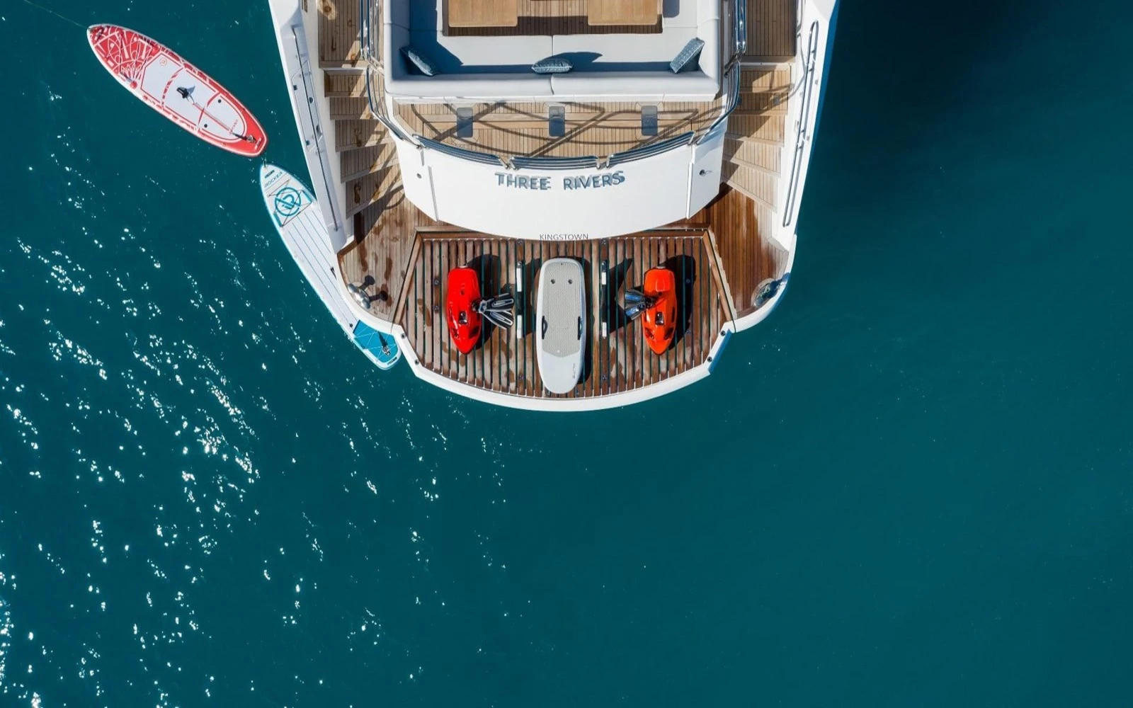 Onboard the Three Rivers, every moment is an invitation to indulge in the finest experiences. As you soak in the deck jacuzzi, the world seems to melt away, leaving only the gentle caress of sea breezes and panoramic ocean views. As the sun sets, underwater lights illuminate the surrounding waters, creating a magical ambiance for evening gatherings. Seamless connectivity is at your fingertips with onboard Wi-Fi, allowing you to share your journey or retreat into solitude as you desire. With comprehensive air conditioning throughout, every space promises comfort and tranquility, whether you’re socializing on the sun deck or enjoying a quiet moment in a private nook.
