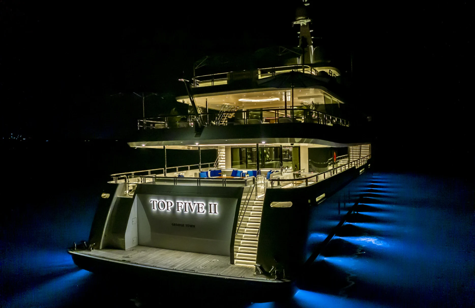 Onboard Top Five II, the state-of-the-art movie theatre and outdoor cinema beckon for magical evenings under the stars, while the beach club offers a seamless transition between ocean and leisure. The deck jacuzzi provides a serene escape, surrounded by panoramic views, as you unwind with a glass of your favorite vintage. Fitness enthusiasts will appreciate the well-equipped gym, ensuring wellness is never compromised. As the sun sets, gather around the firepit for intimate conversations or enjoy a culinary experience prepared with the BBQ, all while the at-anchor stabilizers maintain utmost comfort.
