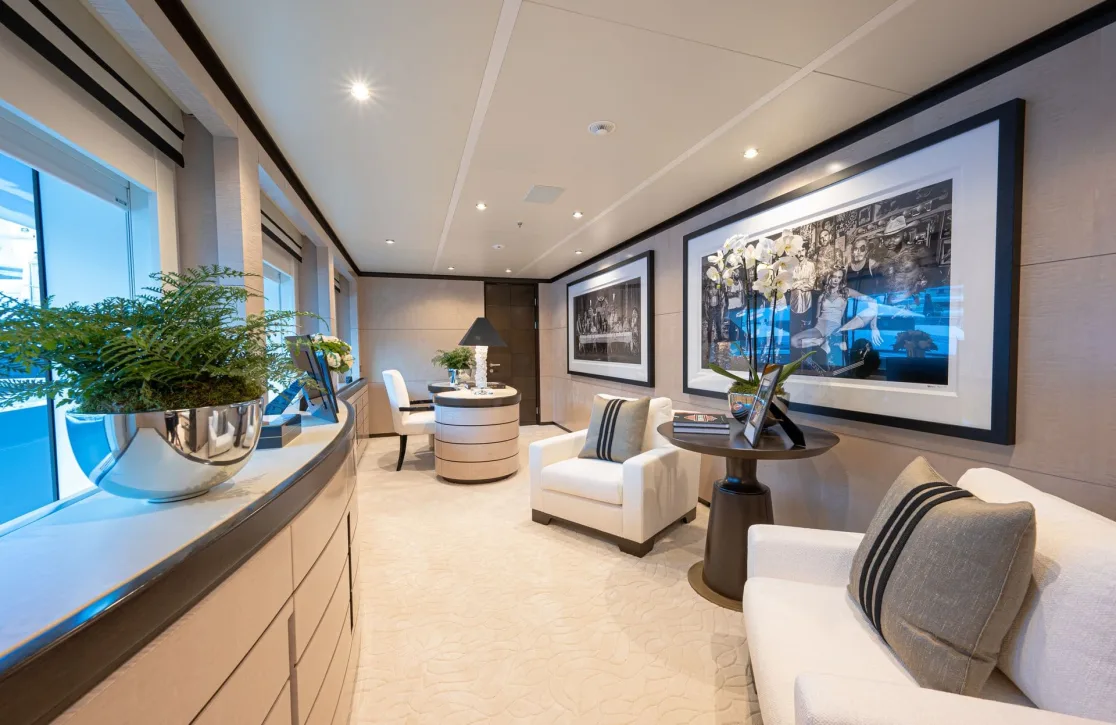 As you step into Triumph’s world, every moment is enriched by thoughtfully designed spaces that beckon relaxation and joy. Begin your day with a rejuvenating session in the state-of-the-art gym, or find serenity in the tranquil sauna. The expansive sun deck offers a perfect spot to bask in the sun, while the jacuzzi provides a soothing retreat under the stars. For those seeking entertainment, the yacht’s beach club offers a breezy, open-air ambiance, complemented by seamless indoor-outdoor transitions that make social gatherings effortlessly delightful.
