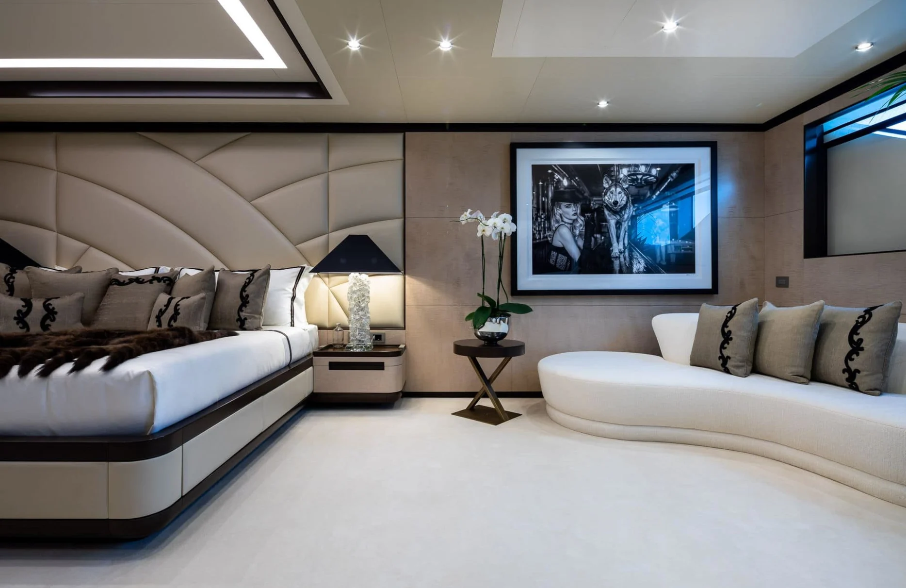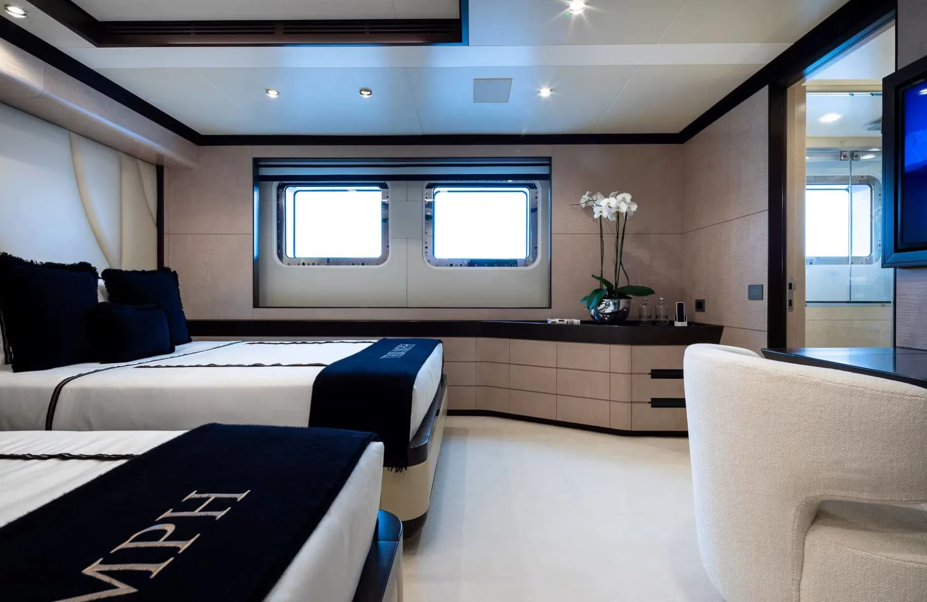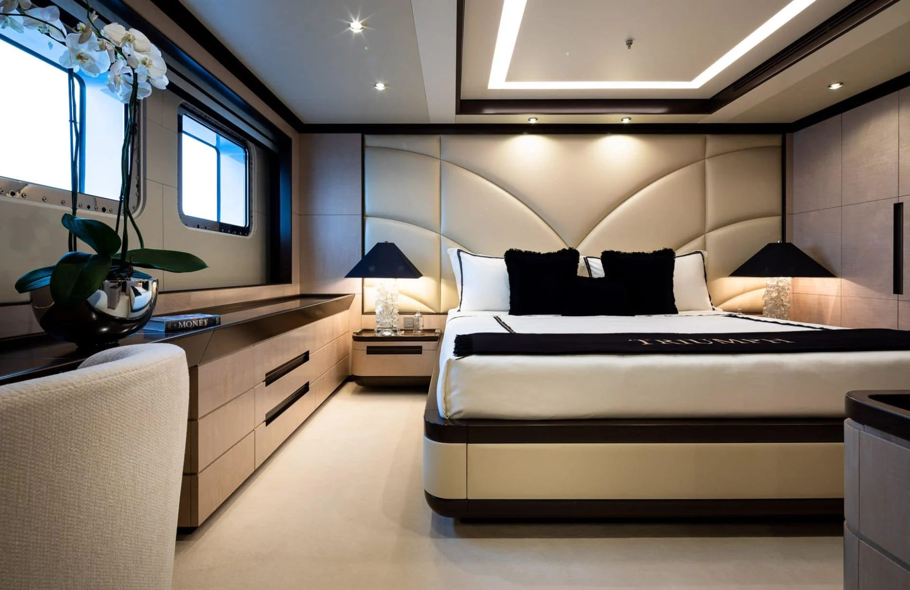 Triumph graciously accommodates up to 12 guests within six exquisitely appointed cabins, each offering a haven of comfort and style. The master suite is a sanctuary, embodying sophistication with its elegant design. Additional VIP and versatile twin or double cabins ensure that every guest experiences the utmost in relaxation and privacy. Imagine waking up to the gentle sway of the ocean, surrounded by sumptuous surroundings that promise an unforgettable stay.
