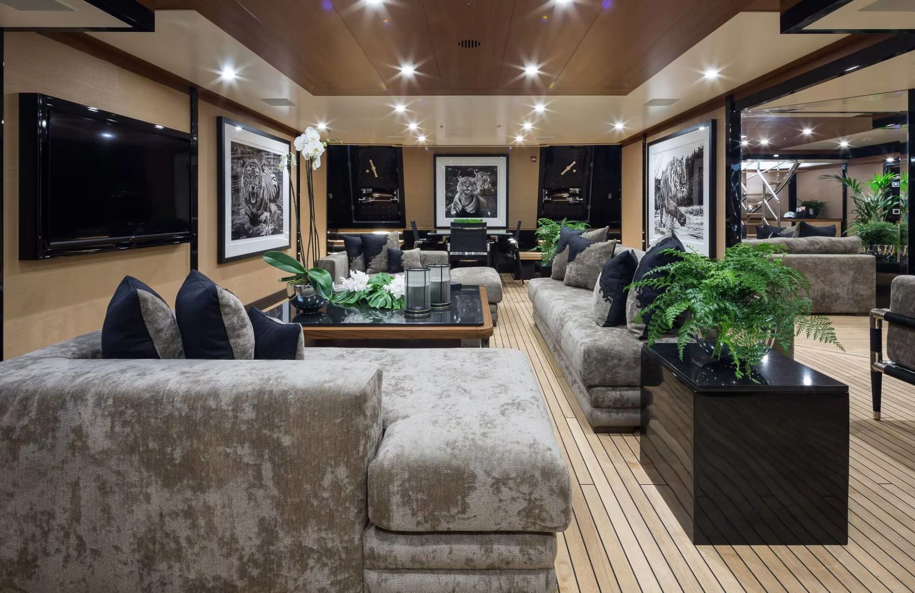 As you step into Triumph’s world, every moment is enriched by thoughtfully designed spaces that beckon relaxation and joy. Begin your day with a rejuvenating session in the state-of-the-art gym, or find serenity in the tranquil sauna. The expansive sun deck offers a perfect spot to bask in the sun, while the jacuzzi provides a soothing retreat under the stars. For those seeking entertainment, the yacht’s beach club offers a breezy, open-air ambiance, complemented by seamless indoor-outdoor transitions that make social gatherings effortlessly delightful.