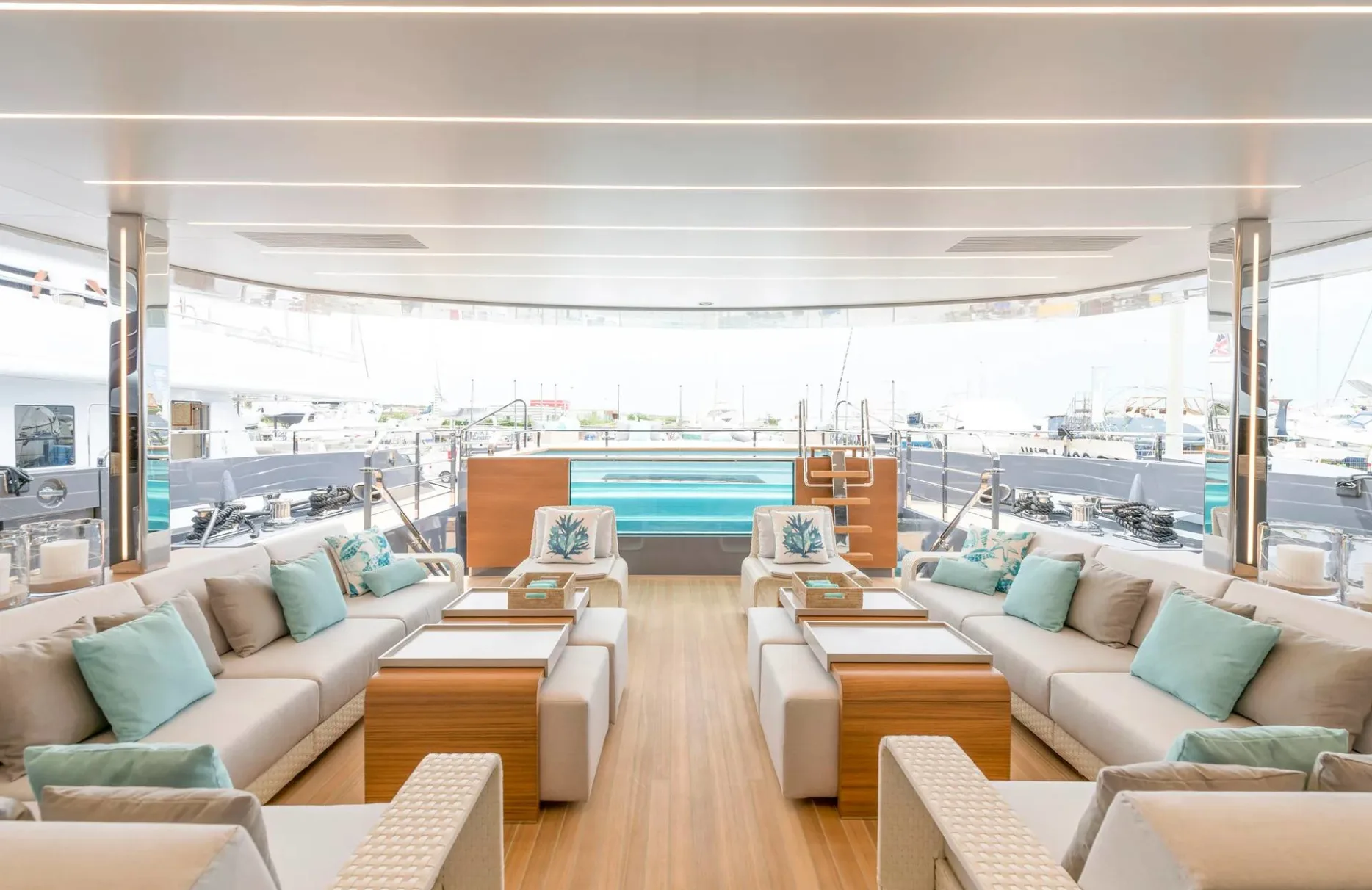The onboard experience of Utopia IV is a symphony of comfort and leisure, where each space is designed for your enjoyment. As daylight spills over the expansive decks, you can unwind in the serene Jacuzzi, a perfect retreat with panoramic views. Fitness enthusiasts will find their sanctuary in the state-of-the-art gym, while those seeking entertainment can indulge in the pleasures of satellite TV and video on-demand. The children’s playroom offers a haven for younger guests, ensuring their delight is not overlooked. As evening descends, the beach club becomes a focal point for social gatherings, its atmosphere enriched by the soft glow of underwater lights and the gentle sea breeze.