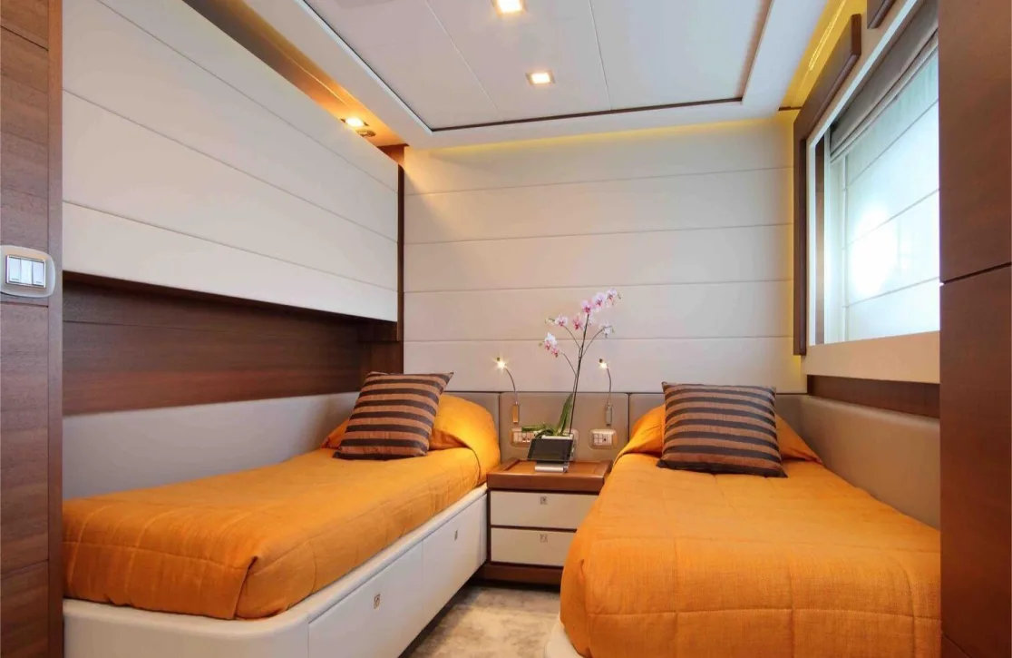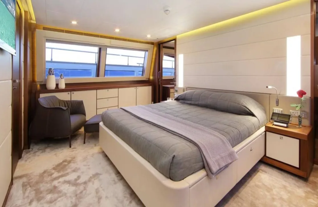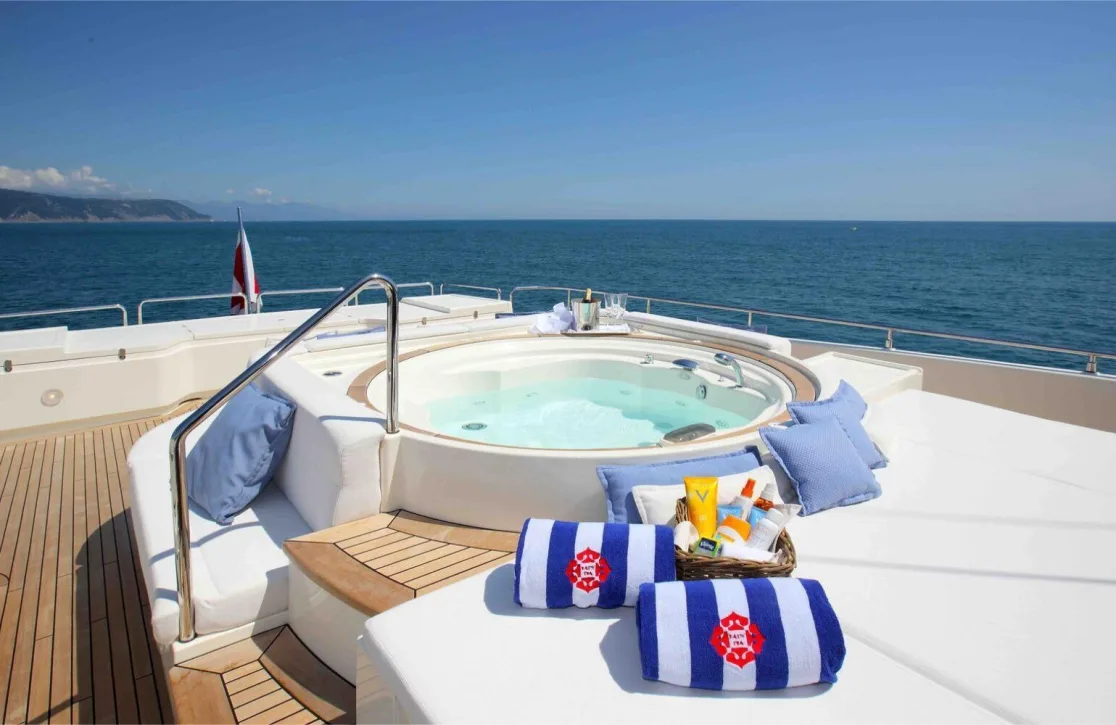 Vela invites you to immerse yourself in a world of unparalleled refinement and comfort. Begin your day with a refreshing workout in the state-of-the-art gym, or unwind in the deck jacuzzi as the sun sets over the horizon. The yacht’s seamless Wi-Fi connectivity ensures you remain effortlessly in touch with the world, or blissfully disconnected, as you prefer. Her stabilizers promise a serene experience whether at anchor or underway, while air conditioning guarantees comfort in all climates. Every detail has been considered to enhance your experience aboard.