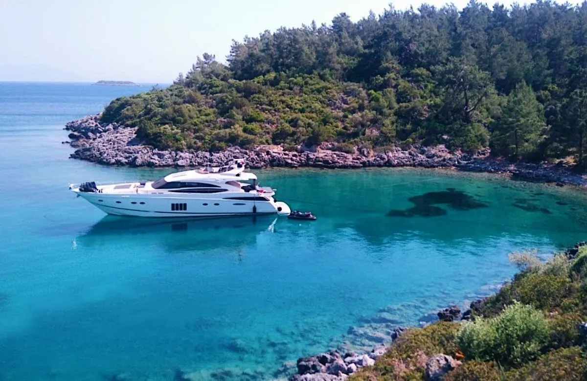 The journey aboard ‘Via’ offers a harmonious blend of elegance and adventure. Crafted by the renowned British shipyard Princess, this 26-meter vessel invites you to experience a world where every sunrise and sunset paints a stunning backdrop for your journey. With a sleek GRP hull and powerful twin Caterpillar engines, ‘Via’ glides effortlessly through the water at a leisurely cruising speed of 15 knots, with the capability to reach an exhilarating 32 knots. Over the course of your week on board, you’ll discover the perfect balance between the serenity of the sea and the allure of coastal exploration.