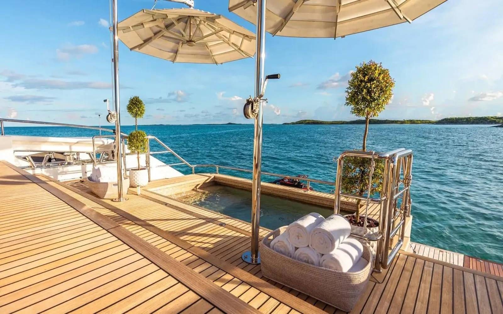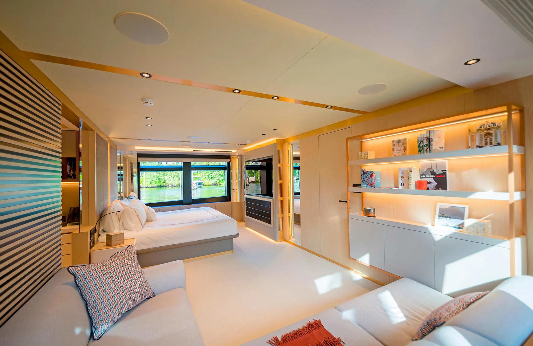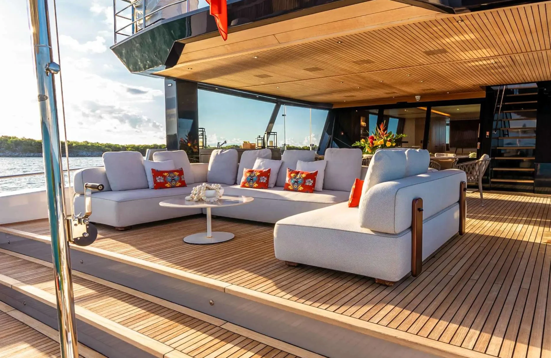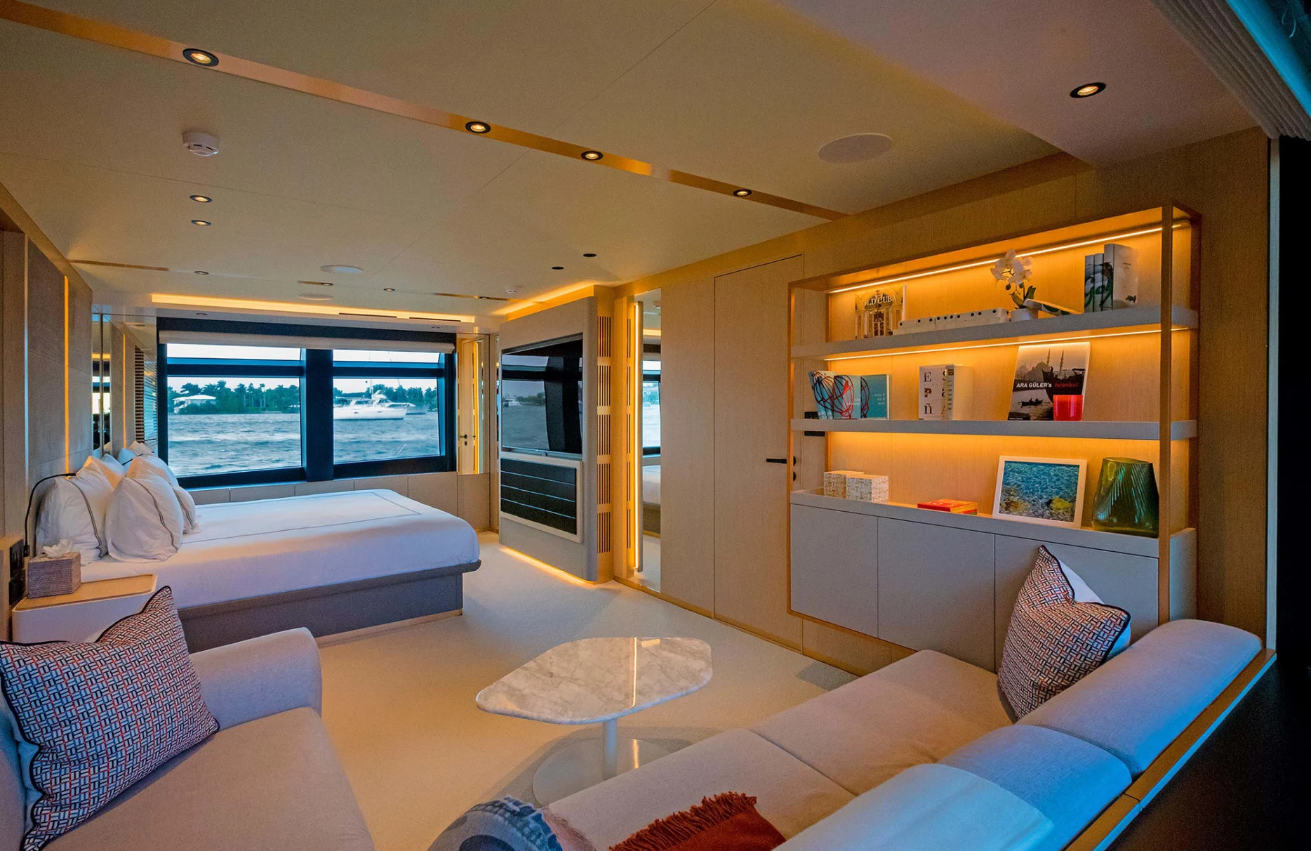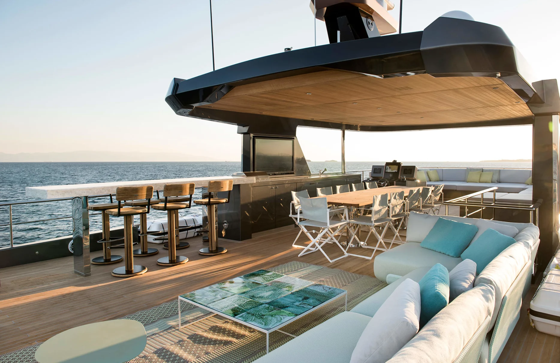 Aboard Vivace, every day is a celebration of relaxation and refinement. Start your mornings with a rejuvenating workout in the state-of-the-art gym, or unwind on the sun deck, where sunpads offer a tranquil spot to bask in the sun’s warmth. As the day unfolds, the exterior bar becomes a vibrant hub for socializing, where you can sip crafted cocktails while enjoying panoramic views. The yacht’s at-anchor stabilizers ensure your comfort, allowing you to indulge in the serene ambiance of the swimming platform, where the gentle lapping of waves sets a soothing backdrop.