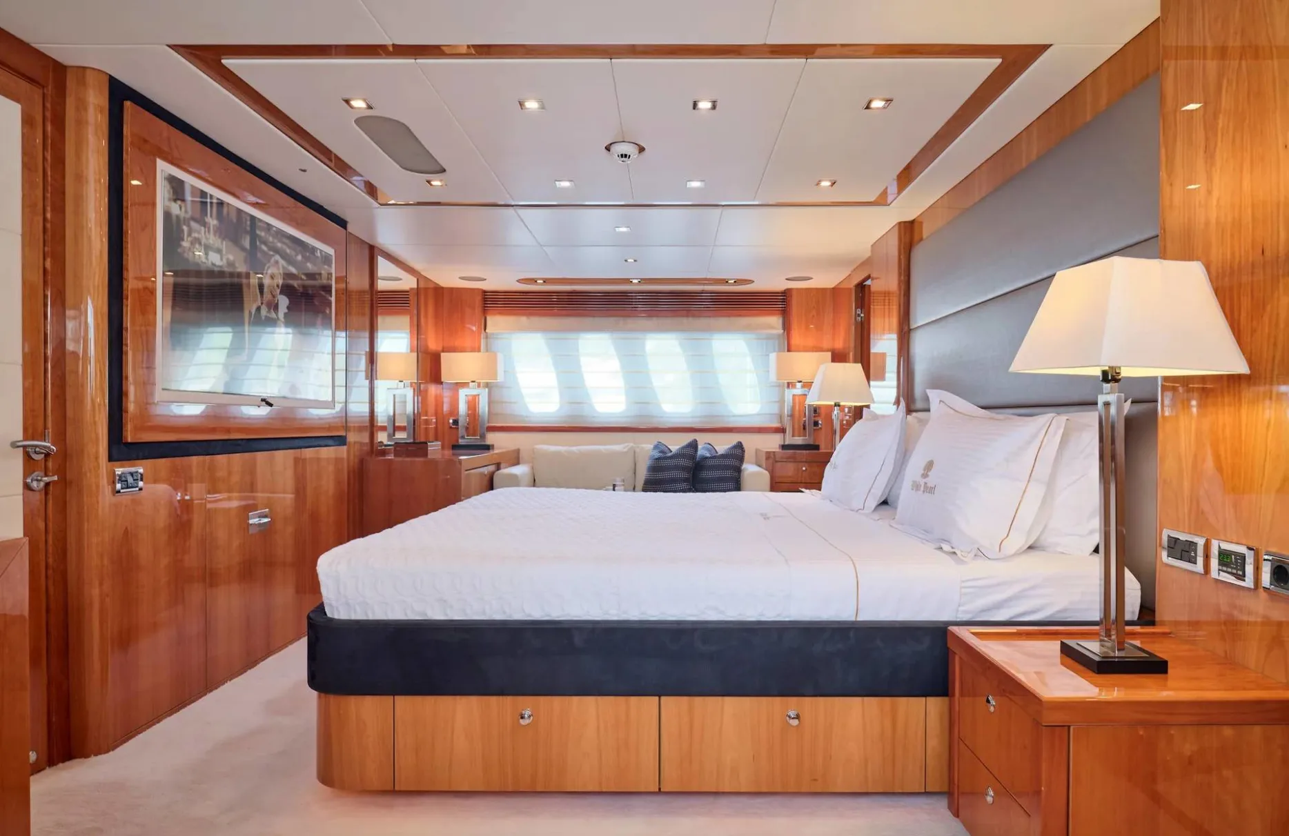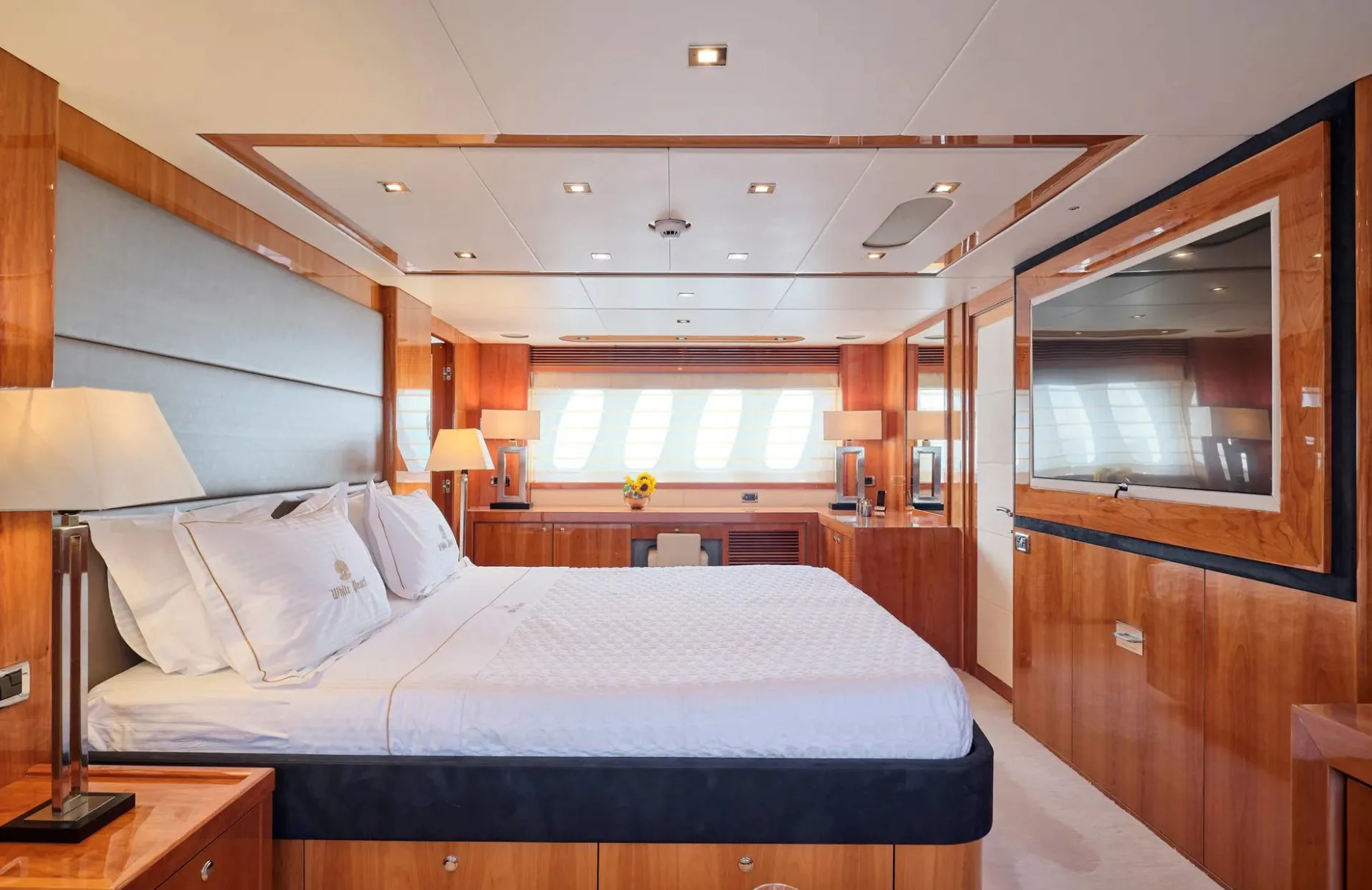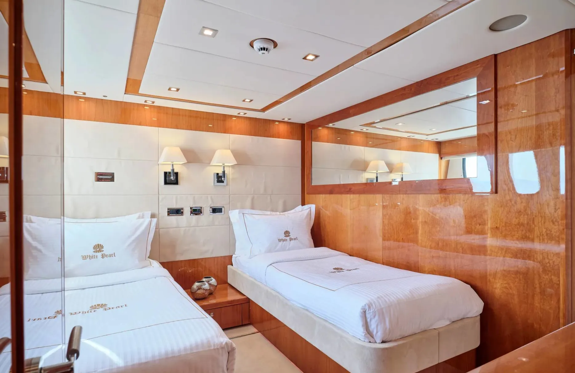 White Pearl I accommodates up to eight guests in four exquisitely appointed cabins, each offering a sanctuary of comfort and style. The master suite, with its expansive dressing room, sets a new standard for luxury at sea. Complementing the master are a VIP cabin and two twin cabins, ensuring that every guest experiences the pinnacle of relaxation. Wake to the gentle sway of the sea and the promise of a new day’s adventures, knowing that your surroundings are designed for ultimate privacy and serenity.