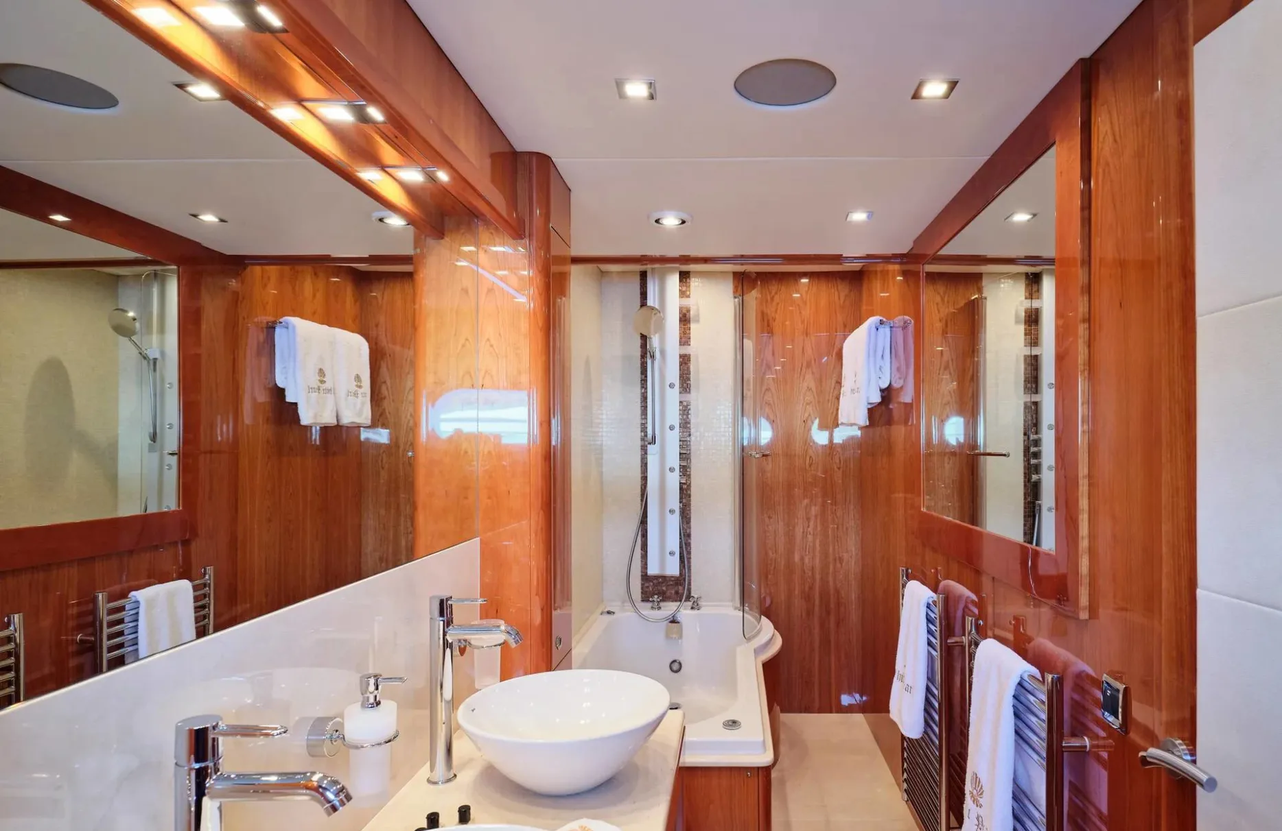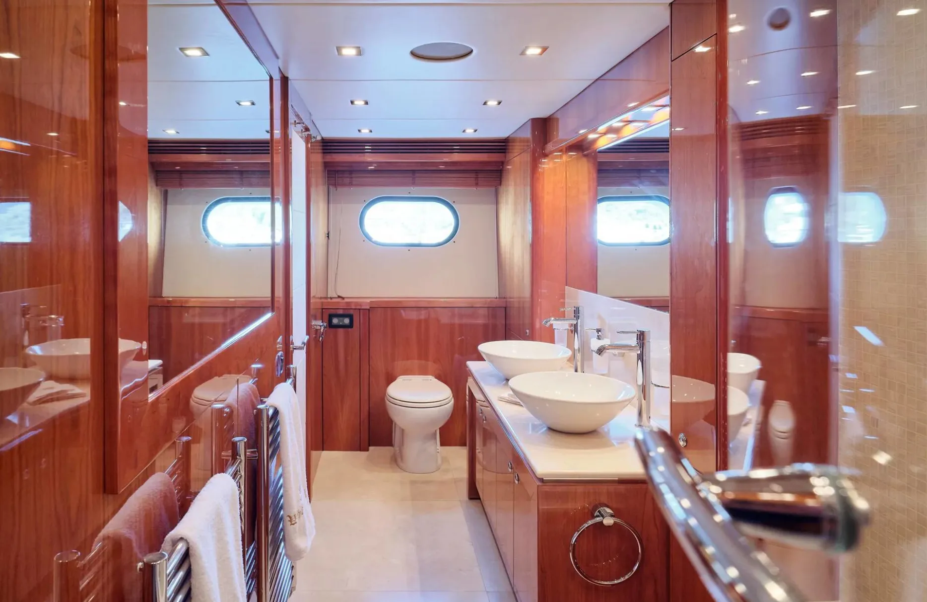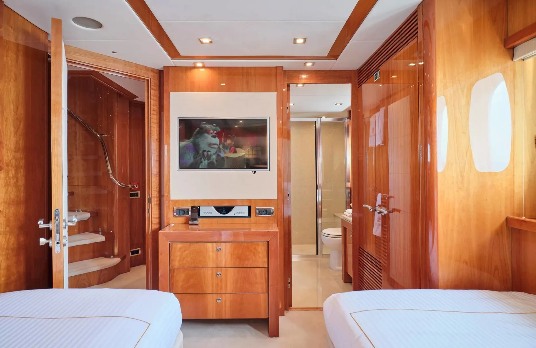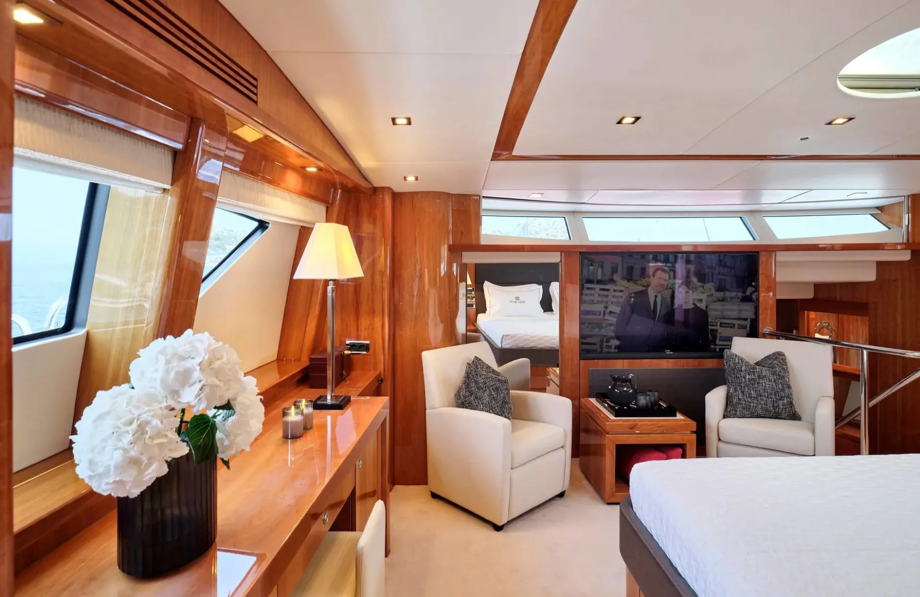 White Pearl I accommodates up to eight guests in four exquisitely appointed cabins, each offering a sanctuary of comfort and style. The master suite, with its expansive dressing room, sets a new standard for luxury at sea. Complementing the master are a VIP cabin and two twin cabins, ensuring that every guest experiences the pinnacle of relaxation. Wake to the gentle sway of the sea and the promise of a new day’s adventures, knowing that your surroundings are designed for ultimate privacy and serenity.