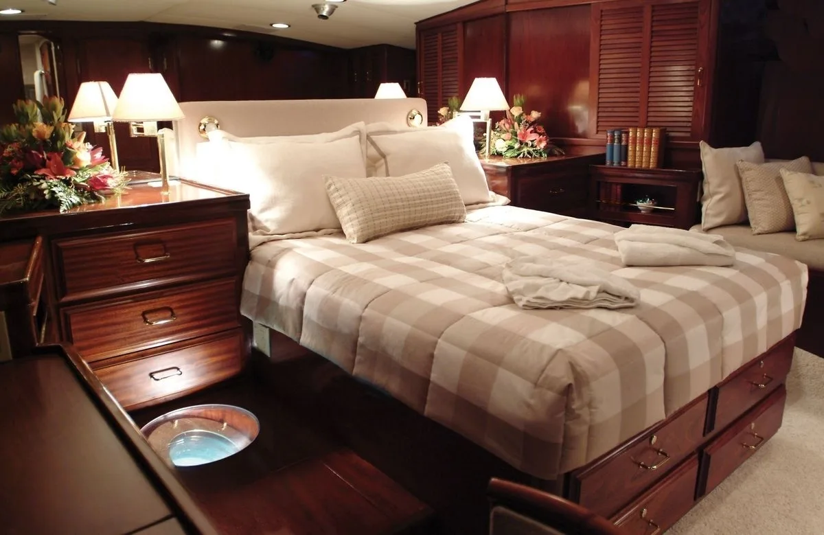 Yonder Star accommodates up to eight guests in three beautifully appointed cabins, each offering a haven of rest and rejuvenation. With a versatile sleeping arrangement that includes a queen bed, two doubles, and a single, every guest is assured a restful night’s sleep. As dawn breaks, awaken to gentle waves lapping against the hull and the promise of another day filled with discovery. The intimate setting and refined decor of the cabins make waking up aboard Yonder Star an experience that is both refreshing and serene.