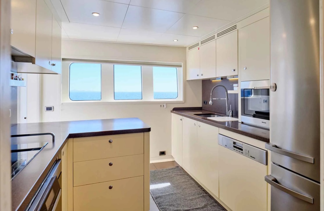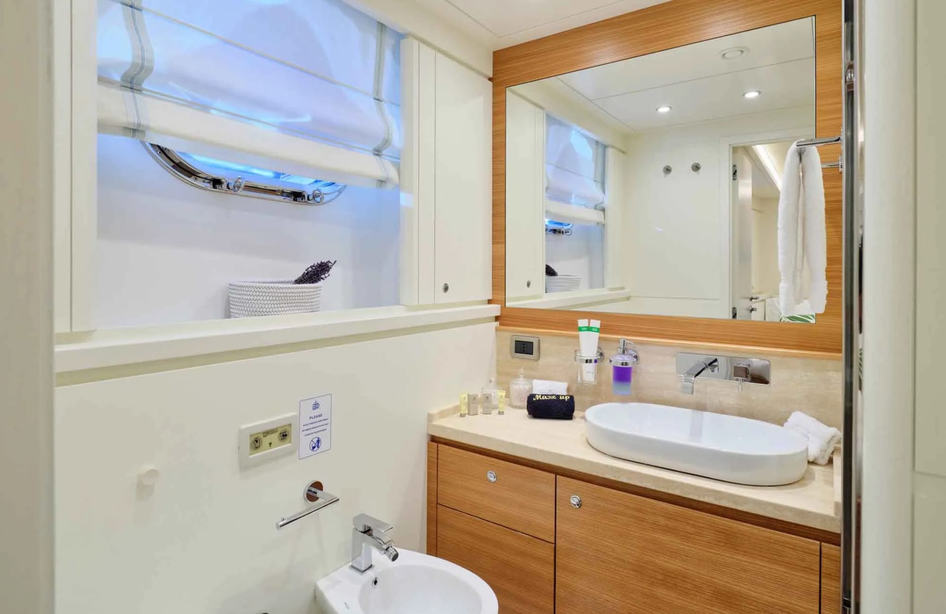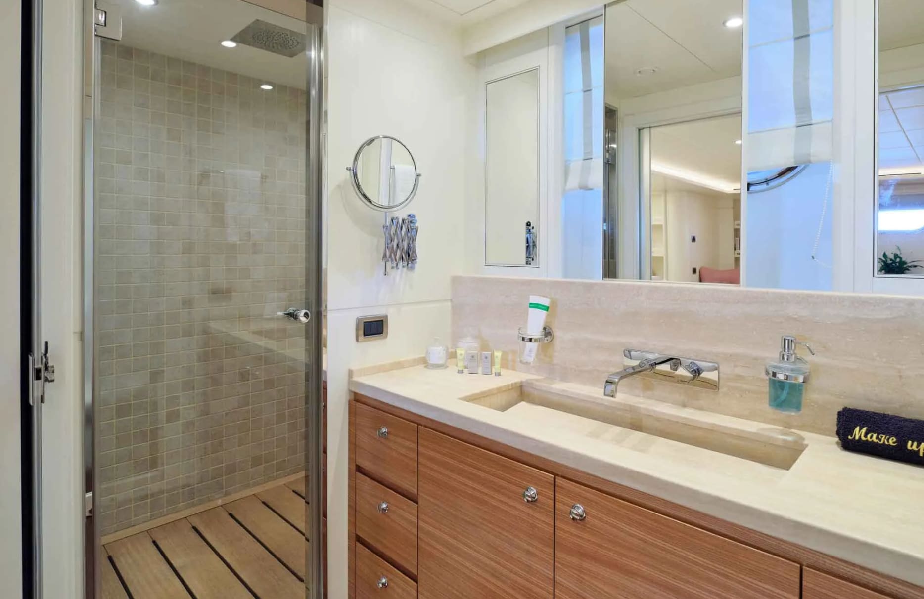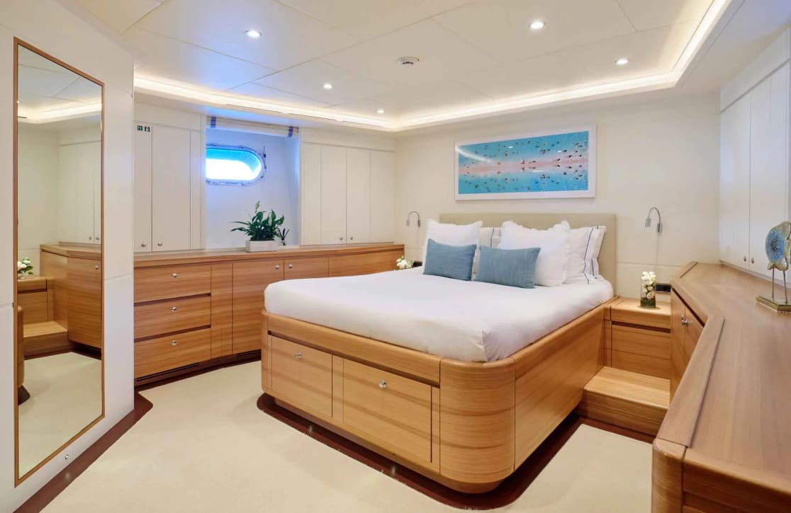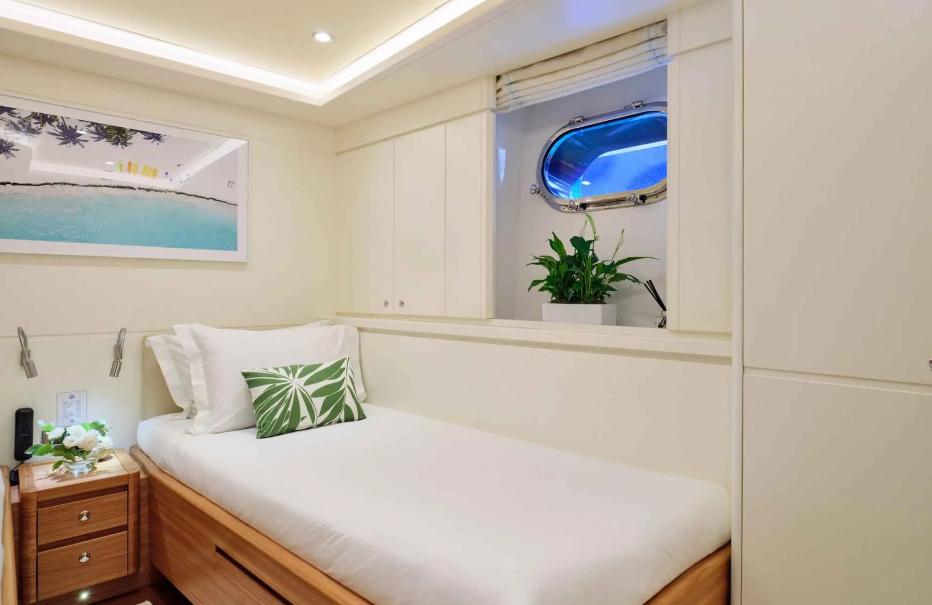 3D offers a harmonious blend of elegance and comfort within her four exquisitely appointed cabins. Accommodating up to 10 guests, the master suite, VIP cabin, and two twin cabins, each with pullman options, ensure a restful haven for every guest. Awaking to the gentle sway of the yacht, guests are greeted by the promise of a day filled with exploration and relaxation. The thoughtful design of each cabin, paired with the attentive care of a dedicated crew of six, ensures a seamless and rejuvenating stay on the water.