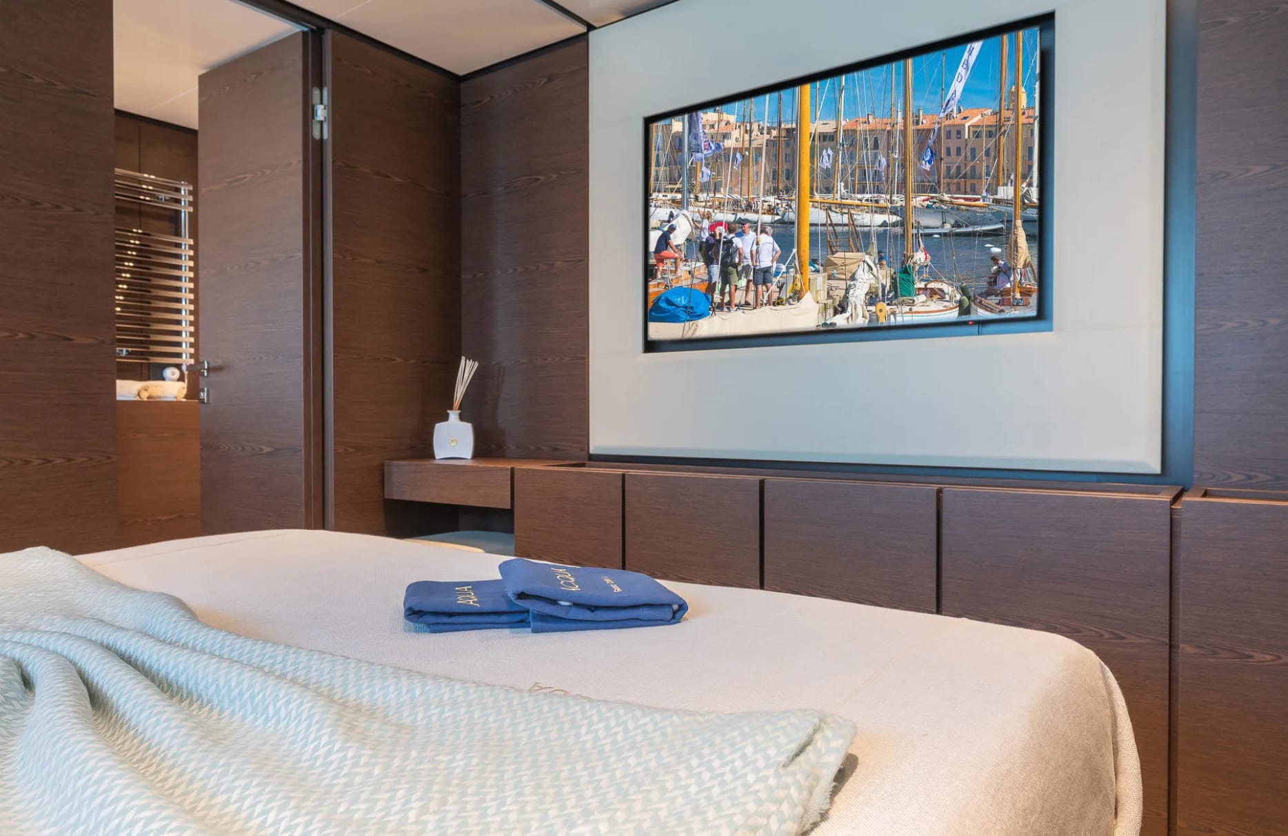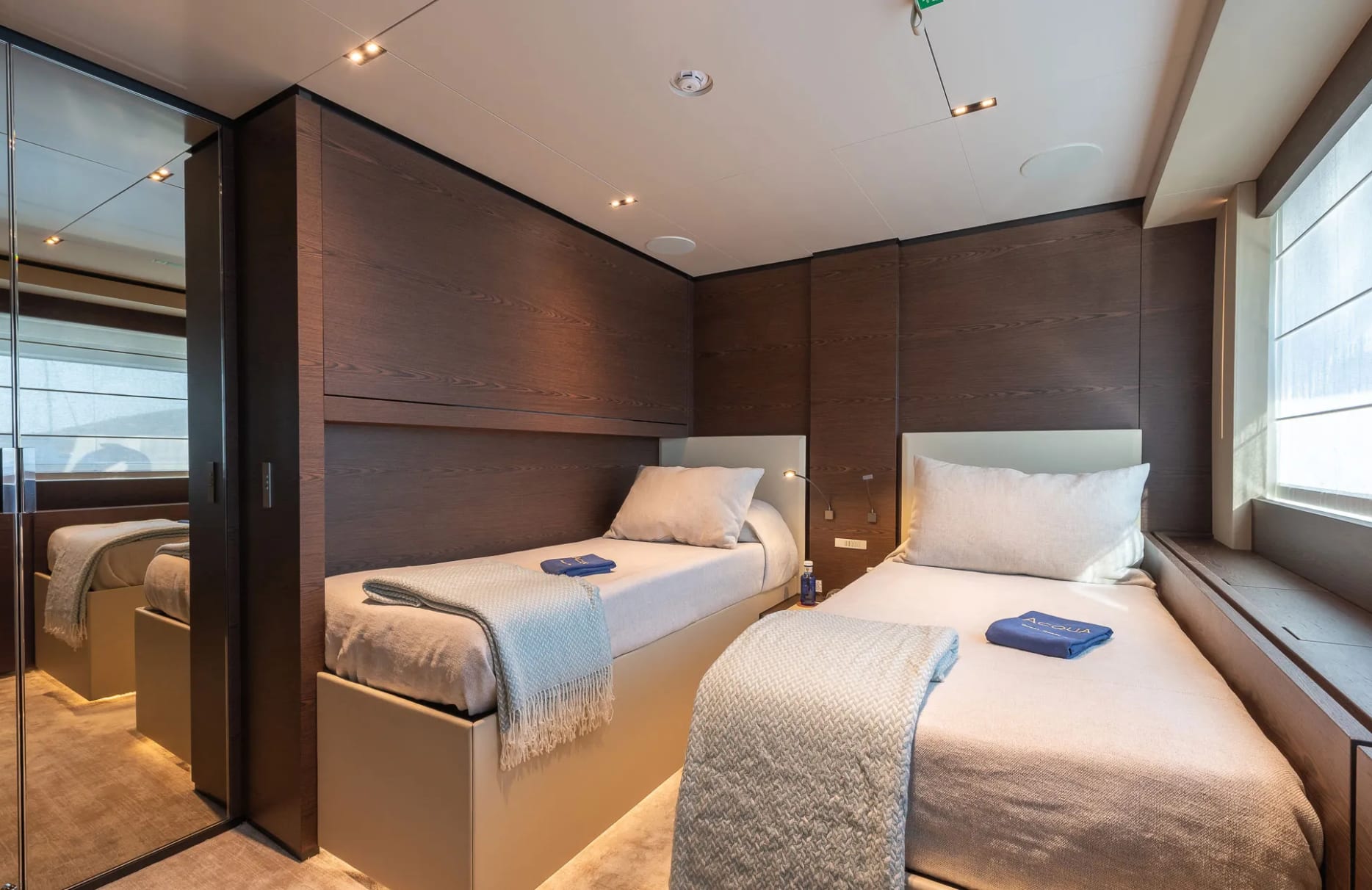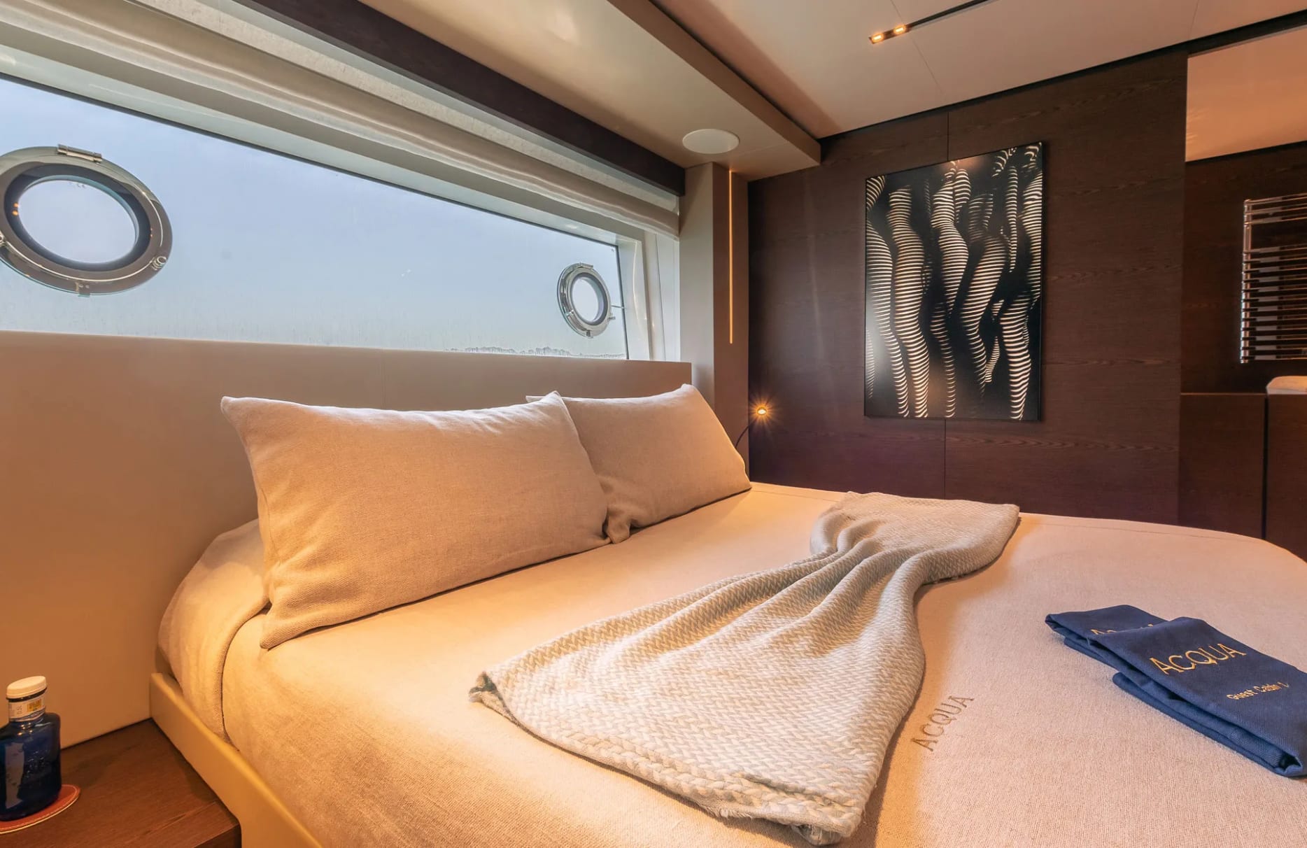 Acqua welcomes up to 11 guests into her thoughtfully designed accommodations, where each of the five cabins offers a sanctuary of rest and rejuvenation. The full beam primary suite provides a tranquil retreat with expansive views, while the additional double and twin cabins ensure every guest enjoys a restful night’s sleep. As dawn breaks, the gentle motion of the sea and the promise of a new day invite you to embrace the possibilities aboard.