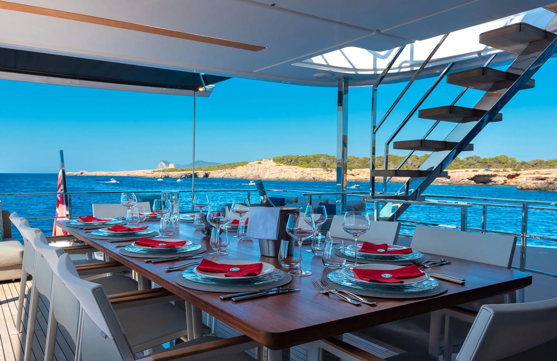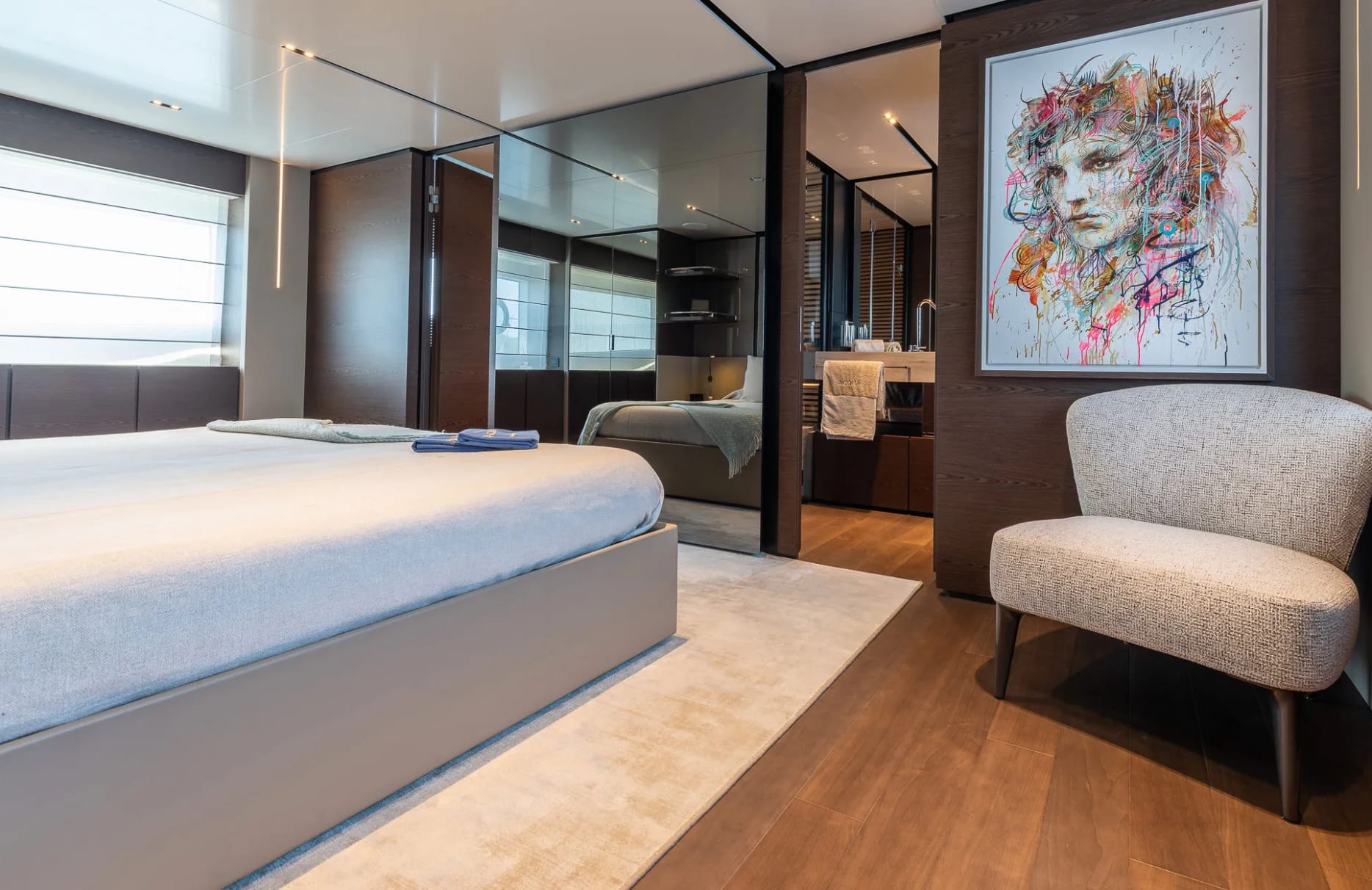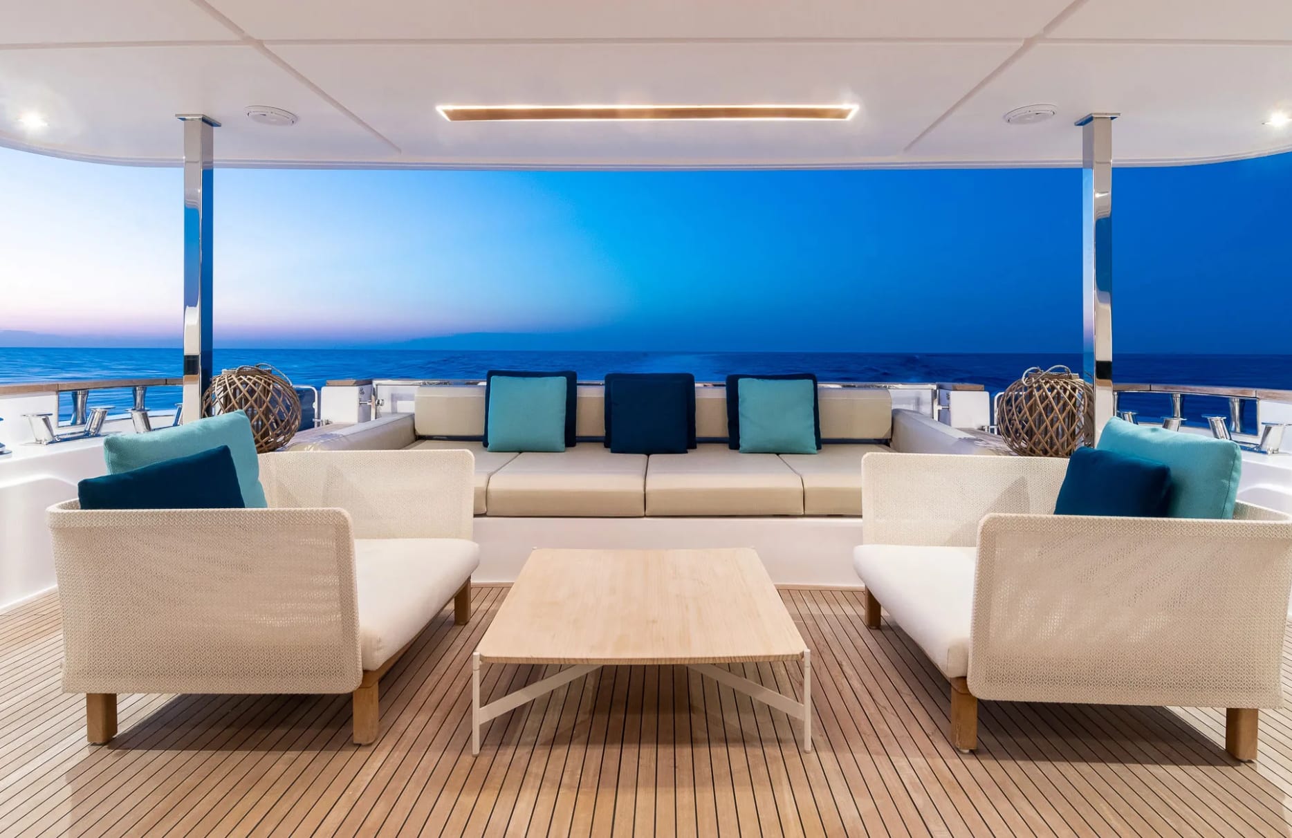 Acqua welcomes up to 11 guests into her thoughtfully designed accommodations, where each of the five cabins offers a sanctuary of rest and rejuvenation. The full beam primary suite provides a tranquil retreat with expansive views, while the additional double and twin cabins ensure every guest enjoys a restful night’s sleep. As dawn breaks, the gentle motion of the sea and the promise of a new day invite you to embrace the possibilities aboard.