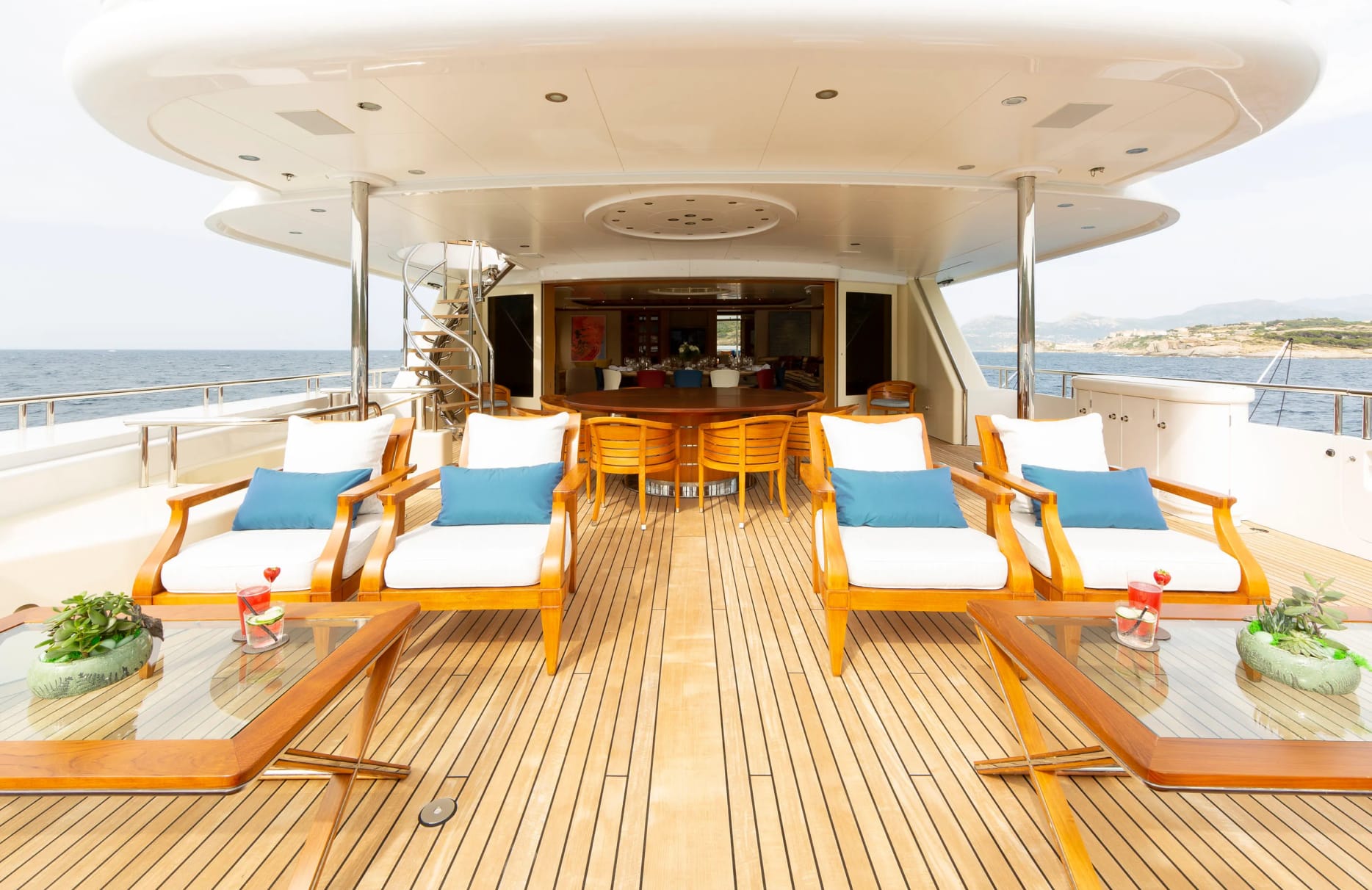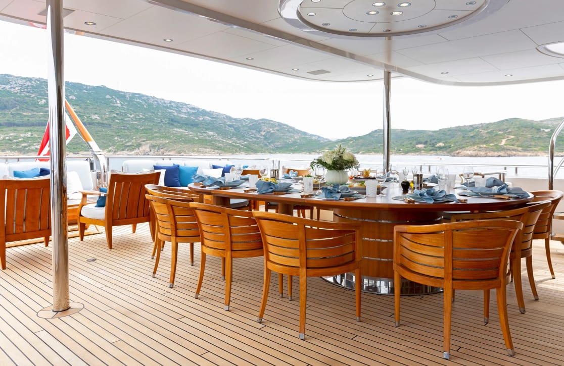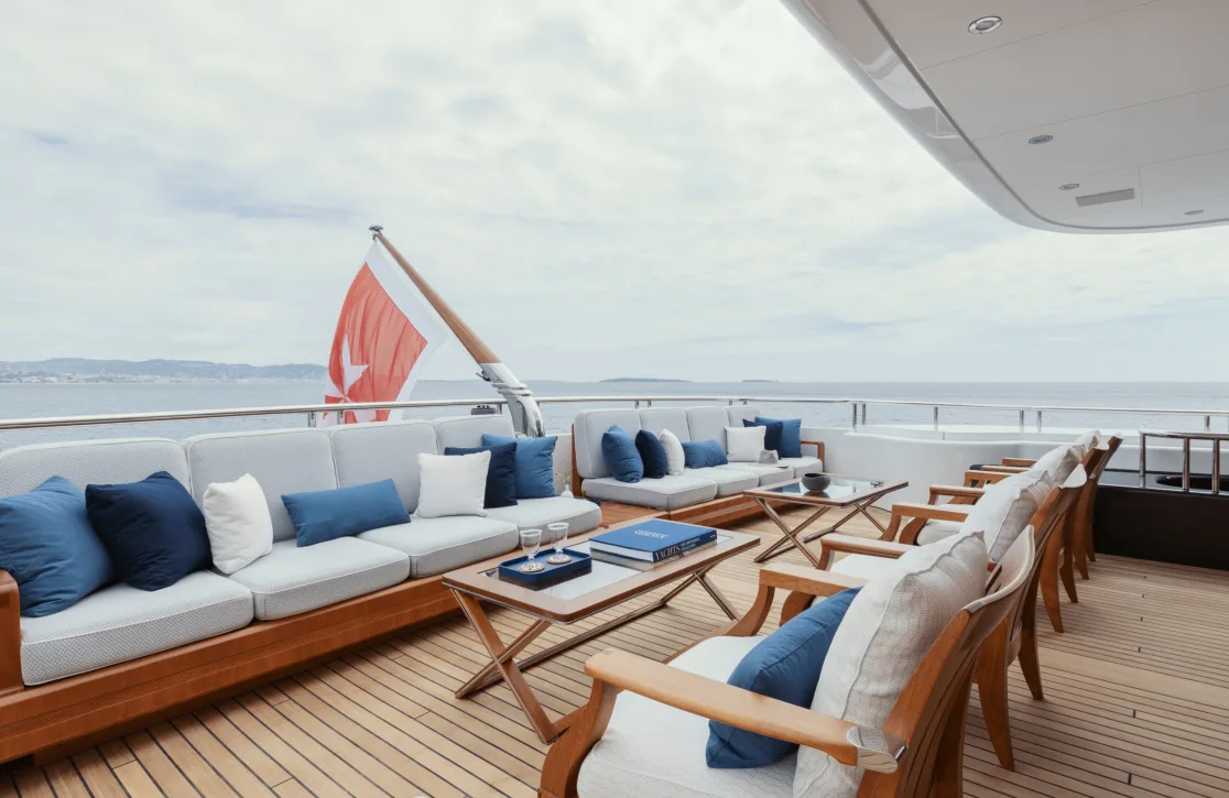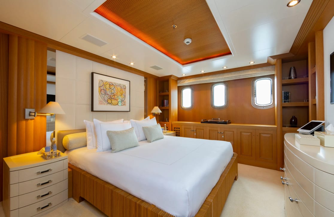 Designed with the discerning traveler in mind, ‘Adventure’ offers sumptuous accommodations for up to 12 guests across six elegantly appointed cabins. The master suite, a sanctuary of tranquility, provides an oasis of privacy, while two double cabins and two twin cabins offer flexible sleeping arrangements, ensuring restful nights for families and friends alike. Each cabin is a harmonious blend of comfort and style, where waking up is a gentle embrace from the surrounding seascape, echoed in the refined interior crafted by Terence Disdale.