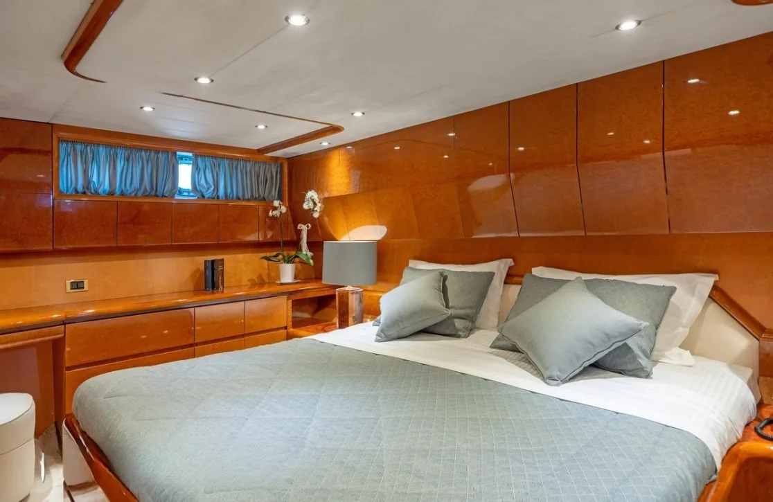 AlanDiNi welcomes up to 11 guests into her serene embrace, offering a choice of four beautifully appointed cabins. Each room is a sanctuary, where neutral tones and plush carpets create a soothing atmosphere. Awake to the gentle rhythm of the waves in the master suite, with its king-sized bed, or find solace in the elegant VIP suite. Two twin cabins provide versatile sleeping arrangements, ensuring every guest finds their perfect space to unwind and dream.