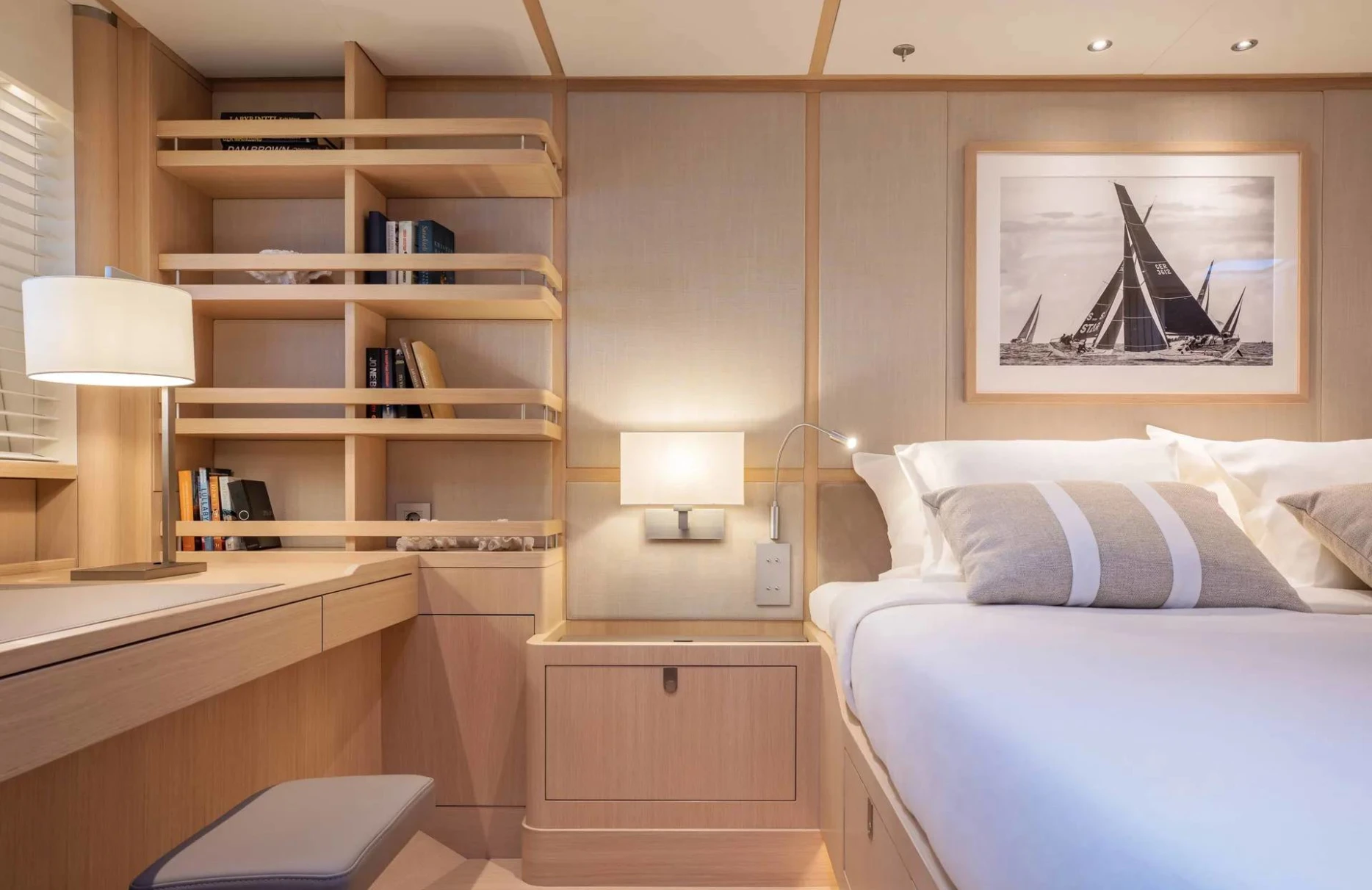 Alix welcomes up to eight guests into its embrace, offering four lavishly appointed cabins where comfort and style harmoniously coexist. Awaken to the gentle lull of the sea in your private sanctuary, where every detail has been considered to enhance your stay. The elegant suites, with their exquisite interiors, provide a serene retreat, allowing you to rejuvenate and refresh before embarking on the day’s adventures. With two additional staff cabins and a dedicated crew of four, your comfort and privacy are always prioritized.