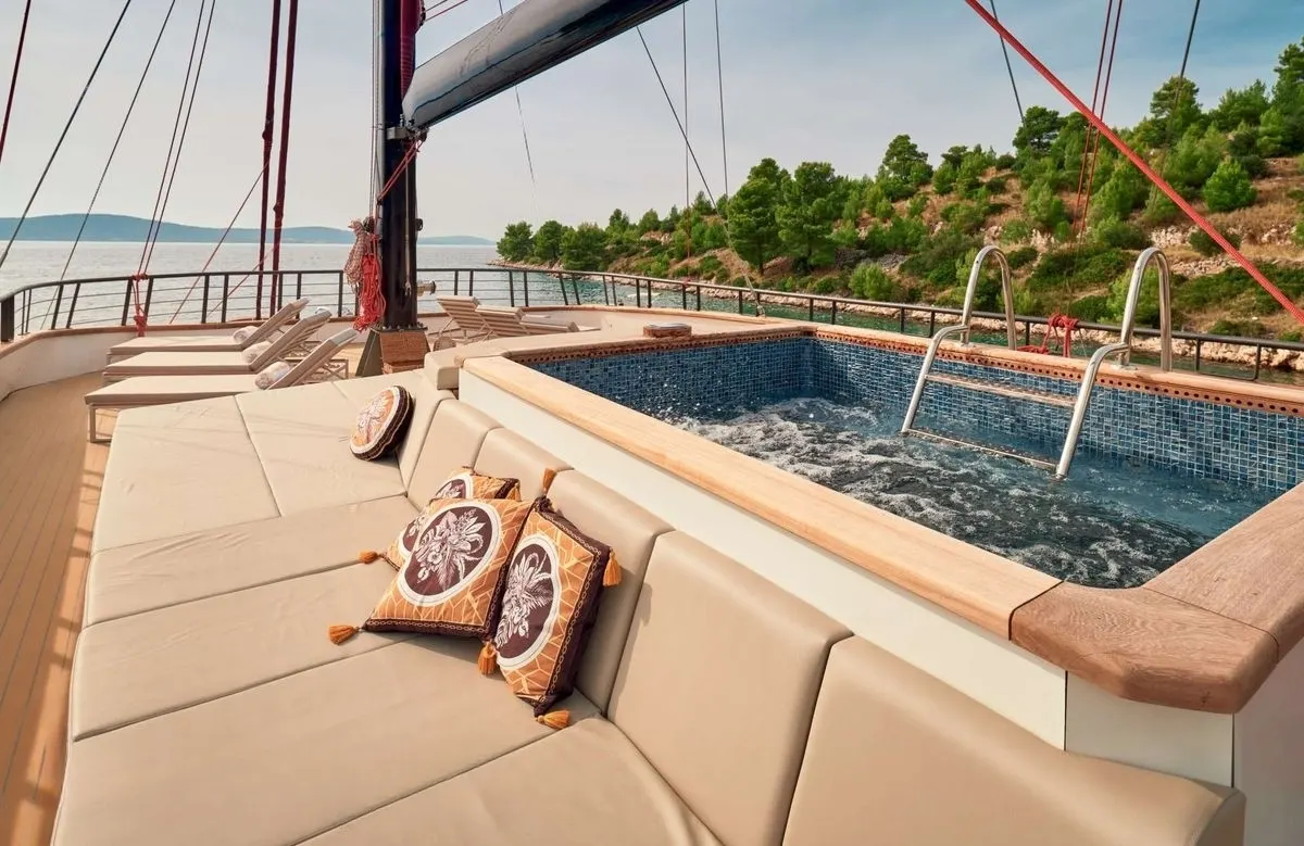 Step into a realm where every detail is crafted for your delight. Anetta’s expansive sun deck offers a serene retreat with inviting sunpads and an outdoor bar perfect for afternoon refreshments or evening cocktails under the stars. As the sun dips below the horizon, the deck jacuzzi becomes a haven of relaxation, while the underwater lights create a magical ambiance for an outdoor cinema experience. The swimming pool beckons for a refreshing dip, and seamless Wi-Fi connectivity ensures you stay connected while indulging in the tranquility of your surroundings. Each space aboard Anetta is designed to enhance your journey, inviting you to unwind and socialize with ease.