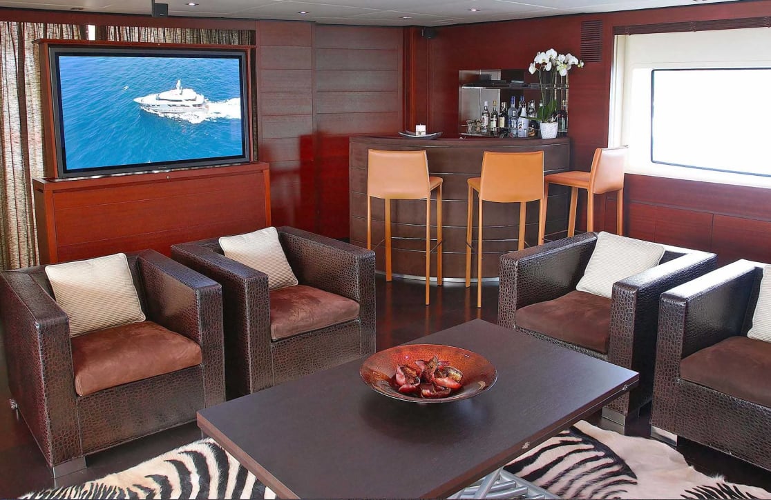 Annamia’s accommodations are a testament to refined living, with five sumptuous staterooms designed to host up to 12 guests. Each room is a haven of tranquility, combining rich mahogany and earl grey marble to create an environment of understated elegance. Awaken to the gentle sway of the yacht and the promise of another day of exploration, as the master suite and its accompanying double and twin cabins offer a versatile living space perfect for families or gatherings with friends.