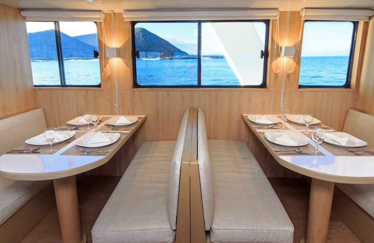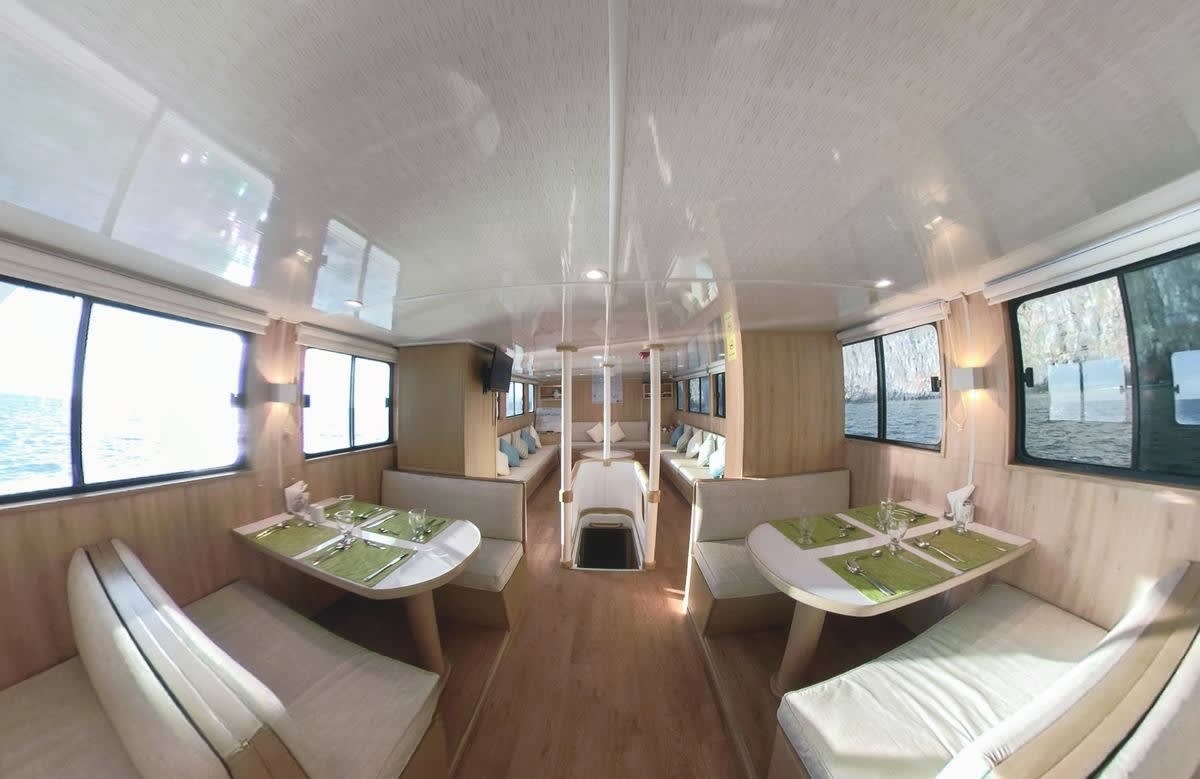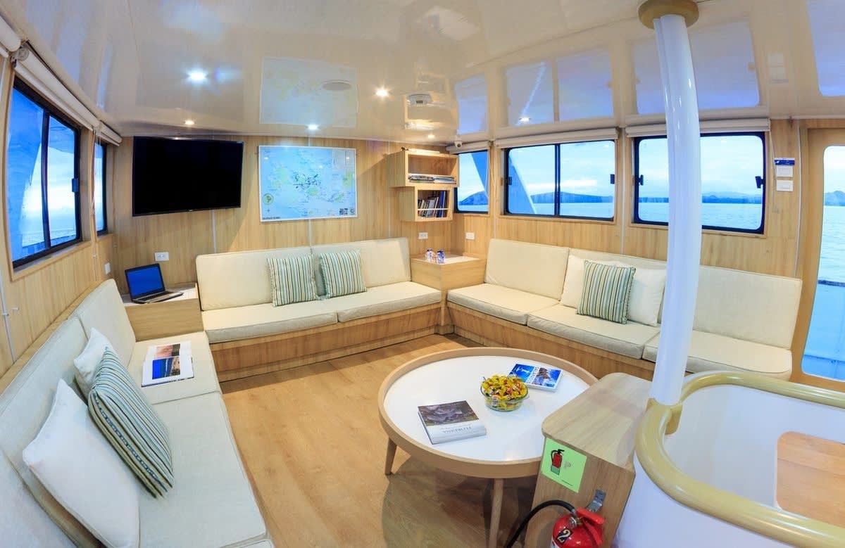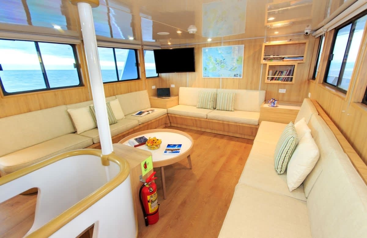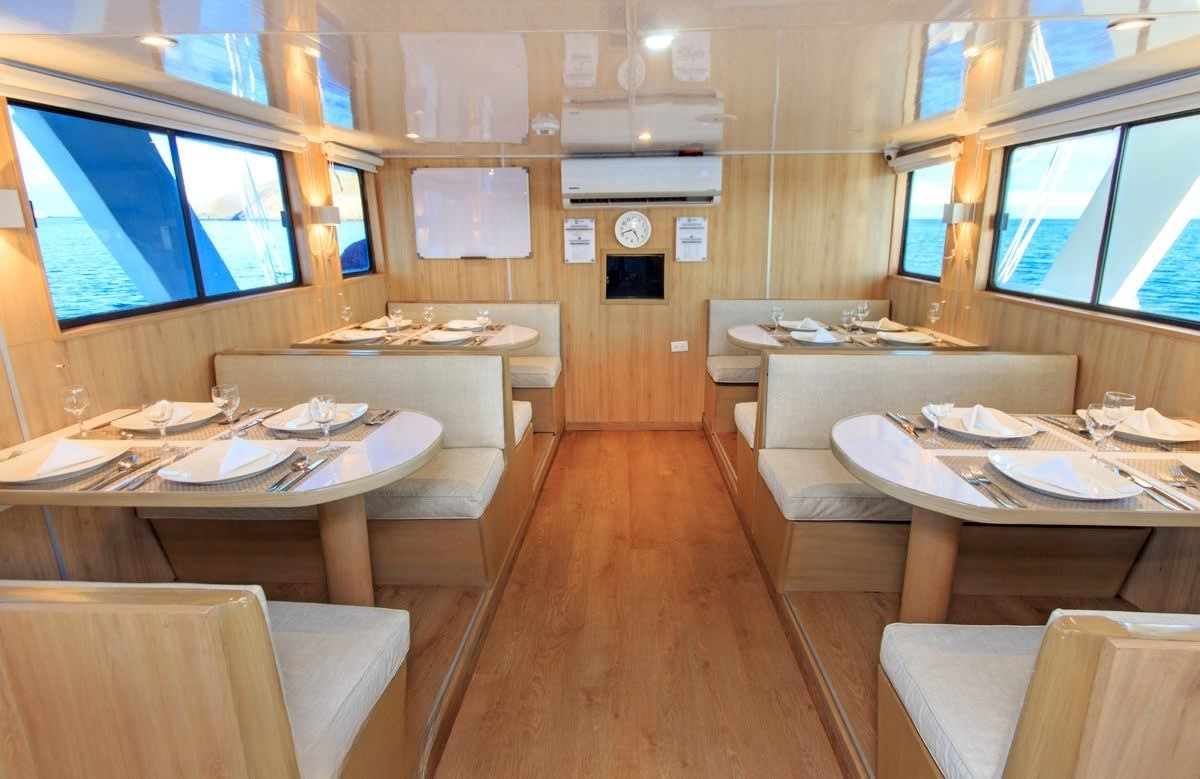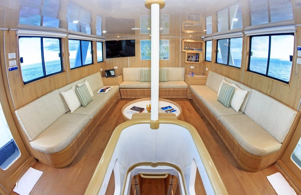 Aboard Aqua, accommodations are as flexible as they are inviting, designed to enhance your sense of comfort and ease. With the capacity to host 24 guests in 12 cabins, each evening promises restful slumber lulled by the gentle rhythm of the ocean. The convertible cabin configuration ensures that your specific group dynamic is effortlessly catered for, whether you’re traveling with family or a group of friends. Wake up to the soft light filtering through your cabin’s windows, ready to indulge in the day’s adventures, both on the water and ashore.