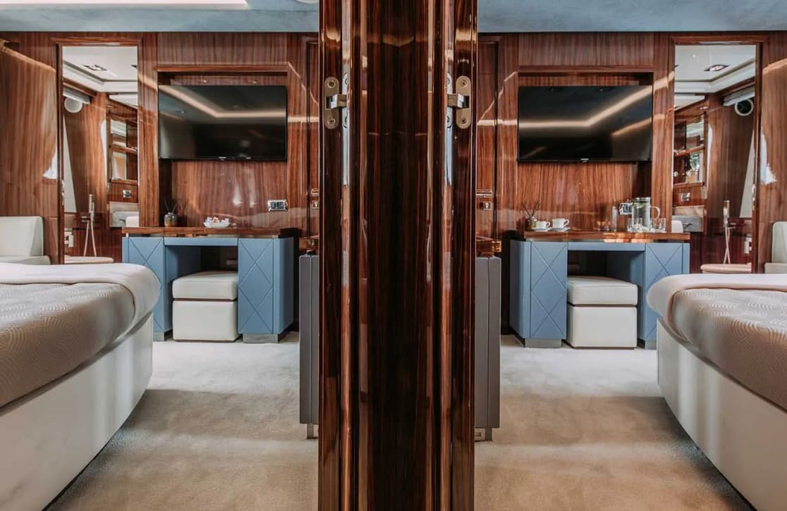 Artemy offers a haven for up to 12 guests, with accommodations that embody the essence of refined comfort. Six exquisitely appointed cabins, including a master suite and a selection of double and twin rooms, provide a restful retreat after a day of exploration. Wake up to the gentle lull of the waves and the promise of another day aboard this elegant vessel. Each cabin is a testament to Italian sophistication, designed with thoughtful attention to detail, ensuring a restful sleep and a serene start to each day on the water.