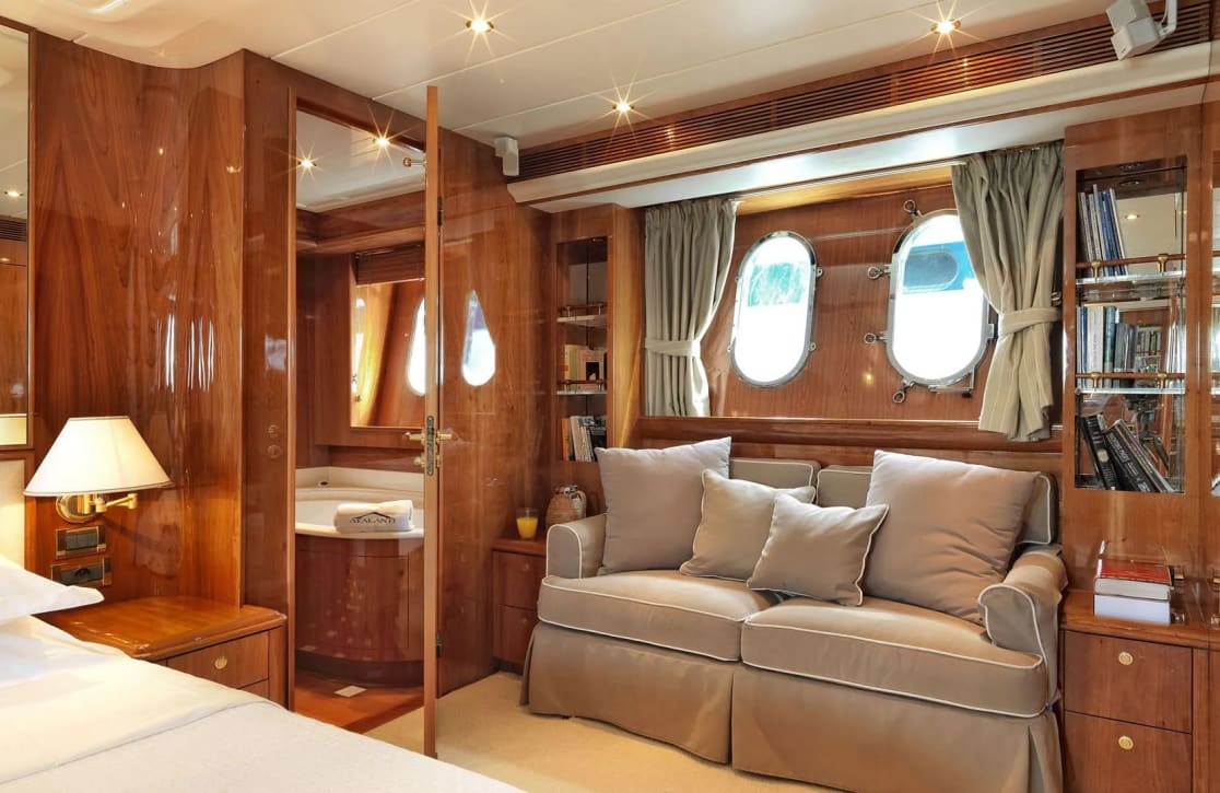 Aboard Atalanti, the days unfold in a symphony of comfort and leisure. As the sun casts its golden glow, recline on the sunpads or immerse yourself in the bubbling serenity of the deck jacuzzi, a refreshing beverage in hand. In the evenings, the yacht transforms into a sanctuary of tranquility, with underwater lights casting a magical hue in the surrounding waters. Stay connected with the world through the yacht’s Wi-Fi, while the air-conditioned interiors offer a retreat from the summer heat, ensuring your comfort is paramount.