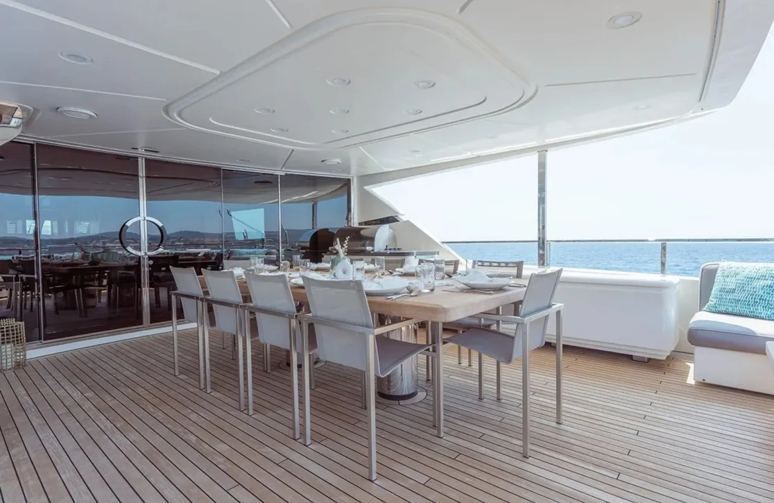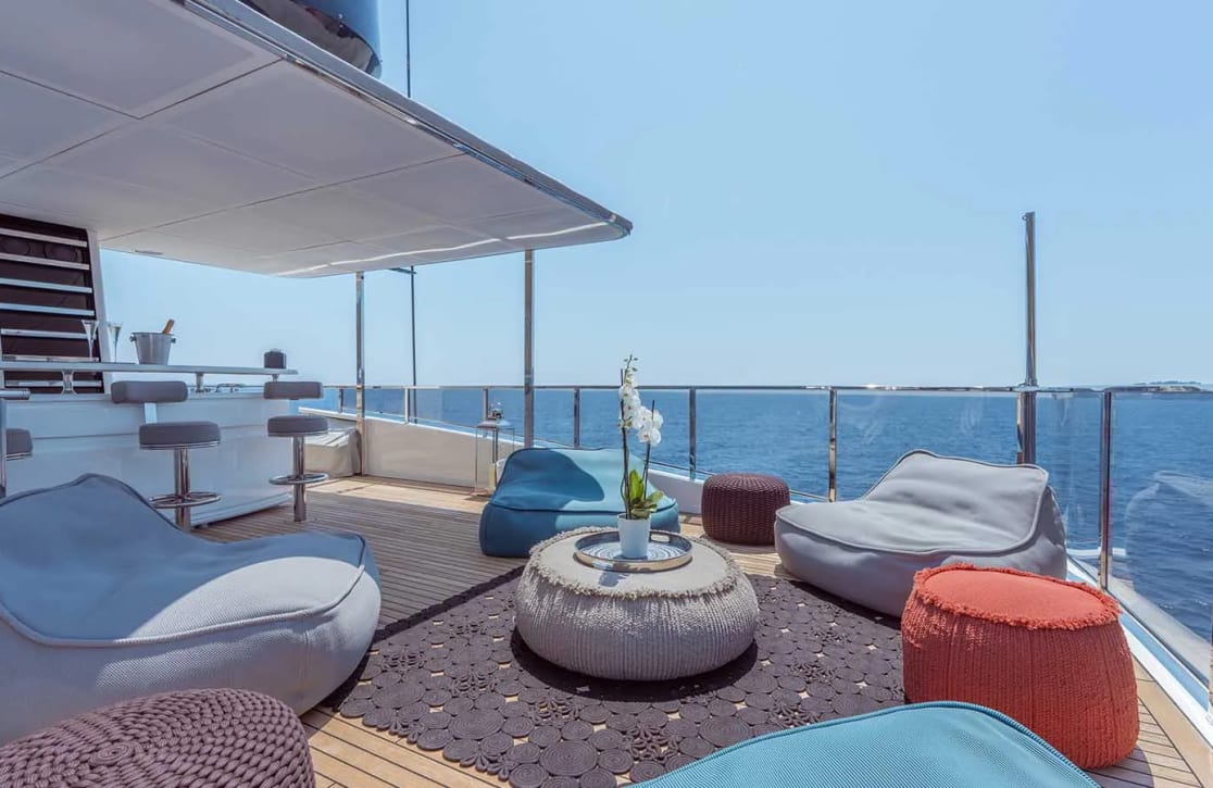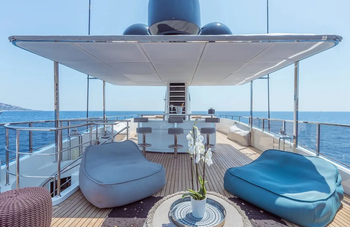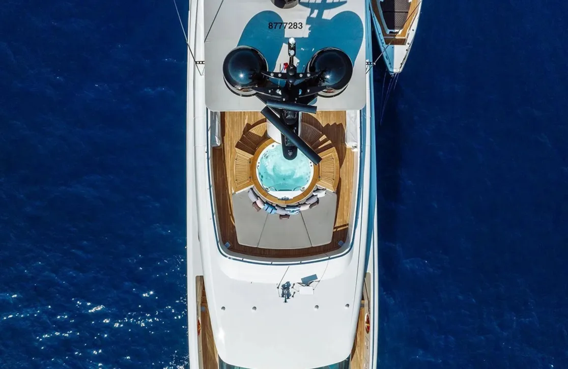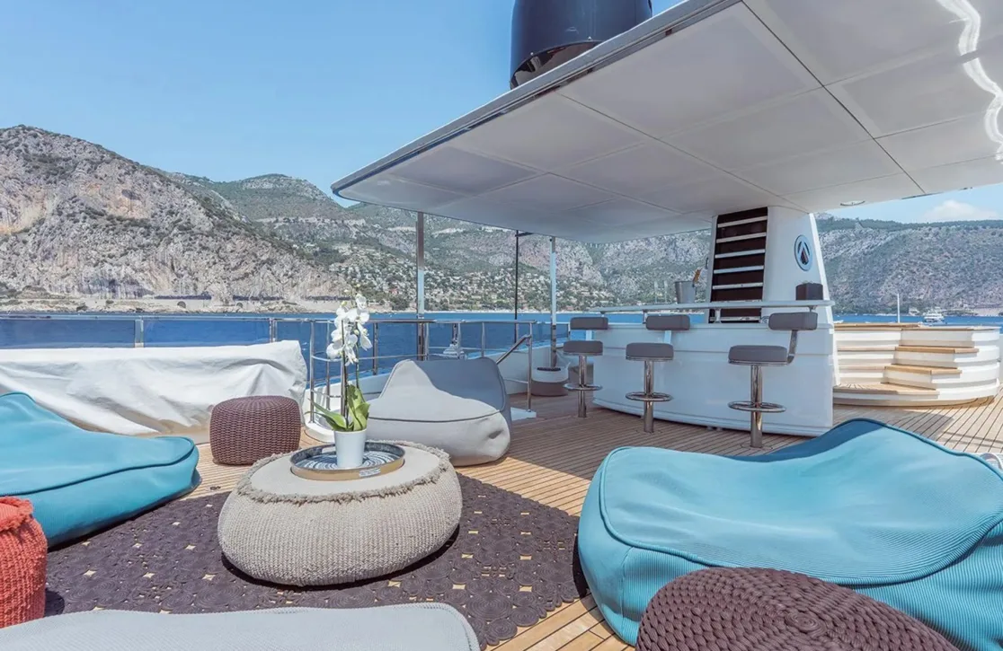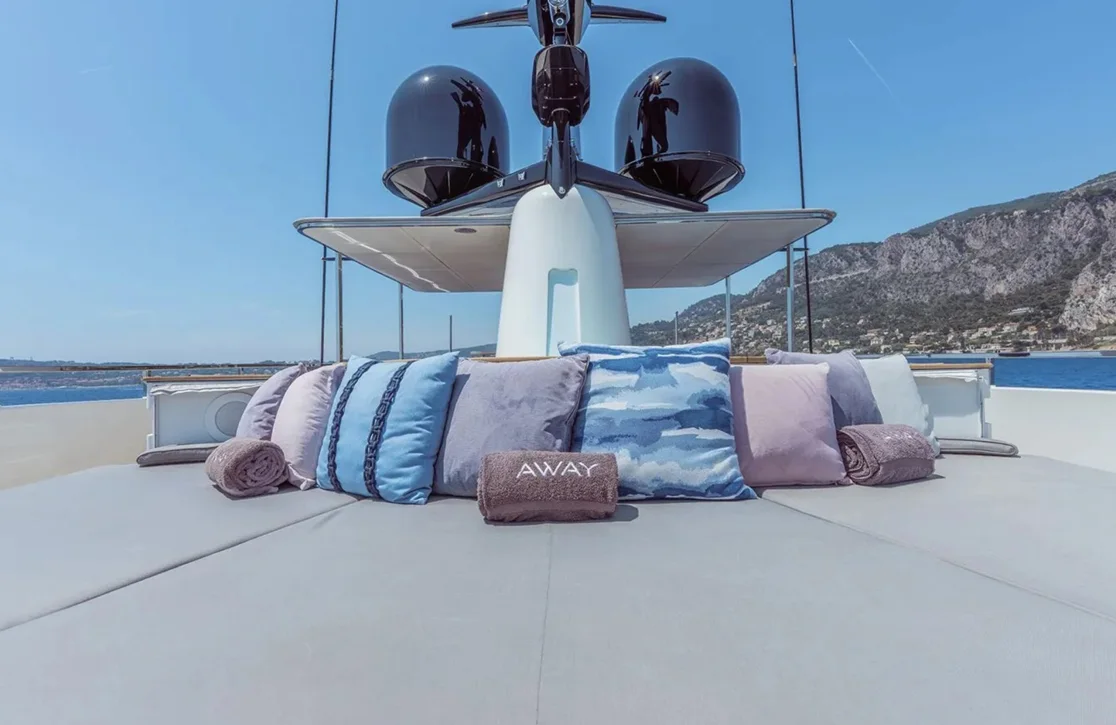 Aboard Away, each moment is a celebration of leisure and comfort. Indulge in the scenic beauty from the deck jacuzzi, where panoramic views are best enjoyed with a refreshing drink in hand, while the sun sets on another perfect day. The yacht’s climate-controlled interiors offer a haven of tranquility, ensuring your utmost relaxation as you sail. Equipped with a Portuguese bridge and sunpads, the sun deck becomes your personal retreat whether you seek quiet solitude or lively conversation. Culinary delights are enhanced with an exterior bar and BBQ, perfect for alfresco dining under the stars, all while staying seamlessly connected with Wi-Fi throughout your journey.