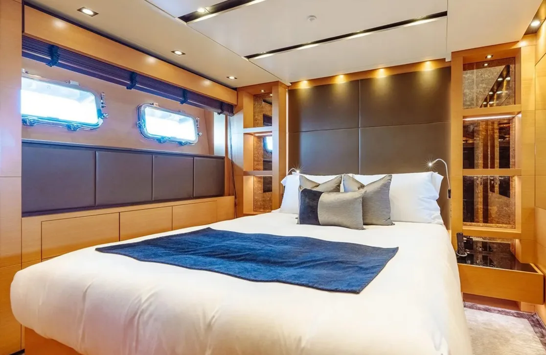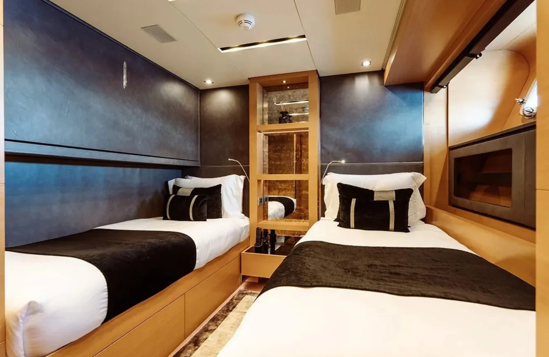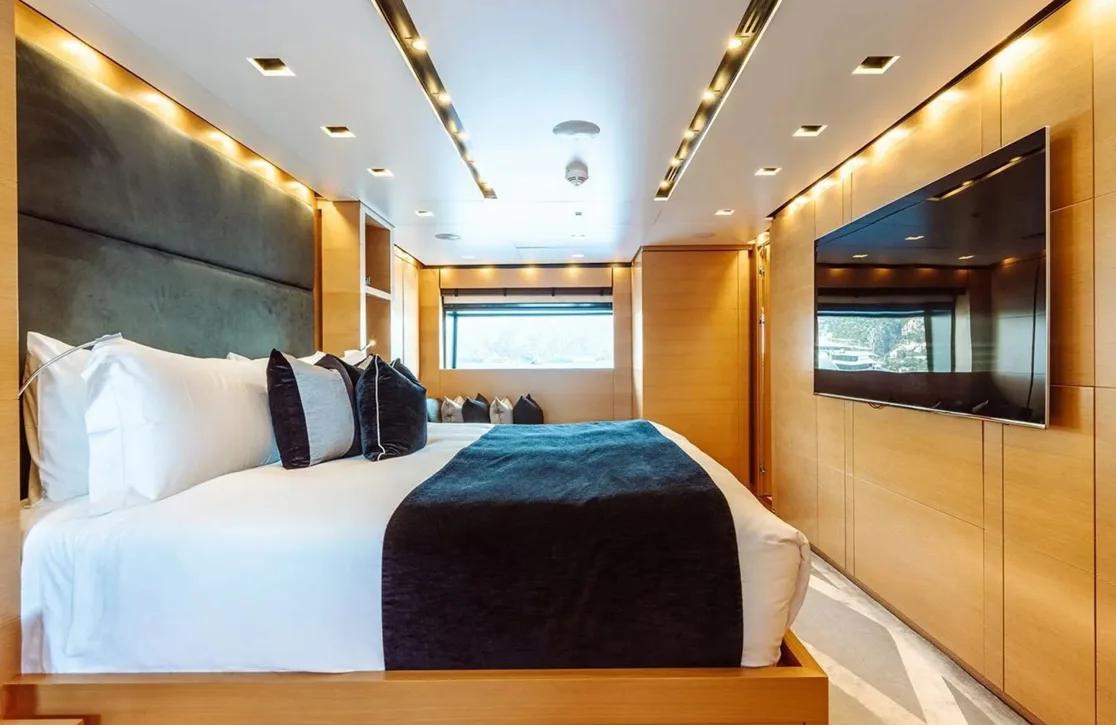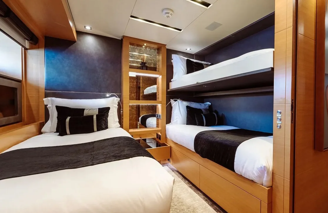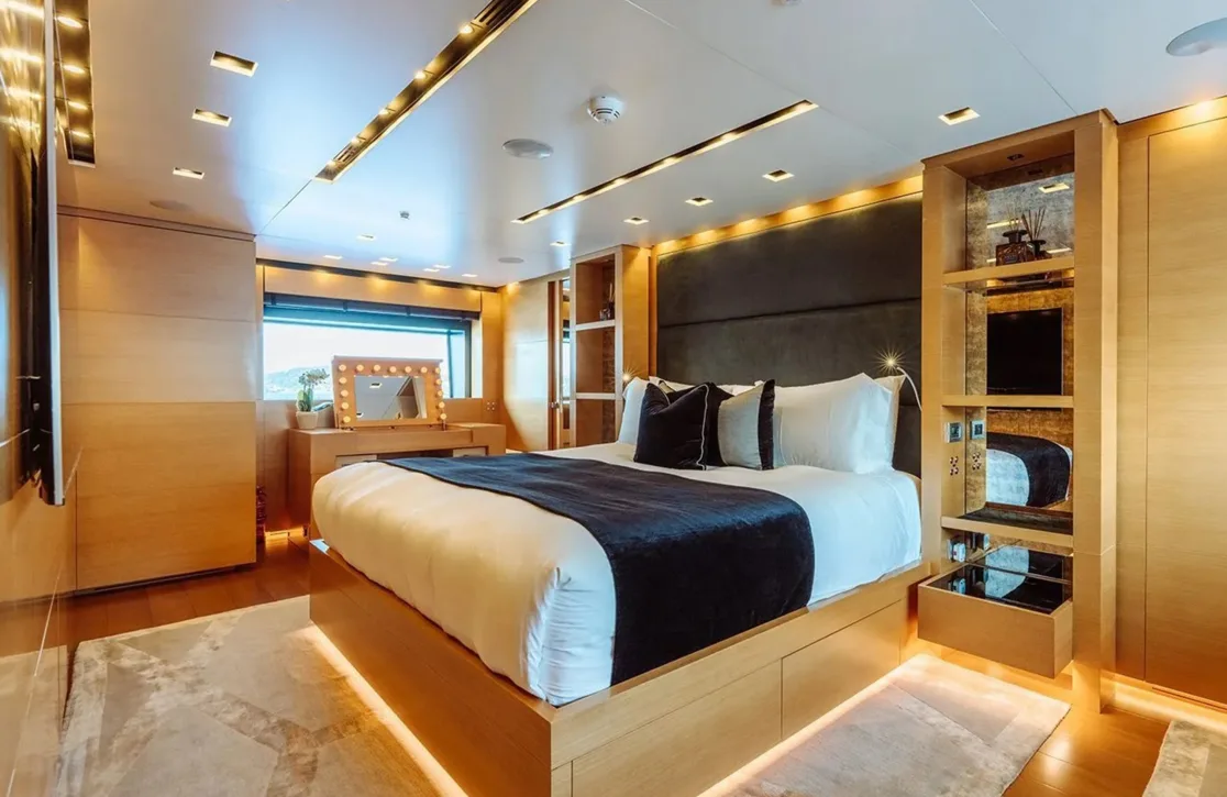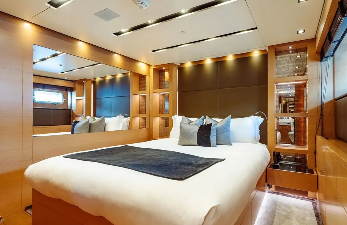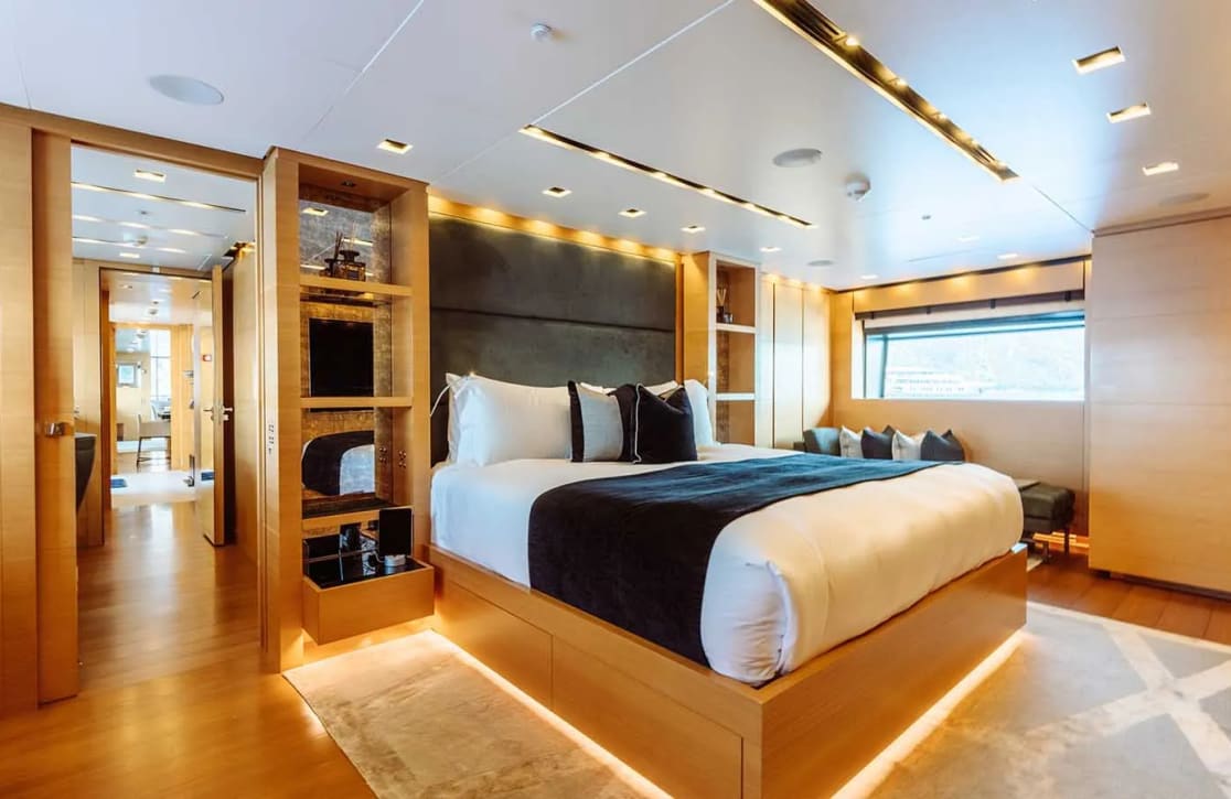 Away welcomes up to 10 guests into her embrace, offering a sanctuary where every cabin is a masterpiece of design and comfort. The master suite, alongside two double and two twin cabins, is tailored to provide restful nights and rejuvenating days. Awaking aboard is a serene experience; the gentle rocking of the yacht and the fresh sea breeze create a unique ambiance that promises relaxation. Each room is meticulously appointed, ensuring the highest standards for a restful retreat after a day of exploration.