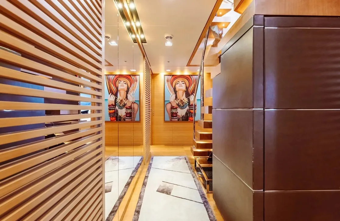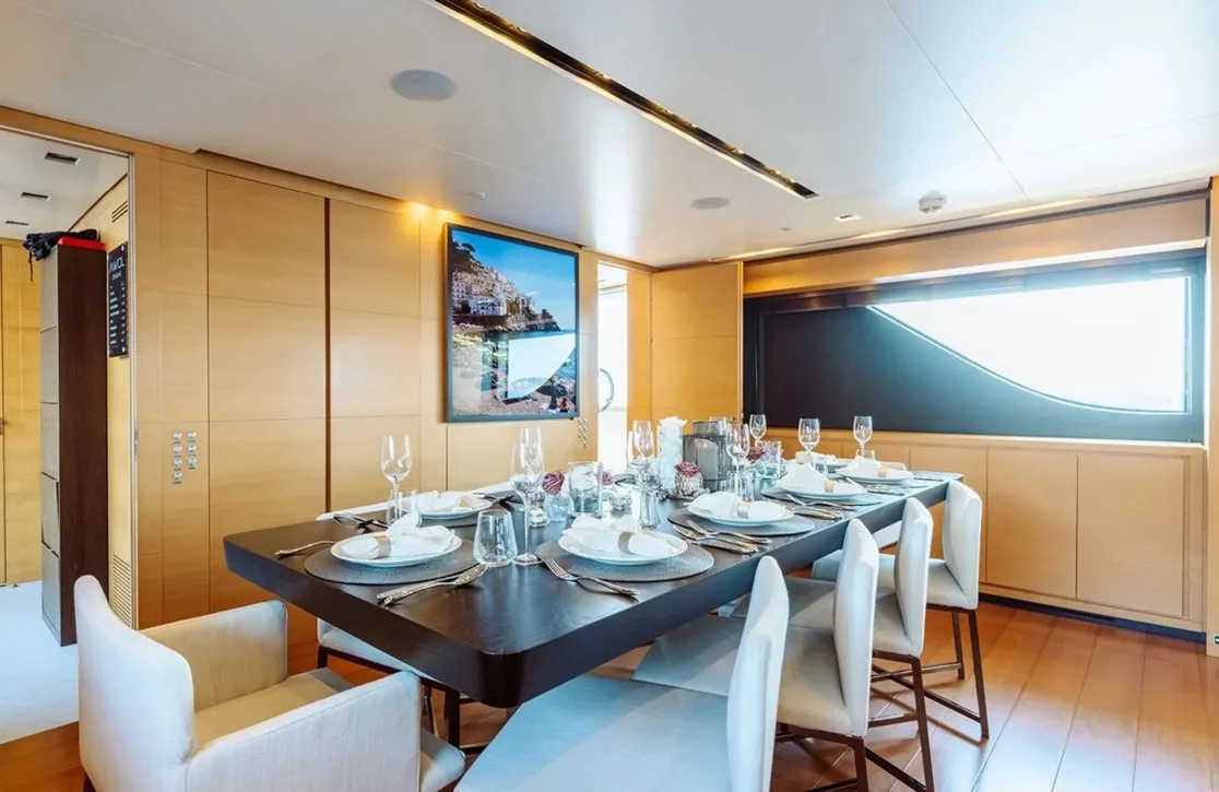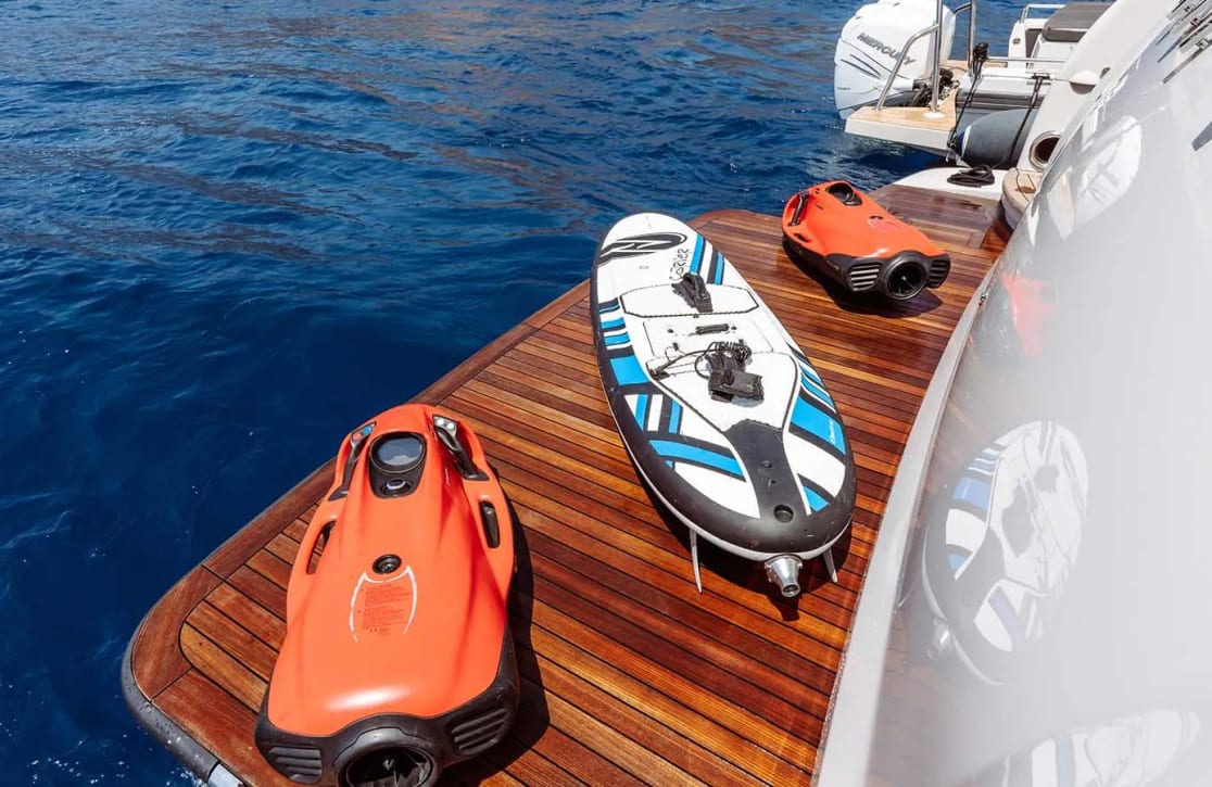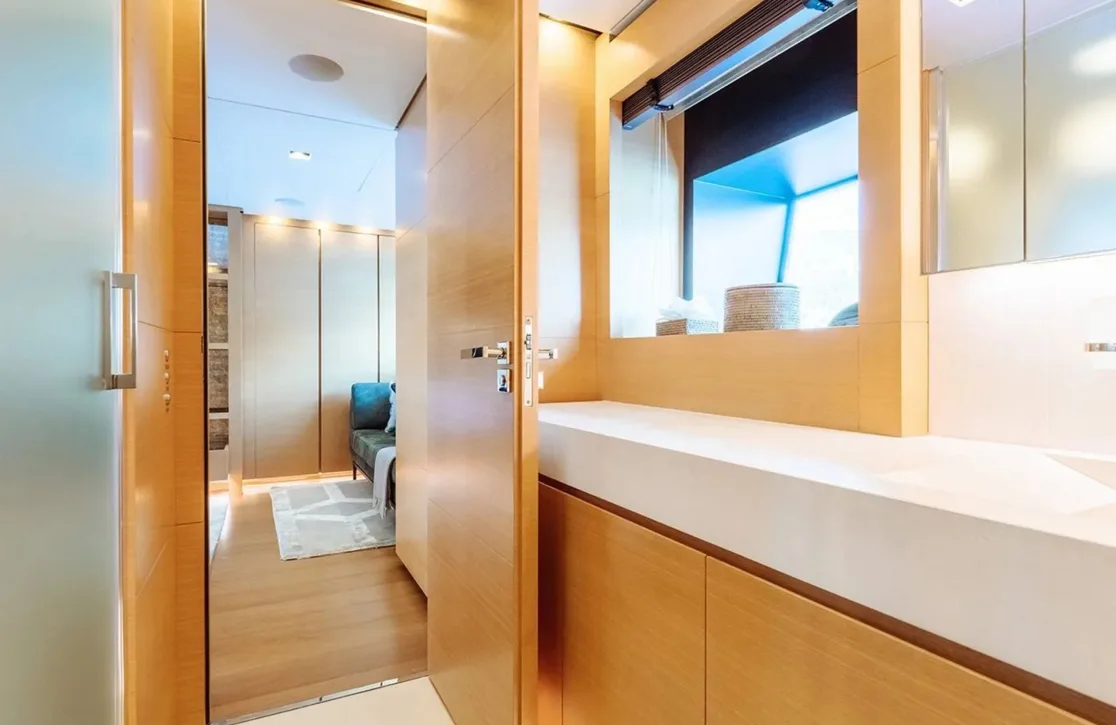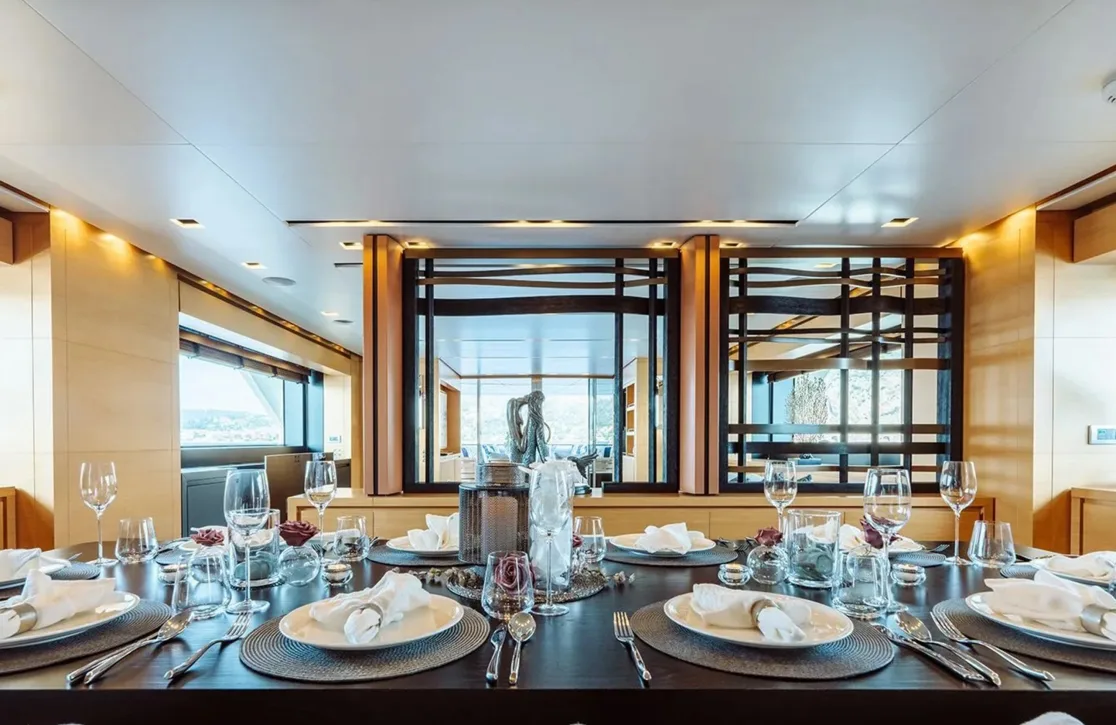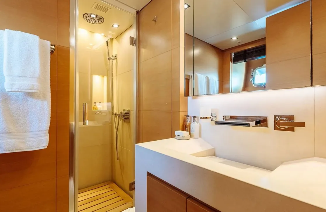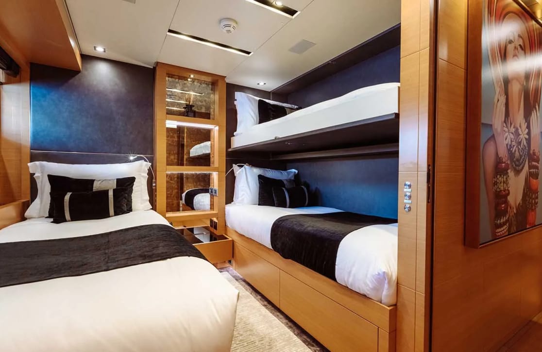 Away welcomes up to 10 guests into her embrace, offering a sanctuary where every cabin is a masterpiece of design and comfort. The master suite, alongside two double and two twin cabins, is tailored to provide restful nights and rejuvenating days. Awaking aboard is a serene experience; the gentle rocking of the yacht and the fresh sea breeze create a unique ambiance that promises relaxation. Each room is meticulously appointed, ensuring the highest standards for a restful retreat after a day of exploration.