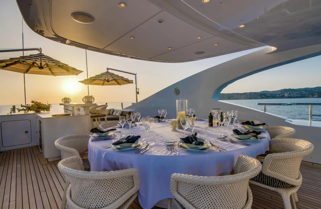 Aziza accommodates up to eight guests in four exquisitely appointed cabins, each a sanctuary of comfort and style. The master suite exudes sophistication, while two double cabins and a twin cabin offer serene retreats for rest and rejuvenation. As the sun rises over the horizon, awaken to the gentle lapping of waves and the promise of another day filled with exploration and relaxation. The carefully curated interiors reflect the finest Italian design, ensuring that every night spent aboard is as restful as it is luxurious.