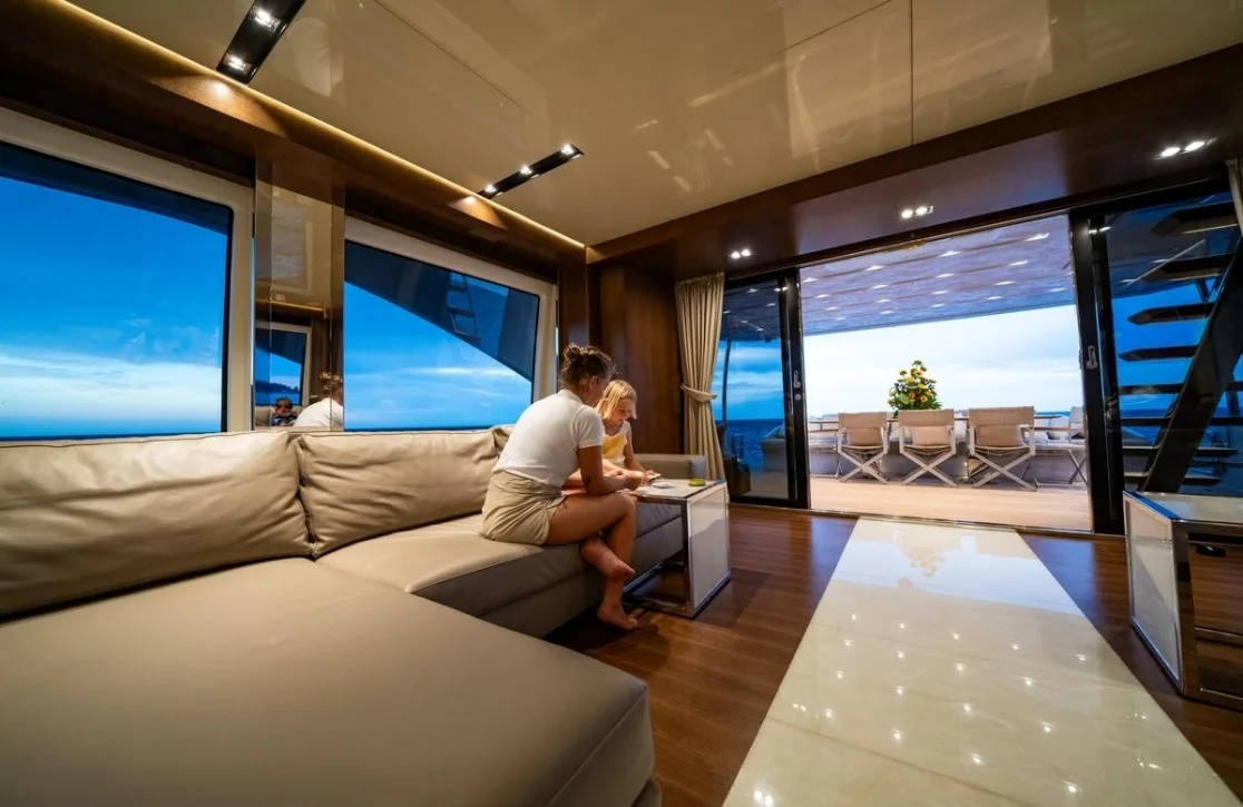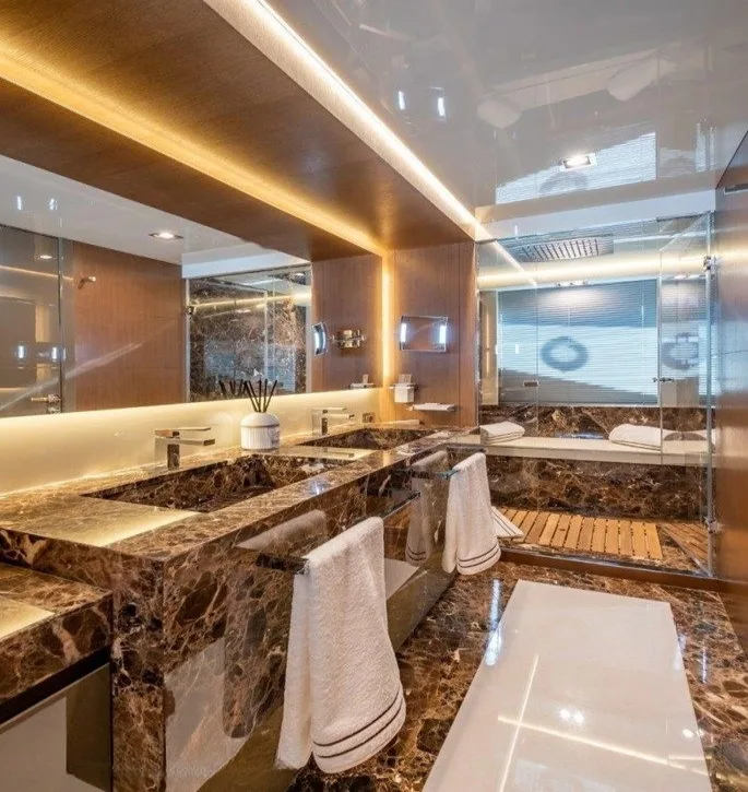 Onboard the Baccarat, life unfurls in a blend of relaxation and sophistication. The sun deck beckons with its inviting sunpads, where afternoons are spent basking under the gentle warmth of the sun, while the deck jacuzzi offers a haven for unwinding with a refreshing drink. The yacht’s stabilizers, both underway and at anchor, ensure a serene experience, allowing you to enjoy the Wi-Fi connectivity to share your journey or simply revel in the tranquility. As the evening descends, gather on the expansive deck spaces, savoring moments of leisure and laughter under starry skies.