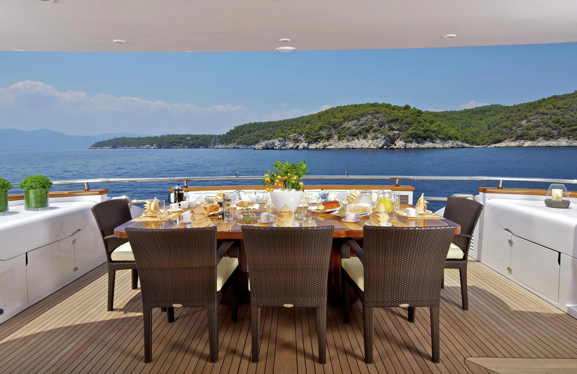 Bianca welcomes up to twelve guests with an inviting layout of five cabins, each embodying sophistication and comfort. The master suite is a sanctuary of relaxation, while two double and two twin cabins provide a versatile setup ideal for families. Thoughtfully designed interiors feature plush bedding, ensuring restful nights cradled by the gentle rocking of the sea. Waking up aboard Bianca means sunlight streaming through elegant portholes and the promise of another day filled with exploration and indulgence.