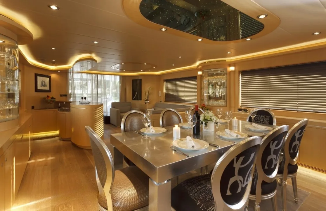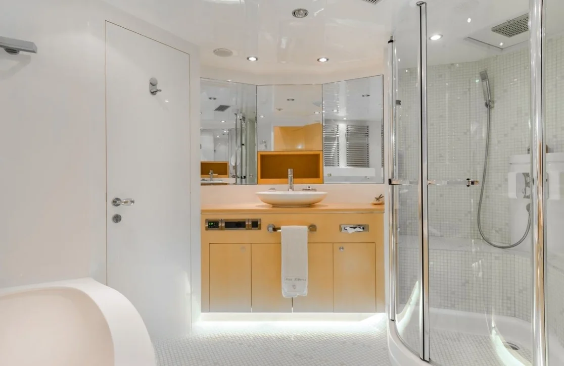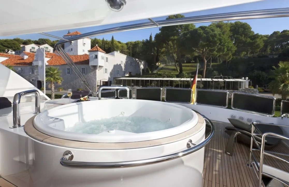 Aboard Conte Alberti, each day unfolds like a dream. Picture yourself reclining on sun-drenched decks or unwinding in the bubbling jacuzzi, enveloped by sweeping ocean vistas. As the day turns to night, the exterior bar becomes a gathering place for evening cocktails under the stars. The thoughtful design ensures a comfortable ambiance throughout, with air conditioning maintaining the perfect climate, enhancing the pleasure of every moment spent on board.